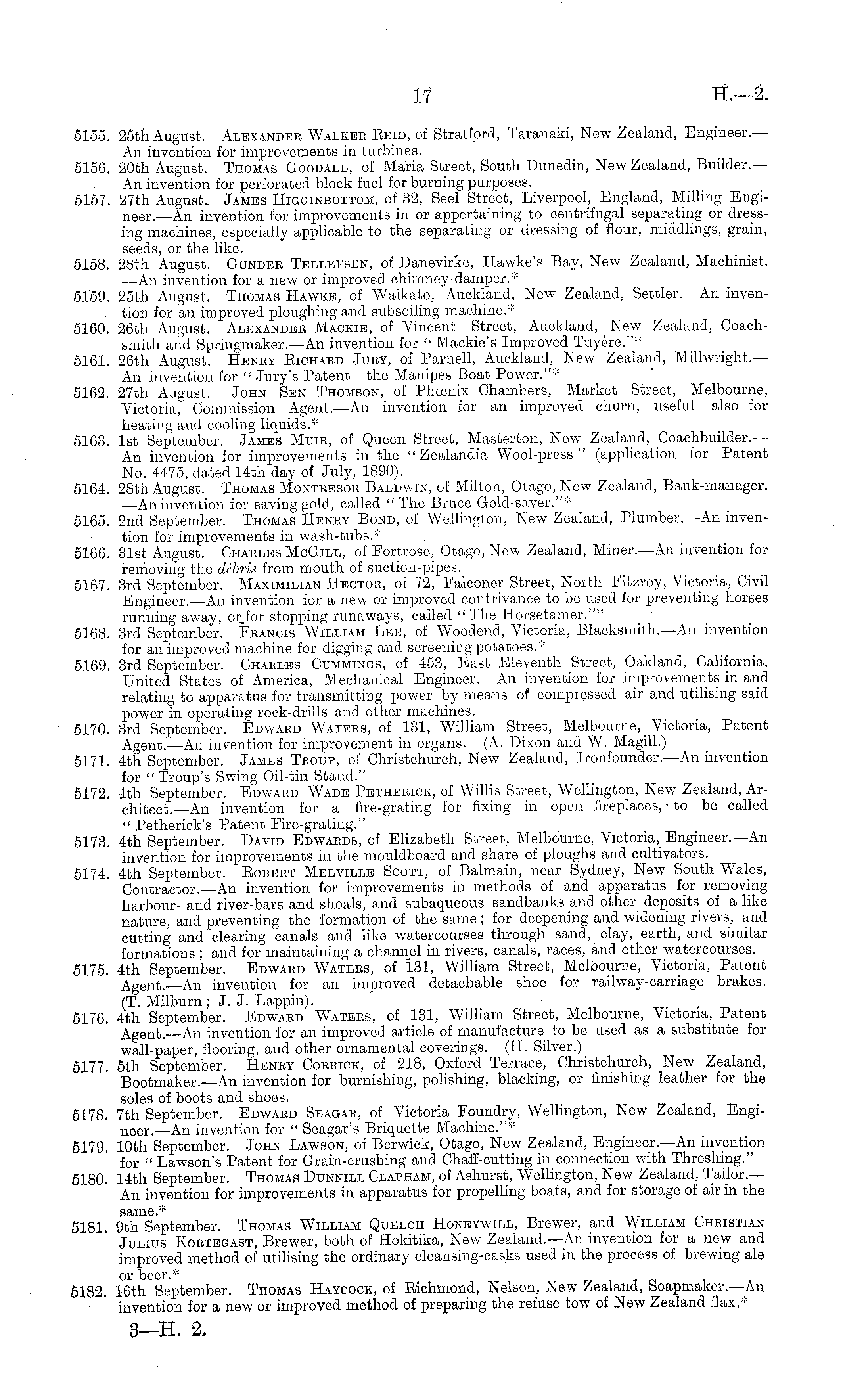 5155. 25th August. Alexander Walkbb Ebid, of Stratford, Taranaki, New Zealand, Engineer.— An invention for improvements in turbines. 5156. 20th August. Thomas Goodall, of Maria Street, South Dunedin, New Zealand, Builder.— An invention for perforated block fuel for burning purposes. 5157. 27th August.. James Higginbottom, of 32, Seel Street, Liverpool, England, Milling Engineer,—An invention for improvements in or appertaining to centrifugal separating or dressing machines, especially applicable to the separating or dressing of flour, middlings, grain, seeds, or the like. 5158. 28th August. Gundee Tellefsen, of Danevirke, Hawke's Bay, New Zealand, Machinist. —An invention for a new or improved chimney damper. :,; 5159. 25th August. Thomas Hawks, of Waikato, Auckland, New Zealand, Settler.—An invention for an improved ploughing and subsoiling machine." 5160. 26th August. Alexander Mackie, of Vincent Street, Auckland, New Zealand, Coachsmith and Springmaker.—An invention for " Mackie's Improved Tuyere."* 5161. 26th August. Henry Bichabd Juey, of Parnell, Auckland, New Zealand, Millwright.— An invention for " Jury's Patent—the Manipes Boat Power."* 5162. 27th August. John Sen Thomson, of Phoenix Chambers, Market Street, Melbourne, Victoria, Commission Agent.—An invention for an improved churn, useful also for heating and cooling liquids.* 5163. Ist September. James Muib, of Queen Street, Masterton, New Zealand, Coachbuilder. — An invention for improvements in the " Zealandia Wool-press" (application for Patent No. 4475, dated 14th day of July, 1890). 5164. 28th August. Thomas Montbesob Baldwin, of Milton, Otago, New Zealand, Bank-manager. —An invention for saving gold, called " The Bruce Gold-saver."* 5165. 2nd September. Thomas Henby Bond, of Wellington, New Zealand, Plumber. —An invention for improvements in wash-tubs.* 5166. 31st August. Chables McGill, of Fortrose, Otago, New Zealand, Miner.—An invention for removing the debris from mouth of suction-pipes. 5167. 3rd September. Maximilian Hectoe, of 72, Falconer Street, North Fitzroy, Victoria, Civil Engineer.—An invention for a new or improved contrivance to be used for preventing horses running away, or.for stopping runaways, called "The Horsetamer."* 5168. 3rd September. Francis William Lee, of Woodend, Victoria, Blacksmith.—An invention for an improved machine for digging and screening potatoes. ;,: 5169. 3rd September. Chakles Cummings, of 453, East Eleventh Street, Oakland, California, United States of America, Mechanical Engineer.—An invention for improvements in and relating to apparatus for transmitting power by means of compressed air and utilising said power in operating rock-drills and other machines. 5170. 3rd September. Edward Watebs, of 131, William Street, Melbourne, _ Victoria, Patent Agent.—An invention for improvement in organs. (A. Dixon and W. Magill.) 5171. 4th September. James Tboup, of Christchurch, New Zealand, Ironfounder.—An invention for " Troup's Swing Oil-tin Stand." 5172. 4th September. Edwaed Wade Pethebick, of "Willis Street, Wellington, New Zealand, Architect.—An invention for a fire-grating for fixing in open fireplaces, to be called " Petherick's Patent Fire-grating." 5173. 4th September. David Edwabds, of Elizabeth Street, Melbourne, Victoria,_ Engineer.—An invention for improvements in the mouldboard and share of ploughs and cultivators. 5174. 4th September. Eobeet Melville Scott, of Balmain, near Sydney, New South Wales, Contractor.—An invention for improvements in methods of and apparatus for removing harbour- and river-bars and shoals, and subaqueous sandbanks and other deposits of a like nature, and preventing the formation of the same; for deepening and widening rivers, and cutting and clearing canals and like watercourses through sand, clay, earth, and similar formations; and for maintaining a channel in rivers, canals, races, and other watercourses. 5175. 4th September. Edwaed Watees, of 131, William Street, Melbourne, Victoria, Patent Agent.—An invention for an improved detachable shoe for railway-carriage brakes. (T. Milburn ; J. J. Lappin). 5176. 4th September. Edwaed Watebs, of 131, William Street, Melbourne, Victoria, Patent Agent. An invention for an improved article of manufacture to be used as a substitute for wall-paper, flooring, and other ornamental coverings. (H. Silver.) 5177. sth September. Henby Coebick, of 218, Oxford Terrace, Christchurch, New Zealand, Bootmaker.—An invention for burnishing, polishing, blacking, or finishing leather for the soles of boots and shoes. 5178. 7th September. Edwabd Seag-ae, of Victoria Foundry, Wellington, New Zealand, Engineer.—An invention for " Seagar's Briquette Machine." :,: 5179. 10th September. John Lawson, of Berwick, Otago, New Zealand, Engineer.—An invention for " Lawson's Patent for Grain-crushing and Chaff-cutting in connection with Threshing." 6180. 14th September. Thomas Dunnill Clapham, of Ashurst, Wellington, New Zealand, Tailor.— An invention for improvements in apparatus for propelling boats, and for storage of air in the same.* 5181. 9th September. Thomas William Quelch Honeywill, Brewer, and William Christian Julius Koetegast, Brewer, both of Hokitika, New Zealand.—An invention for a new and improved method of utilising the ordinary cleansing-casks used in the process of brewing ale or D g Gi" ' ,: 5182. 16th September. Thomas Haycock, of Bichmond, Nelson, New Zealand, Soapmaker.—An invention for a new or improved method of preparing the refuse tow of New Zealand flax.*