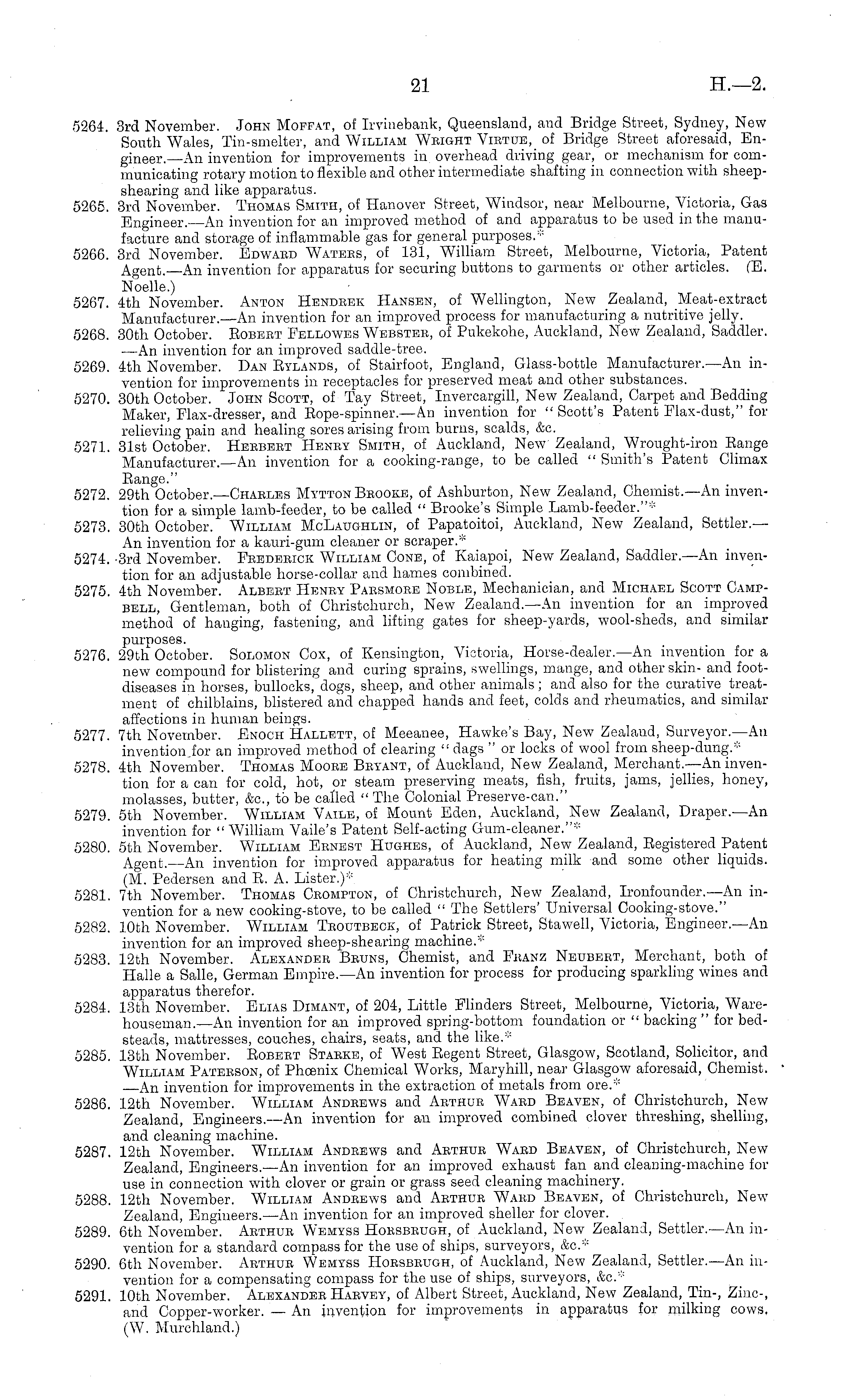 5264. 3rd November. John Moffat, of Irvinebank, Queensland, and Bridge Street, Sydney, New South Wales, Tin-smelter, and William Weight Vietue, of Bridge Street aforesaid, Engineer.—An invention for improvements in overhead driving gear, or mechanism for communicating rotary motion to flexible and other intermediate shafting in connection with sheepshearing and like apparatus. 5265. 3rd November. Thomas Smith, of Hanover Street, Windsor, near Melbourne, Victoria, Gas Engineer. An invention for an improved method of and apparatus to be used in the manufacture and storage of inflammable gas for general purposes.* 5266. 3rd November. Edwaed Watees, of 131, William. Street, Melbourne, Victoria, Patent Agent.—An invention for apparatus for securing buttons to garments or other articles. (E. Noelle.) 5267. 4th November. Anton Hendeek Hansen, of Wellington, New Zealand, Meat-extract Manufacturer. —An invention for an improved process for manufacturing a nutritive jelly. 5268. 30th October. Eobeet Fellowes Webstee, of Pnkekohe, Auckland, New Zealand, Saddler. —An invention for an improved saddle-tree. 5269. 4th November. Dan Eylands, of Stairfoot, England, Glass-bottle Manufacturer.—An invention for improvements in receptacles for preserved meat and other substances. 5270. 30th October. John Scott, of Tay Street, Invercargill, New Zealand, Carpet and Bedding Maker, Flax-dresser, and Rope-spinner. —An invention for " Scott's Patent Flax-dust," for relieving pain and healing sores arising from burns, scalds, &o. 5271. 31st October. Heebert Henry Smith, of Auckland, New Zealand, Wrought-iron Eange Manufacturer. —An invention for a cooking-range, to be called " Smith's Patent Climax Eange." 5272. 29th October.—Charles Mytton Brooke, of Ashburton, New Zealand, Chemist.—An invention for a simple lamb-feeder, to be called " Brooke's Simple Lamb-feeder."* 5273. 30th October. William McLaughlin, of Papatoitoi, Auckland, New Zealand, Settler.— An invention for a kauri-gum cleaner or scraper.* 5274. -3rd November. Frederick William Cone, of Kaiapoi, New Zealand, Saddler.—An invention for an adjustable horse-collar and hames combined. 5275. 4th November. Albert Henry Parsmore Noble, Mechanician, and Michael Scott Campbell, Gentleman, both of Christchurch, New Zealand. —An invention for an improved method of hanging, fastening, and lifting gates for sheep-yards, wool-sheds, and similar purposes. 5276. 29th October. Solomon Cox, of Kensington, Victoria, Horse-dealer.—An invention for a new compound for blistering and curing sprains, swellings, mange, and other skin-and footdiseases in horses, bullocks, dogs, sheep, and other animals; and also for the curative treatment of chilblains, blistered and chapped hands and feet, colds and rheumatics, and similar affections in human beings. 5277. 7th November. Enoch Hallett, of Meeanee, Hawke's Bay, New Zealand, Surveyor.—An invention for an improved method of clearing " dags " or locks of wool from sheep-dung.* 5278. 4th November. Thomas Moore Bryant, of Auckland, New Zealand, Merchant.—An invention for a can for cold, hot, or steam preserving meats, fish, fruits, jams, jellies, honey, molasses, butter, &c, to be called " The Colonial Preserve-can." 5279. sth November. William Vaile, of Mount Eden, Auckland, New Zealand, Draper.—An invention for "William Vaile's Patent Self-acting Gum-cleaner."* 5280. sth November. William Ernest Hughes, of Auckland, New Zealand, Registered Patent Agent. An invention for improved apparatus for heating milk and some other liquids. (M. Pedersen and E. A. Lister.)" 5281. 7th November. Thomas Ceompton, of Christchurch, New Zealand, Ironfounder.— An invention for a new cooking-stove, to be called " The Settlers' Universal Cooking-stove." 5282. 10th November. William Teoutbeck, of Patrick Street, Stawell, Victoria, Engineer.—An invention for an improved sheep-shearing machine.* 5283. 12th November. Alexandee Bruns, Chemist, and Franz Neubeet, Merchant, both of Halle a Salle, German Empire.—An invention for process for producing sparkling wines and apparatus therefor. 5284. 13th November. Elias Dimant, of 204, Little Flinders Street, Melbourne, Victoria, Warehouseman. —An invention for an improved spring-bottom foundation or " backing " for bedsteads, mattresses, couches, chairs, seats, and the like.* 5285. 13th November. Eobeet Staeke, of West Regent Street, Glasgow, Scotland, Solicitor, and William Pateeson, of Phoenix Chemical Works, Maryhill, near Glasgow aforesaid, Chemist. —An invention for improvements in the extraction of metals from ore.* 5286. 12th November. William Andeews and Aethur Ward Beaven, of Christchurch, New Zealand, Engineers. —An invention for an improved combined clover threshing, shelling, and cleaning machine. 5287. 12th November. William Andrews and Aethur Waed Beaven, of Christchurch, New Zealand, Engineers. —An invention for an improved exhaust fan and cleaning-machine for use in connection with clover or grain or grass seed cleaning machinery. 5288. 12th November. William Andeews and Aethue Ward Beaven, of Christchurch, New Zealand, Engineers. —An invention for an improved sheller for clover. 5289. 6th November. Aethue Wemyss Horsbrugh, of Auckland, New Zealand, Settler.—An invention for a standard compass for the use of ships, surveyors, &c* 5290. 6th November. Arthur Wemyss Hoesbrugh, of Auckland, New Zealand, Settler.—An invention for a compensating compass for the use of ships, surveyors, &c* 5291. 10th November. Alexander Harvey, of Albert Street, Auckland, New Zealand, Tin-, Zinc-, and Copper-worker. —An invention for improvements in apparatus for milking cows, (W. Murchland.)