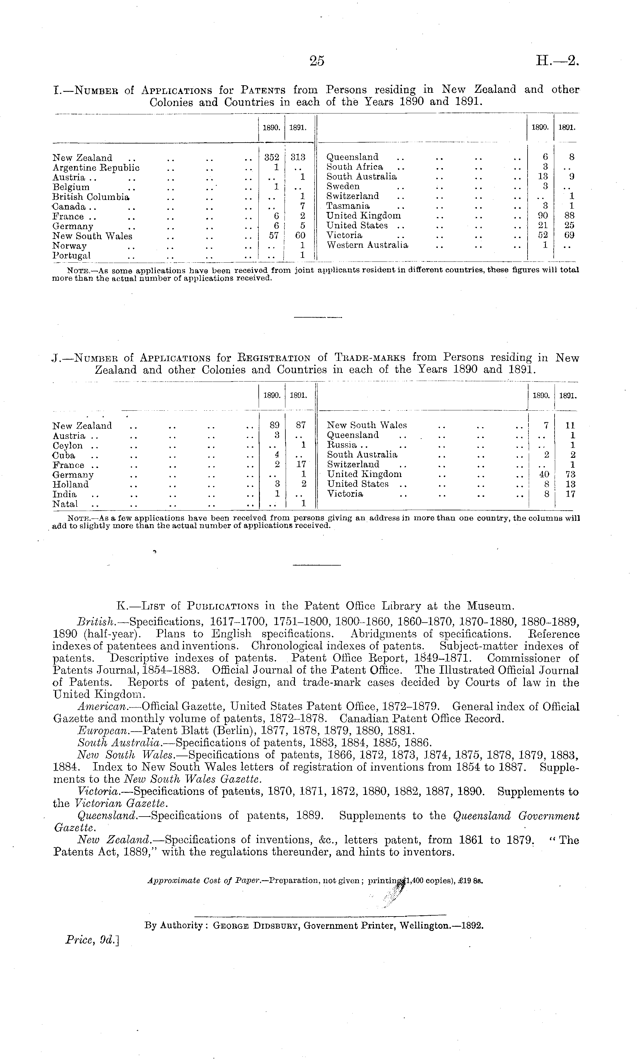 X.—List of Publications in the Patent Office Library at the Museum. British.— Specifications, 1617-1700, 1751-1800, 1800-1860, 1860-1870, 1870-1880, 1880-1889, 1890 (half-year). Plans to English specifications. Abridgments of specifications. Eeference indexes of patentees and inventions. Chronological indexes of patents. Subject-matter indexes of patents. Descriptive indexes of patents. Patent Office Report, 1849-1871. Commissioner of Patents Journal, 1854-1883. Official Journal of the Patent Office. The Illustrated Official Journal of Patents. Reports of patent, design, and trade-mark cases decided by Courts of law in the United Kingdom. American. —Official Gazette, United States Patent Office, 1872-1879. General index of Official Gazette and monthly volume of patents, 1872-1878. Canadian Patent Office Record. Eivropean.—P&tent Blatt (Berlin), 1877, 1878, 1879, 1880, 1881. South Australia. —Specifications of patents, 1883, 1884, 1885, 1886. New South Wales.— Specifications of patents, 1866, 1872, 1873, 1874, 1875, 1878, 1879, 1883, 1884. Index to New South Wales letters of registration of inventions from 1854 to 1887. Supplements to the New South Wales Gazette. Victoria.— Specifications of patents, 1870, 1871, 1872, 1880, 1882, 1887, 1890. Supplements to the Victorian Gazette. Queensland. — Specifications of patents, 1889. Supplements to the Queensland Government Gazette. New Zealand. —Specifications of inventions, &c, letters patent, from 1861 to 1879. " The Patents Act, 1889," with the regulations thereunder, and hints to inventors. Approximate Cost of Paper.- —Preparation, not given ; printingil,4oo copies), £1 ( 3 Bs.