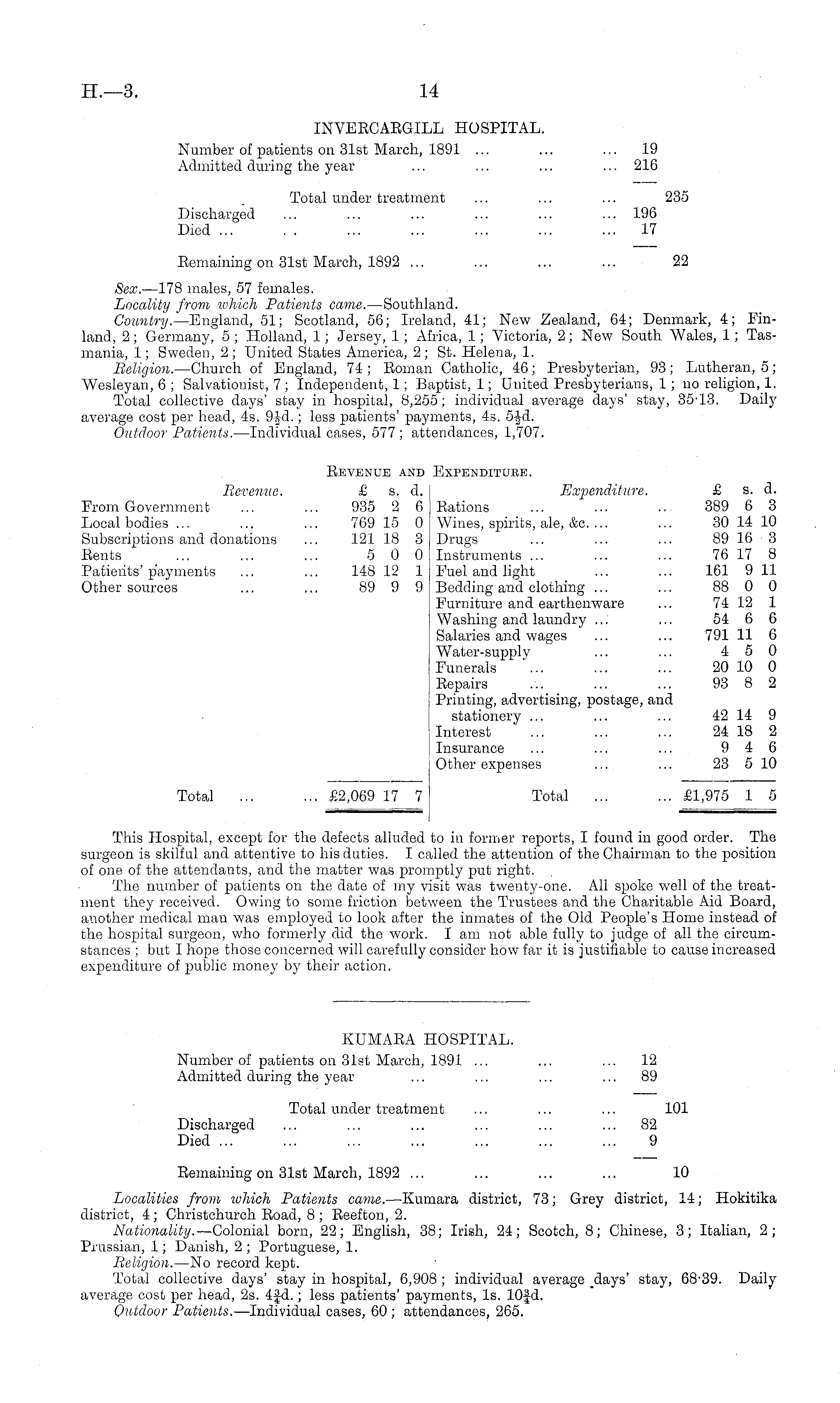 INVEECAEGILL HOSPITAL. Number of patients on 31st March, 1891 ... ... ... 19 Admitted during the year ... ... ... ... 216 Total under treatment ... ... ... 235 Discharged ... ... ... ... ... ... 196 Died ... . . ... ... ... ... ... 17 Eemaining on 31st March, 1892 ... ... ... ... 22 Sex. —l7B males, 57 females. Locality from which Patients came. —Southland. Country. —England, 51; Scotland, 56; Ireland, 41; New Zealand, 64; Denmark, 4; Finland, 2; Germany, 5 ; Holland, 1; Jersey, 1; Africa, 1; Victoria, 2; New South Wales, 1; Tasmania, 1; Sweden, 2; United States America, 2; St. Helena, 1. Beligion. —Church of England, 74; Eoman Catholic, 46; Presbyterian, 93; Lutheran, 5; Wesleyan, 6 ; Salvationist, 7 ; Independent, 1; Baptist, 1; United Presbyterians, 1 ; no religion, 1. Total collective days' stay in hospital, 8,255; individual average days' stay, 35-13. Daily average cost per head, 4s. 9-J-d.; less patients' payments, 4s. 5-J-d. Outdoor Patients. —Individual cases, 577; attendances, 1,707. Be venue and Expenditure. Bevenue. £ s. cl. j Expenditure. £ s. d. From Government ... ... 935 2 6 Eations ... ... ... 389 6 3 Local bodies ... ... ... 769 15 0 Wines, spirits, ale, &c. ... ... 30 14 10 Subscriptions and donations ... 121 18 3 Drugs ... ... ... 89 16 3 Bents ... ... ... 5 0 0 ! Instruments ... ... ... 76 17 8 Patients'payments ... ... 148 12 1 Fuel and light ... ... 161 9 11 Other sources ... ~, 8999 Bedding and clothing ... ... 8800 Furniture and earthenware ... 74121 Washing and laundry ... ... 5466 Salaries and wages ... ... 791 11 6 Water-supply ... ... 4 5 0 Funerals "... ... ... 20 10 0 Eepairs ... ... ... 93 8 2 Printing, advertising, postage, and stationery ... ... ... 42 14 9 Interest ... ... ... 24 18 2 Insurance ... ... ... 946 Other expenses ... ... 23 5 10 Total ... ... £2,069 17 7 Total ... ... £1,975 1 5 This Hospital, except for the defects alluded to in former reports, I found in good order. The surgeon is skilful and attentive to his duties. I called the attention of the Chairman to the position of one of the attendants, and the matter was promptly put right. The number of patients on the date of my visit was twenty-one. All spoke well of the treatment they received. Owing to some friction between the Trustees and the Charitable Aid Board, another medical man was employed to look after the inmates of the Old People's Home instead of the hospital surgeon, who formerly did the work. I am not able fully to judge of all the circumstances ; but I hope those concerned will carefully consider how far it is justifiable to cause increased expenditure of public money by their action.