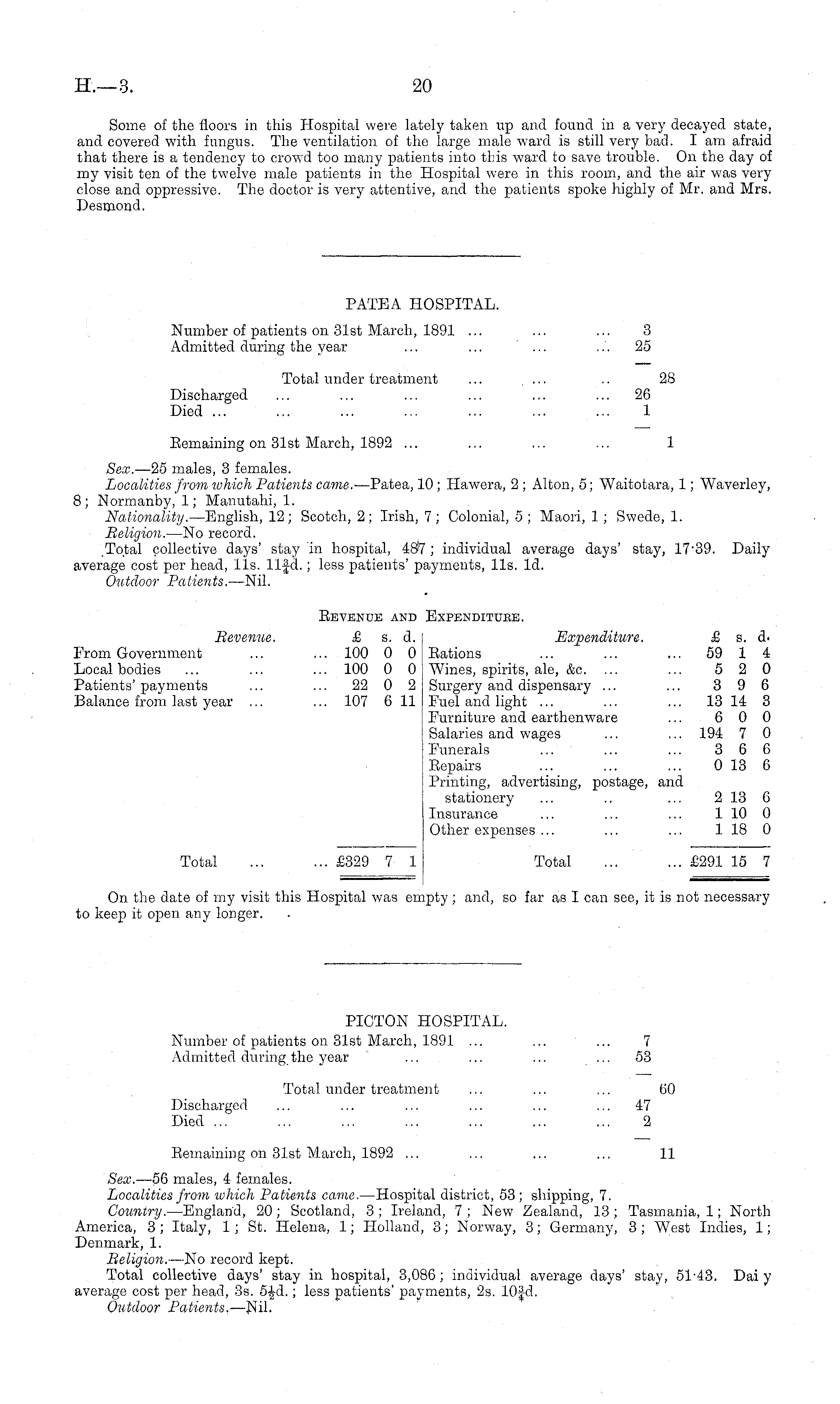 PATEA HOSPITAL. Number of patients on 31st March, 1891 ... ... ... 3 Admitted during the year ... ... ... ..'. 25 Total under treatment ... .... .. 28 Discharged ... ... ... ... ... ... 26 Died ... ... ... 1 Eemaining on 31st March, 1892 ... ... ... ... 1 Sex. —2s males, 3 females. Localities from which Patients came. —Batea, 10 ; Hawera, 2 ; Alton, 5; Waitotara, 1; Waverley, 8; Normanby, 1; Manutahi, 1. Nationality. —English, 12; Scotch, 2; Irish, 7; Colonial, 5; Maori, 1; Swede, 1. Religion. —No record. .Total collective days' stay in hospital, 487; individual average days' stay, 17-39. Daily average cost per head, lis. 11-fd.; less patients' payments, lis. Id. Outdoor Patients. —Nil. Bevenue and Expenditure. Bevenue. £ s. d. Expenditure. £ s. d. From Government ... ... 100 0 0 Eations ... ... ... 5914 Local bodies ... ... ... 100 0 0 Wines, spirits, ale, &c. ... ... 5 2 0 Patients' payments ... ... 22 0 2 Surgery and dispensary ... ... 396 Balance from last year ... ... 107 611 Fuel and light ... ... ... 13 14 3 Furniture and earthenware ... 600 Salaries and wages ... ... 194 7 0 Funerals ... ... ... 366 Eepairs ... ... ... 0 13 6 Brinting, advertising, postage, and stationery ... .. ... 213 6 Insurance ... ... ... 1 10 0 Other expenses ... ... ... 1180 Total ... ... £329 7 1 Total ... ... £291 15 7 On the date of my visit this Hospital was empty ; and, so far as I can see, it is not necessary to keep it open any longer.