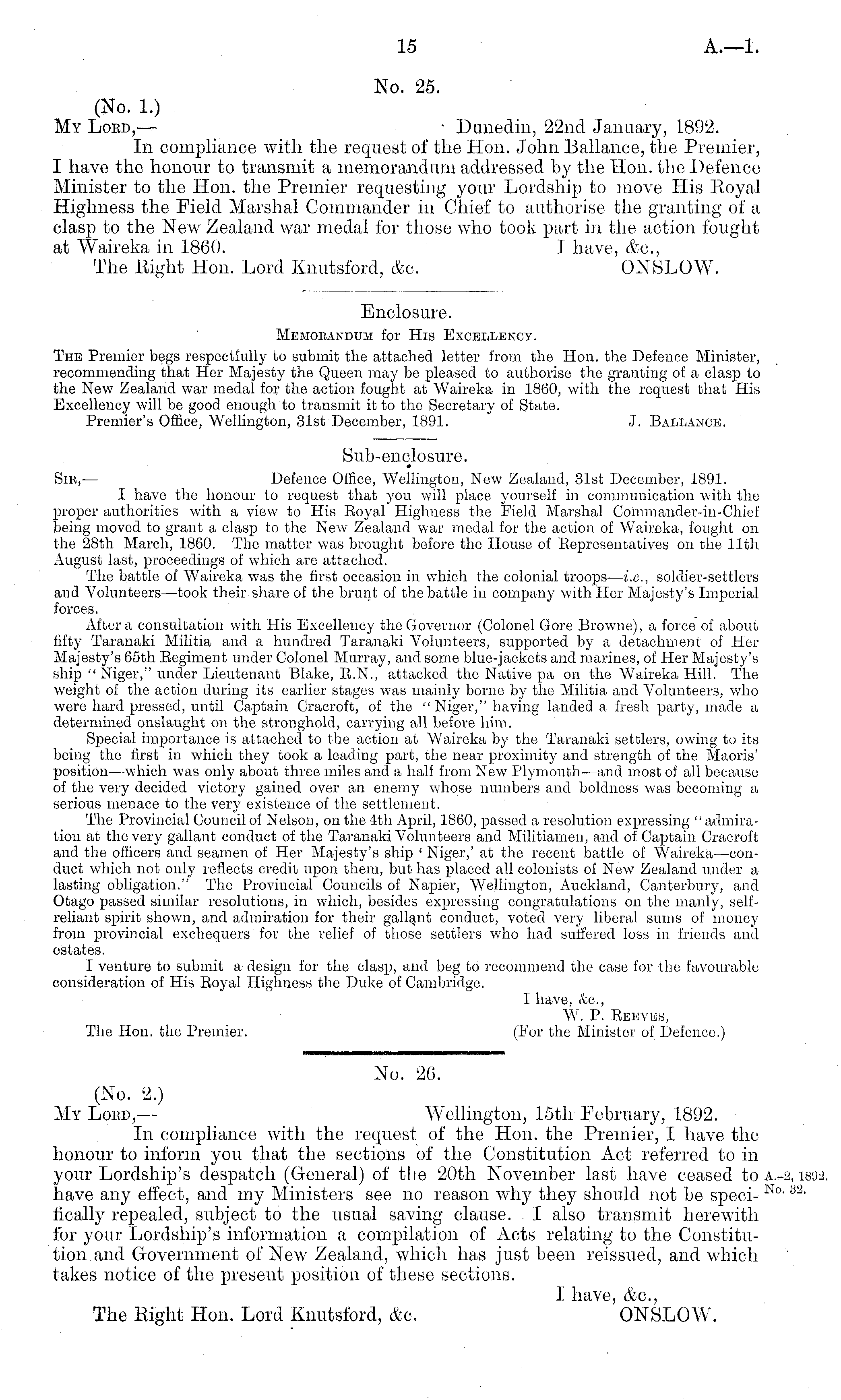 Enclosure. Memorandum for His Excellency. The Premier begs respectfully to submit the attached letter from the Hon. the Defence Minister, recommending that Her Majesty the Queen may be pleased to authorise the granting of a clasp to the New Zealand war medal for the action fought at Waireka in 1860, with the request that His Excellency will be good enough to transmit it to the Secretary of State. Premier's Office, Wellington, 31st December, 1891. J. Ballance.