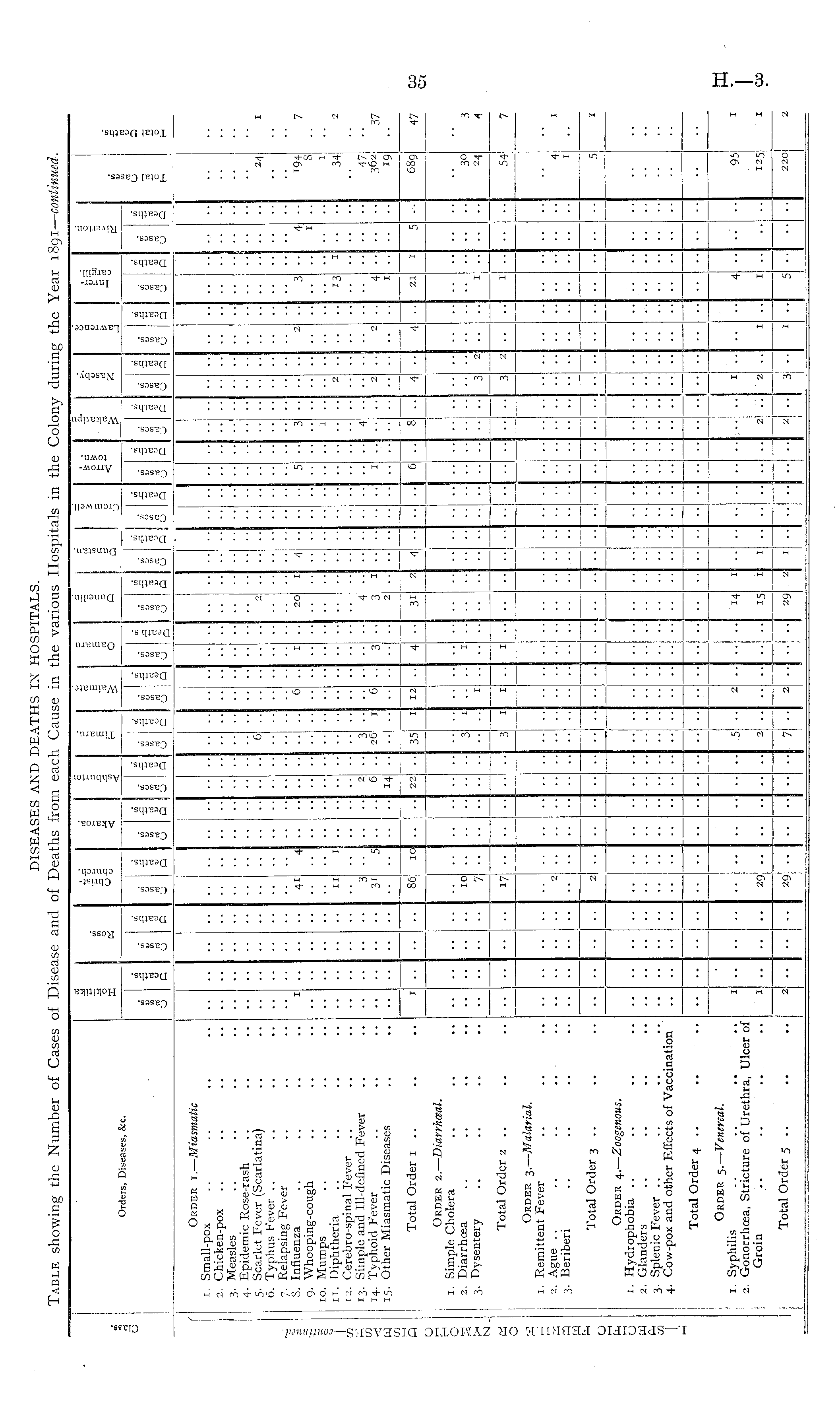 DISEASES AND DEATHS IN HOSPITALS. Table showing the Number of Cases of Disease and of Deaths from each Cause in the various Hospitals in the Colony during the Year 1891— continued.