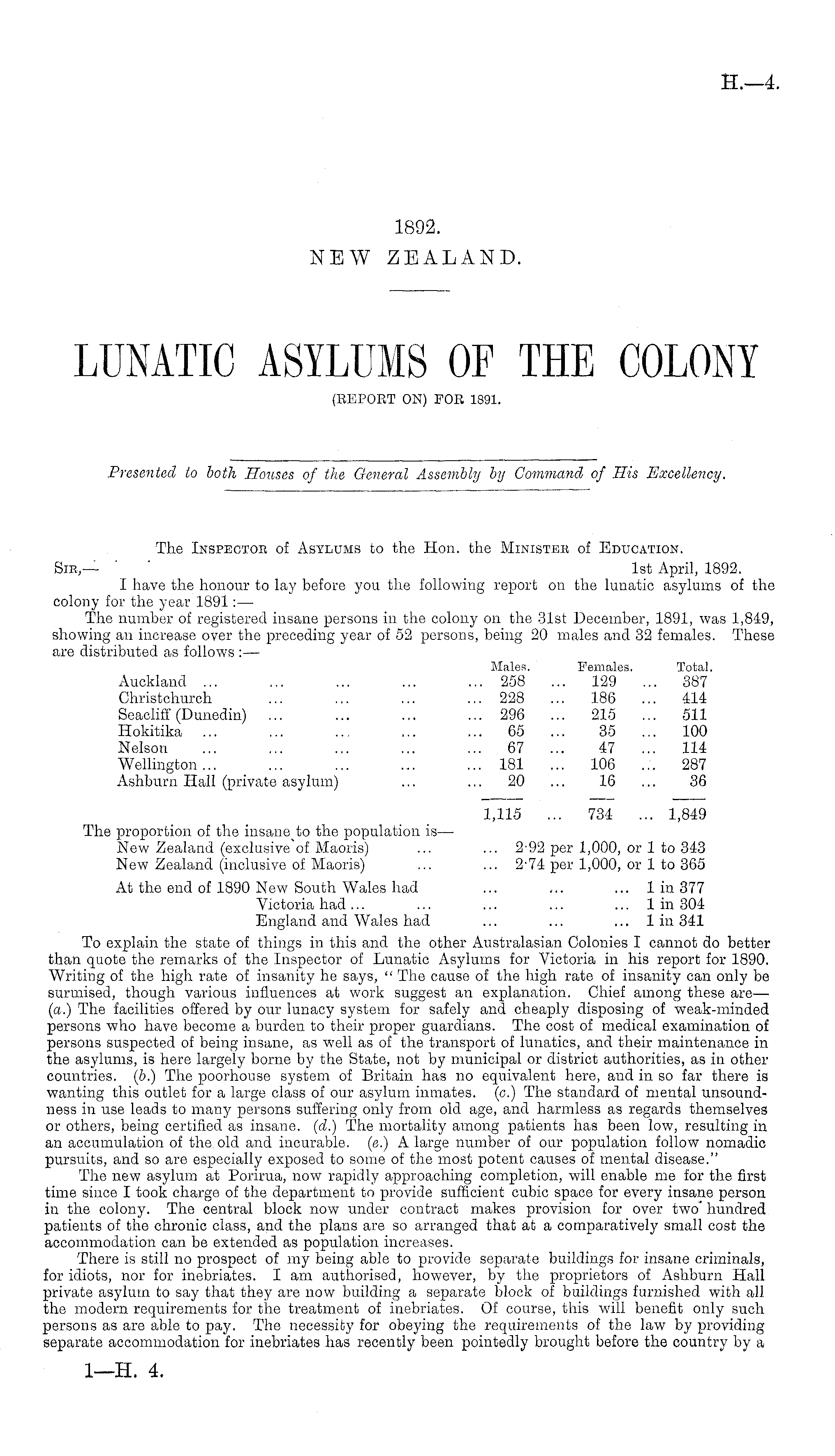 The Inspectob of Asylums to the Hon. the Minister of Education. Bm,— Ist April, 1892. I have the honour to lay before you the following report on the lunatic asylums of the colony for the year 1891: — The number of registered insane persons in the colony on the 31st December, 1891, was 1,849, showing an increase over the preceding year of 52 persons, being 20 males and 32 females. These are distributed as follows : — Males. Females. Total. Auckland ... ... ... ... ... 258 ... 129 ... 387 Christchurch ... ... ... ... 228 ... 186 ... 414 Seacliff (Dunedin) ... ... ... ... 296 ... 215 ... 511 Hokitika ... ... ... ... ... 65 ... 35 ... 100 Nelson ... ... ... ... ... 67 ... 47 ... 114 Wellington... ... ... ... ... 181 ... 106 ... 287 Ashburn Hall (private asylum) ... ... 20 ... 16 ... 36 1,115 ... 734 ... 1,849 The proportion of the insaneto the population is— New Zealand (exclusive of Maoris) ... ... 2-92 per 1,000, or Ito 343 New Zealand (inclusive of Maoris) ... ... 2-74 per 1,000, or Ito 365 At the end of 1890 New South Wales had ... ... ... lin 377 Victoria had... ... ... ... ... lin 304 England and Wales had ... ... ... lin 341 To explain the state of things in this and the other Australasian Colonies I cannot do better than quote the remarks of the Inspector of Lunatic Asylums for Victoria in his report for 1890. Writing of the high rate of insanity he says, " The cause of the high rate of insanity can only be surmised, though various influences at work suggest an explanation. Chief among these are— (a.) The facilities offered by our lunacy system for safely and cheaply disposing of weak-minded persons who have become a burden to their proper guardians. The cost of medical examination of persons suspected of being insane, as well as of the transport of lunatics, and their maintenance in the asylums, is here largely borne by the State, not by municipal or district authorities, as in other countries. (6.) The poorhouse system of Britain has no equivalent here, and in so far there is wanting this outlet for a large class of our asylum inmates, (c.) The standard of mental unsoundness in use leads to many persons suffering only from old age, and harmless as regards themselves or others, being certified as insane, (d.) The mortality among patients has been low, resulting in an accumulation of the. old and incurable, (c.) A large number of our population follow nomadic pursuits, and so are especially exposed to some of the most potent causes of mental disease." The new asylum at Porirua, now rapidly approaching completion, will enable me for the first time since I took charge of the department to provide sufficient cubic space for every insane person in the colony. The central block now under contract makes provision for over two* hundred patients of the chronic class, and the plans are so arranged that at a comparatively small cost the accommodation can be extended as population increases. There is still no prospect of my being able to provide separate buildings for insane criminals, for idiots, nor for inebriates. I am authorised, however, by the proprietors of Ashburn Hall private asylum to say that they are now building a separate block of buildings furnished with all the modern requirements for the treatment of inebriates. Of course, this will benefit only such persons as are able to pay. The necessity for obeying the requirements of the law by providing separate accommodation for inebriates has recently been pointedly brought before the country by a I—H. 4.