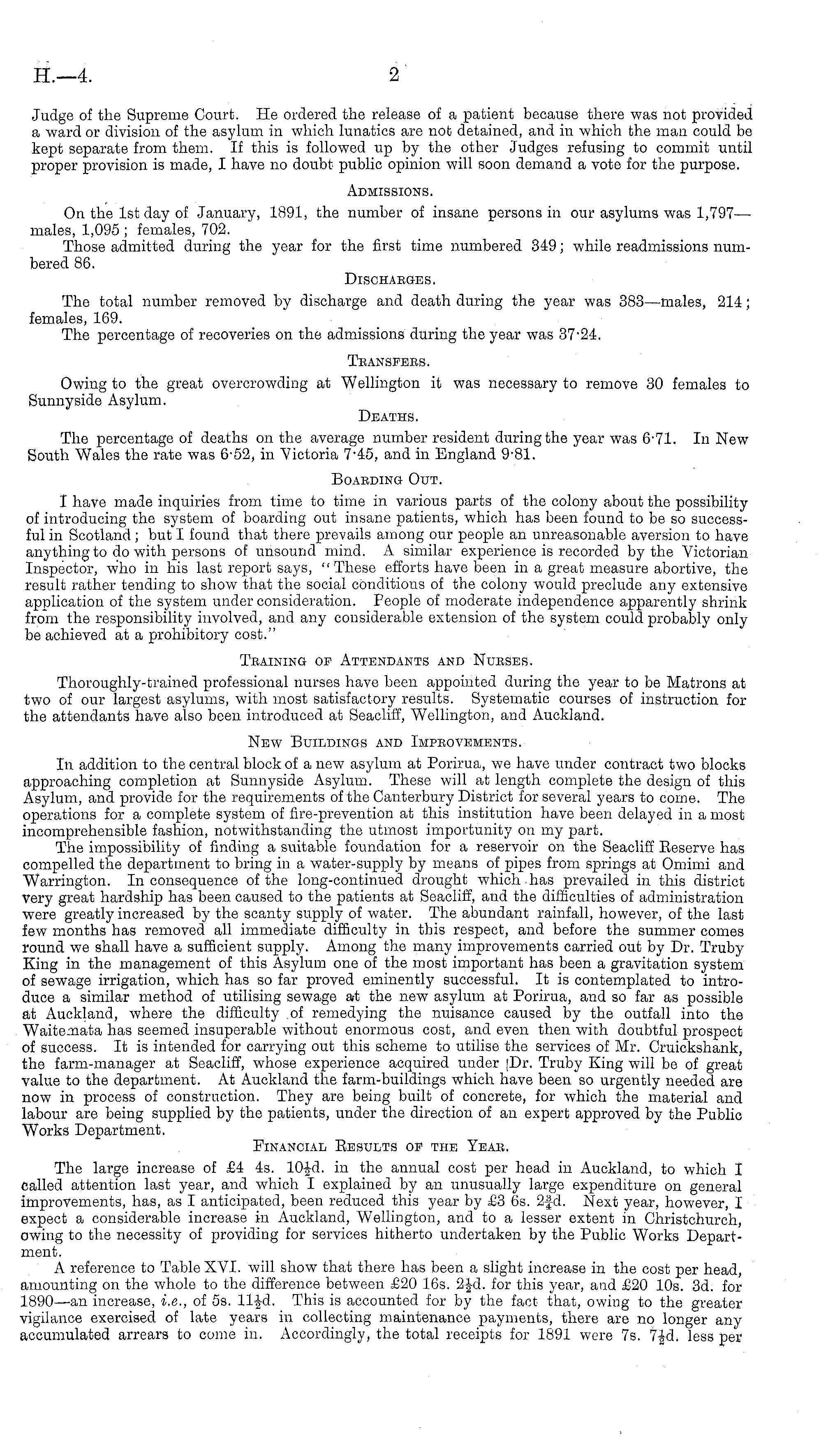 Judge of the Supreme Court. He ordered the release of a patient because there was not provided a ward or division of the asylum in which lunatics are not detained, and in which the man could be kept separate from them. If this is followed up by the other Judges refusing to commit until proper provision is made, I have no doubt public opinion will soon demand a vote for the purpose. Admissions. On the Ist day of January, 1891, the number of insane persons in our asylums was 1,797 —■ males, 1,095 ; females, 702. Those admitted during the year for the first time numbered 349; while readmissions numbered 86. DISCHABGES. The total number removed by discharge and death during the year was 383 —males, 214; females, 169. The percentage of recoveries on the admissions during the year was 3724. Tbansfebs. Owing to the great overcrowding at Wellington it was necessary to remove 30 females to Sunny side Asylum. Deaths. The percentage of deaths on the average number resident during the year was 671. In New South Wales the rate was 6-52, in Victoria 745, and in England 9-81. Boaeding Out. I have made inquiries from time to time in various parts of the colony about the possibility of introducing the system of boarding out insane patients, which has been found to be so successful in Scotland; but I found that there prevails among our people an unreasonable aversion to have anything to do with persons of unsound mind. A similar experience is recorded by the Victorian Inspector, who in his last report says, "These efforts have been in a great measure abortive, the result rather tending to show that the social conditions of the colony would preclude any extensive application of the system under consideration. People of moderate independence apparently shrink from the responsibility involved, and any considerable extension of the system could probably only be achieved at a prohibitory cost." Training op Attendants and Nubses. Thoroughly-trained professional nurses have been appointed during the year to be Matrons at two of our largest asylums, with most satisfactory results. Systematic courses of instruction for the attendants have also been introduced at Seacliff, Wellington, and Auckland. New Buildings and Impeovements. In addition to the central block of anew asylum at Porirua, we have under contract two blocks approaching completion at Sunnyside Asylum. These will at length complete the design of this Asylum, and provide for the requirements of the Canterbury District for several years to come. The operations for a complete system of fire-prevention at this institution have been delayed in a most incomprehensible fashion, notwithstanding the utmost importunity on my part. The impossibility of finding a suitable foundation for a reservoir on the Seacliff Eeserve has compelled the department to bring in a water-supply by means of pipes from springs at Omimi and Warrington. Inconsequence of the long-continued drought which, has prevailed in this district Very great hardship has been caused to the patients at Seacliff, and the difficulties of administration were greatly increased by the scanty supply of water. The abundant rainfall, however, of the last few months has removed all immediate difficulty in this respect, and before the summer comes round we shall have a sufficient supply. Among the many improvements carried out by Dr. Truby King in the management of this Asylum one of the most important has been a gravitation system of sewage irrigation, which has so far proved eminently successful. It is contemplated to introduce a similar method of utilising sewage at the new asylum at Porirua, and so far as possible at Auckland, where the difficulty of remedying the nuisance caused by the outfall into the Waitemata has seemed insuperable without enormous cost, and even then with doubtful prospect of success. It is intended for carrying out this scheme to utilise the services of Mr. Cruickshank, the farm-manager at Seacliff, whose experience acquired under |Dr. Truby King will be of great value to the department. At Auckland the farm-buildings which have been so urgently needed are now in process of construction. They are being built of concrete, for which the material and labour are being supplied by the patients, under the direction of an expert approved by the Public Works Department. Financial Eesults of the Yeak. The large increase of £4 4s. 10-J-d. in the annual cost per head in Auckland, to which I called attention last year, and which I explained by an unusually large expenditure on general improvements, has, as I anticipated, been reduced this year by £3 6s. 2fd. Next year, however, I expect a considerable increase in Auckland, Wellington, and to a lesser extent in Christchurch, owing to the necessity of providing for services hitherto undertaken by the Public Works Department. A reference to Table XVI. will show that there has been a slight increase in the cost per head, amounting on the whole to the difference between £20 16s. 2-J-d. for this year, and £20 10s. 3d. for 1890—an increase, i.e., of ss. lljd. This is accounted for by the fact that, owing to the greater vigilance exercised of late years in collecting maintenance payments, there are no longer any accumulated arrears to come in. Accordingly, the total receipts for 1891 were 7s. 7-Jd. less per