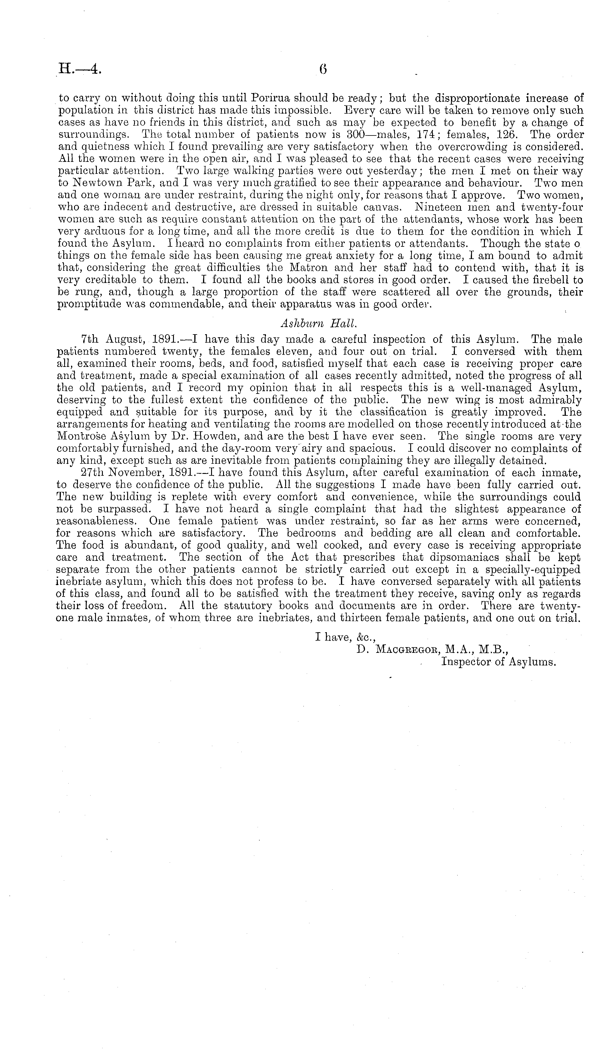 to carry on without doing this until Porirua should be ready; but the disproportionate increase of population in this district has made this impossible. Every care will be taken to remove only such cases as have no friends in this district, and such as may be expected to benefit by a change of surroundings. The total number of patients now is 300—males, 174; females, 126. The order and quietness which I found prevailing are very satisfactory when the overcrowding is considered. All the women were in the open air, and I was pleased to see that the recent cases were receiving particular attention. Two large walking parties were out yesterday; the men I met on their way to Newtown Park, and I was very much gratified to see their appearance and behaviour. Two men and one woman are under restraint, during the night only, for reasons that I approve. Two women, who are indecent and destructive, are dressed in suitable canvas. Nineteen men and twenty-four women are such as require constant attention on the part of the attendants, whose work has been very arduous for a long time, and all the more credit is due to them for the condition in which I found the Asylum. I heard no complaints from either patients or attendants. Though the state o things on the female side has been causing me great anxiety for a long time, I am bound to admit that, considering the great difficulties the Matron and her staff had to contend with, that it is very creditable to them. I found all the books and stores in good order. I caused the firebell to be rung, and, though a large proportion of the staff were scattered all over the grounds, their promptitude was commendable, and their apparatus was in good order. Ashburn Hall. 7th August, 1891.—1 have this day made a careful inspection of this Asylum. The male patients numbered twenty, the females eleven, and four out on trial. I conversed with them all, examined their rooms, beds, and food, satisfied myself that each case is receiving proper care and treatment, made a special examination of all cases recently admitted, noted the progress of all the old patients, and I record my opinion that in all respects this is a well-managed Asylum, deserving to the fullest extent the confidence of the public. The new wing is most admirably equipped and suitable for its purpose, and by it the classification is greatly improved. The arrangements for heating and ventilating the rooms are modelled on those recently introduced at the Mont-rose Asylum by Dr. Howden, and are the best I have ever seen. The single rooms are very comfortably furnished, and the day-room very airy and spacious. I could discover no complaints of any kind, except such as are inevitable from patients complaining they are illegally detained. 27th November, 1891. —I have found this Asylum, after careful examination of each inmate, to deserve the confidence of the public. All the suggestions I made have been fully carried out. The new building is replete with every comfort and convenience, while the surroundings could not be surpassed. I have not heard a single complaint that had the slightest appearance of reasonableness. One female patient was under restraint, so far as her arms were concerned, for reasons which are satisfactory. The bedrooms and bedding are all clean and comfortable. The food is abundant, of good quality, and well cooked, and every case is receiving appropriate care and treatment. The section of the Act that prescribes that dipsomaniacs shall be kept separate from the other patients cannot be strictly carried out except in a specially-equipped inebriate asylum, which this does not profess to be. I have conversed separately with all patients of this class, and found all to be satisfied with the treatment they receive, saving only as regards their loss of freedom. All the statutory books and documents are in order. There are twentyone male inmates, of whom, three are inebriates, and thirteen female patients, and one out on trial. I have, &c, D. Macgeegob, M.A., M.8., Inspector of Asylums.