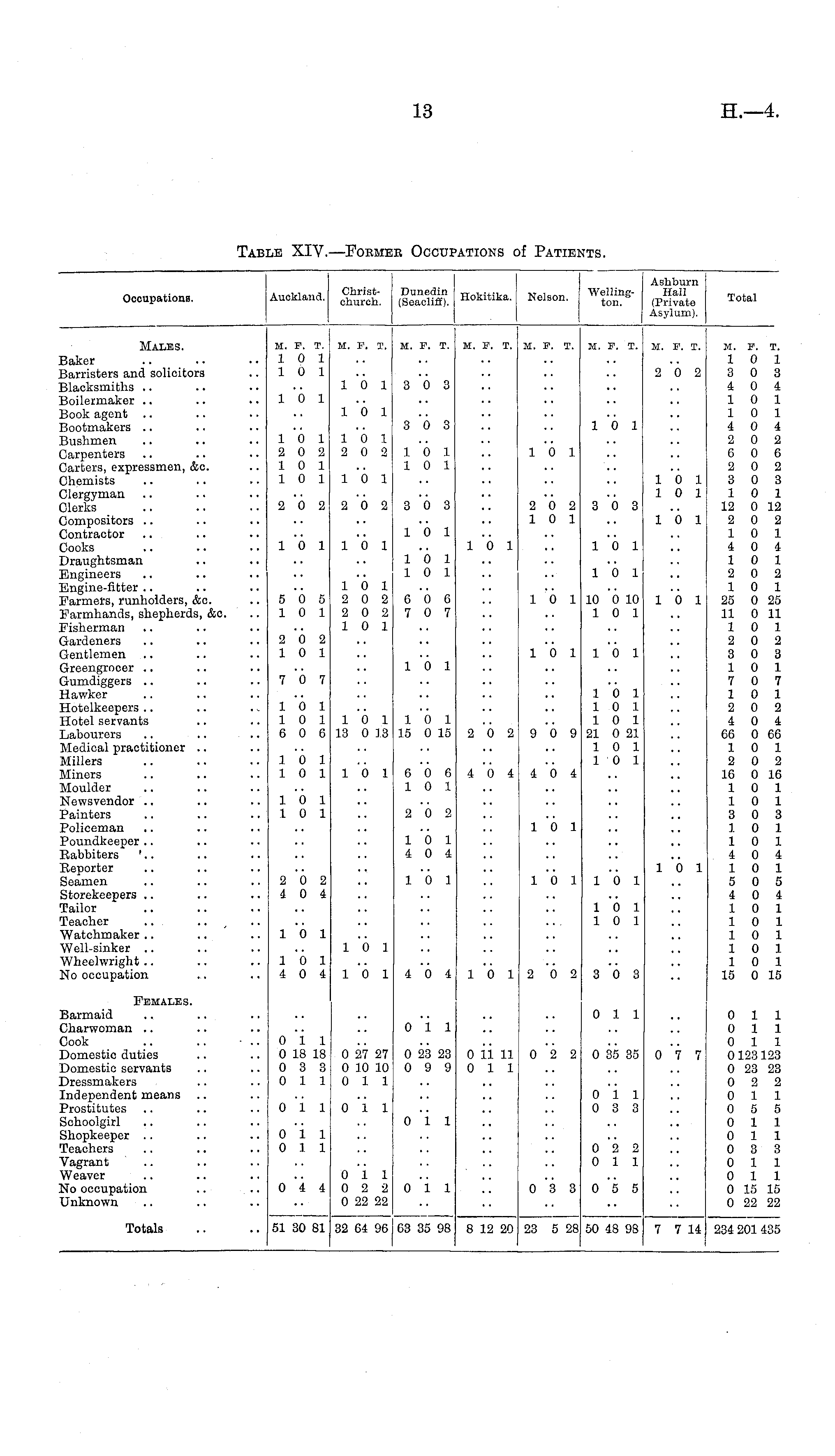 Occupations. Auckland. <»£* Dunedin (Seacliff). Hokitika. Nelson. W^™ ng " Ash burn Hall (Private Asylum). Total Males. M. P. T. 10 1 10 1 M. F. T. M. F. T. M. F. T. M. F. T. M. F. T. M. F. T. M. P. T. 10 1 3 0 3 4 0 4 10 1 10 1 4 0 4 2 0 2 6 0 6 2 0 2 3 0 3 10 1 12 0 12 2 0 2 10 1 4 0 4 10 1 2 0 2 10 1 25 0 25 11 0 11 10 1 2 0 2 3 0 3 10 1 7 0 7 10 1 2 0 2 4 0 4 G6 0 66 10 1 2 0 2 16 0 16 10 1 10 1 3 0 3 10 1 10 1 4 0 4 10 1 5 0 5 4 0 4 10 1 10 1 10 1 10 1 10 1 15 0 15 Baker Barristers and solicitors Blacksmiths Boilermaker Book agent Bootmakers Bushmen Carpenters Carters, expressmen, &c. Chemists Clergyman Clerks Compositors Contractor Cooks Draughtsman Engineers Engine-fitter Farmers, runholders, &c. Farmhands, shepherds, &o. Fisherman Gardeners Gentlemen Greengrocer .. Gumdiggers Hawker Hotelkeepers Hotel servants Labourers .. Medical practitioner .. Millers Miners Moulder Newsvendor Painters Policeman Poundkeeper .. Rabbiters '.. Beporter Seamen Storekeepers Tailor Teacher Watchmaker Well-sinker Wheelwright .. No occupation 10 1 10 1 2 0 2 10 1 10 1 2 0 2 10 1 5 0 5 10 1 2 0 2 10 1 7 0 7 10 1 10 1 10 1 2 0 2 10 1 2 0 2 10 1 10 1 2 0 2 2 0 2 10 1 3 0 3 3 0 3 1 '0 1 10 1 3 0 3 10 1 1 '6 1 10 1 6 0 6 7 0 7 10 1 10 1 1 '6 1 2 '6 2 101 101 101 10 1 3 0 3 1 'o 1 10 1 10 '6 10 10 1 10 1 2 0 2 10 1 10 1 10 1 10 1 10 1 10 1 6 0 6 10 1 13 0 13 10 1 15 0 15 2 '6 2 9 0 9 10 1 10 1 10 1 21 0 21 10 1 10 1 10 1 10 1 1 0 1 6 0 6 10 1 4 0 4 4 0 4 10 1 10 1 2 '6 2 10 1 4 0 4 10 1 2 '6 2 4 0 4 10 1 1 '6 1 10 1 10 1 10 1 1 0 1 10 1 10 1 4 0 4 10 1 10 1 4 0 4 10 1 2 '6 2 3 0 3 Females. Oil Oil 0 11 0 11 0 11 0123123 0 23 23 0 2 2 0 11 0 5 5 Oil Oil 0 3 3 Oil Oil 0 15 15 0 22 22 Barmaid Charwoman Cook Domestic duties Domestic servants Dressmakers Independent means Prostitutes Schoolgirl Shopkeeper Teachers Vagrant Weaver No occupation Unknown 0 11 0 18 18 0 3 3 0 11 0 11 0 27 27 0 10 10 0 11 oil 0 23 23 0 9 9 oil 0 11 11 0 11 0 2 2 0 35 35 Oil 0 3 3 0 7 7 0 11 0 11 0 2 2 Oil 0 4 4 0 11 0 2 2 0 22 22 Oil 0 3 3 0 '5 5 Totals 51 30 81 32 64 96 63 35 98 8 12 20 23 5 28 50 48 98 7 7 14 234 201 435