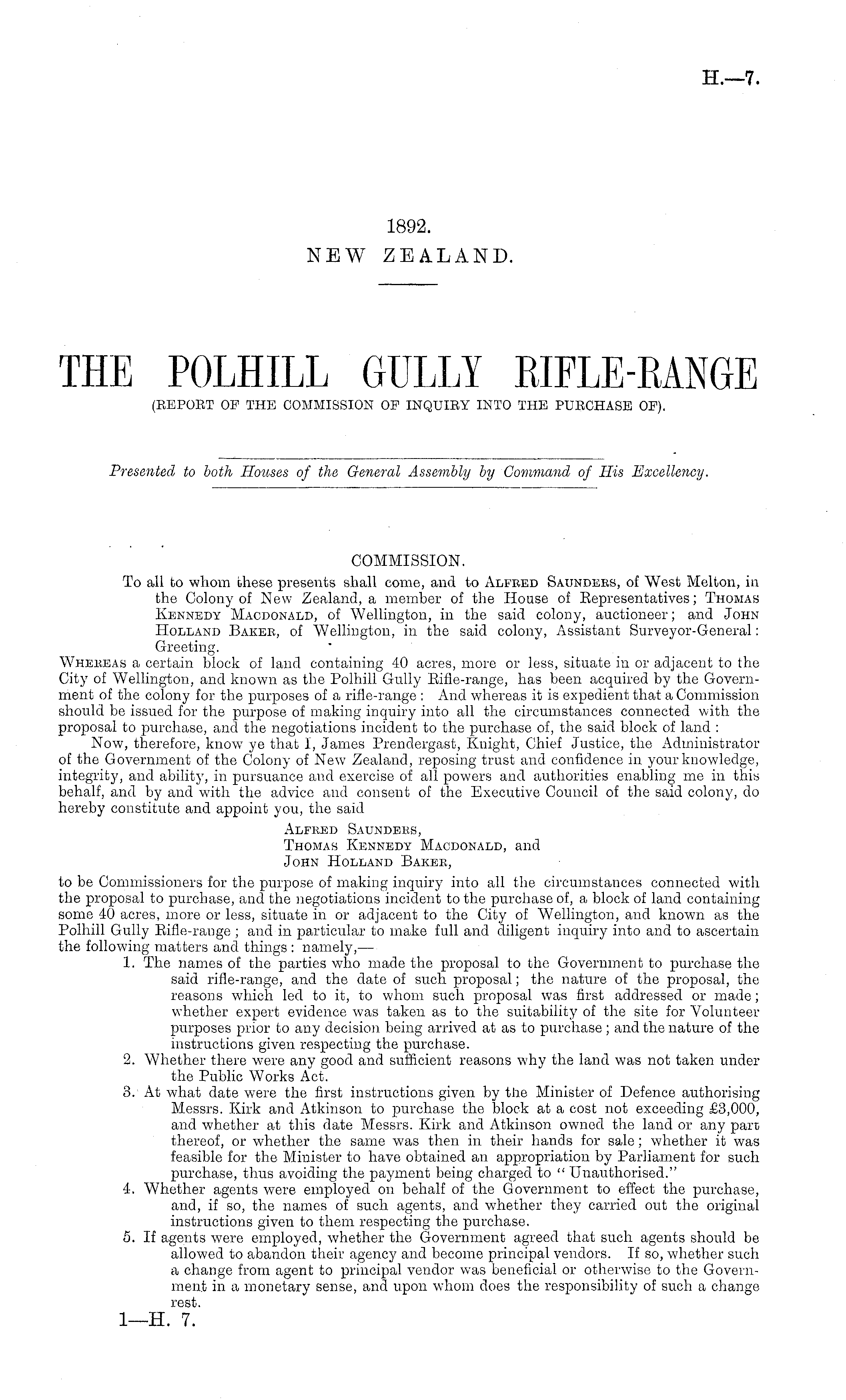 COMMISSION. To all to whom these presents shall come, and to Alfred Saunders, of West Melton, in the Colony of New Zealand, a member of the House of Representatives; Thomas Kennedy Macdonald, of Wellington, in the said colony, auctioneer; and John Holland Baker, of Wellington, in the said colony, Assistant Surveyor-General: Greeting. Whereas a certain block of land containing 40 acres, more or less, situate in or adjacent to the City of Wellington, and known as the Polhill Gully Rifle-range, has been acquired by the Government of the colony for the purposes of a rifle-range : And whereas it is expedient that a Commission should be issued for the purpose of making inquiry into all the circumstances connected with the proposal to purchase, and the negotiations incident to the purchase of, the said block of land : Now, therefore, know ye that I, James Prendergast, Knight, Chief Justice, the Administrator of the Government of the Colony of New Zealand, reposing trust and confidence in your knowledge, integrity, and ability, in pursuance and exercise of all powers and authorities enabling me in this behalf, and by and with the advice and consent of the Executive Council of the said colony, do hereby constitute and appoint you, the said Alfred Saunders, Thomas Kennedy Macdonald, and John Holland Baker, to be Commissioners for the purpose of making inquiry into all the circumstances connected with the proposal to purchase, and the negotiations incident to the purchase of, a block of land containing some 40 acres, more or less, situate in or adjacent to the City of Wellington, and known as the Polhill Gully Rifle-range ; and in particular to make full and diligent inquiry into and to ascertain the following matters and things : namely, — 1. The names of the parties who made the proposal to the Government to purchase the said rifle-range, and the date of such proposal; the nature of the proposal, the reasons which led to it, to whom such proposal was first addressed or made; whether expert evidence was taken as to the suitability of the site for Volunteer purposes prior to any decision being arrived at as to purchase ; and the nature of the instructions given respecting the purchase. 2. Whether there were any good and sufficient reasons why the land was not taken under the Public Works Act. 3. At what date were the first instructions given by the Minister of Defence authorising Messrs. Kirk and Atkinson to purchase the block at a cost not exceeding £3,000, and whether at this date Messrs. Kirk and Atkinson owned the land or any part thereof, or whether the same was then hi their hands for sale; whether it was feasible for the Minister to have obtained an appropriation by Parliament for such purchase, thus avoiding the payment being charged to " Unauthorised." 4. Whether agents were employed on behalf of the Government to effect the purchase, and, if so, the names of such agents, and whether they carried out the original instructions given to them respecting the purchase. 5. If agents were employed, whether the Government agreed that such agents should be allowed to abandon their agency and become principal vendors. If so, whether such a change from agent to principal vendor was beneficial or otherwise to the Government in a monetary sense, and upon whom does the responsibility of such a change rest. I—H. 7.