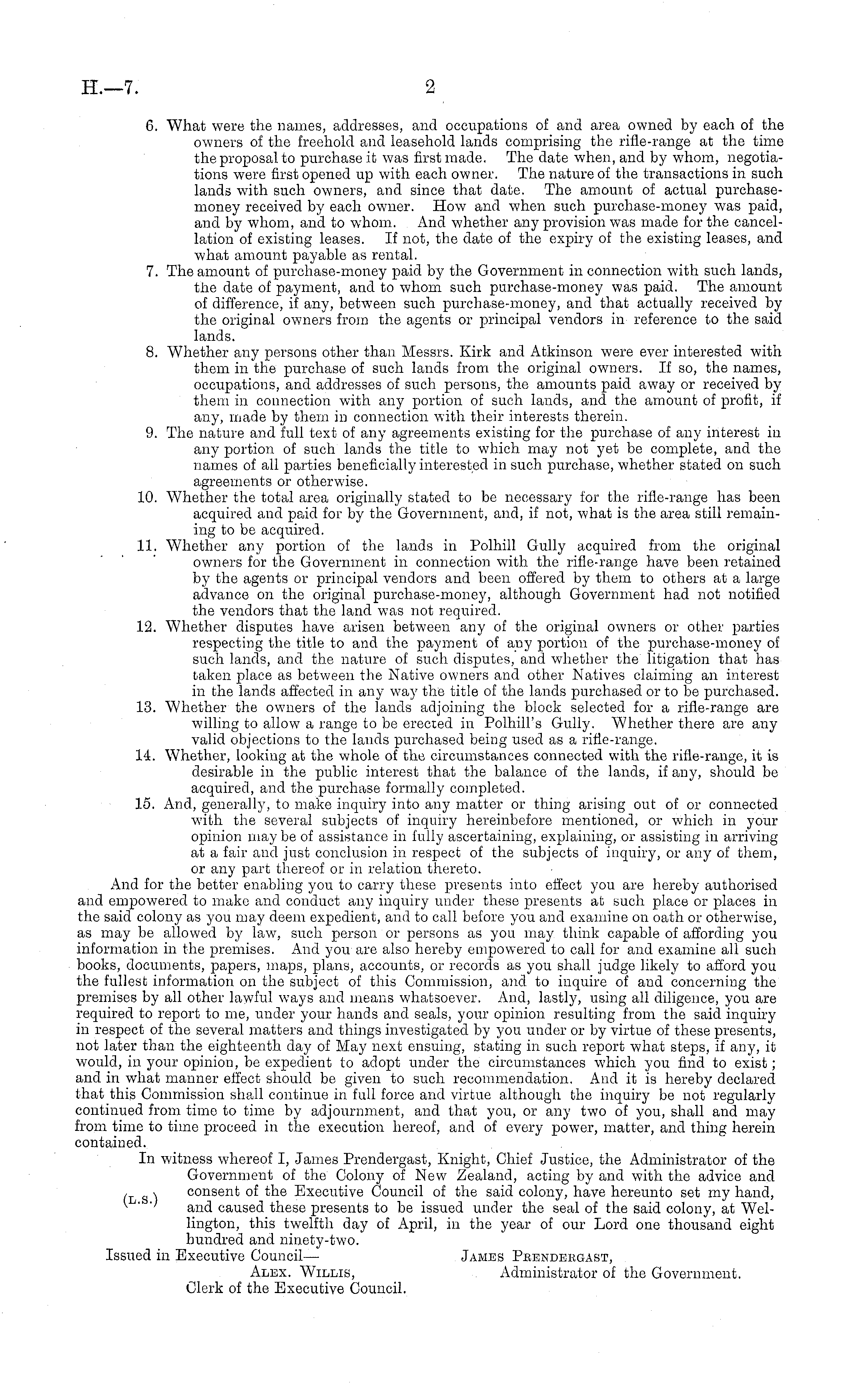 6. What were the names, addresses, and occupations of and area owned by each of the owners of the freehold and leasehold lands comprising the rifle-range at the time the proposal to purchase it was first made. The date when, and by whom, negotiations were first opened up with each owner. The nature of the transactions in such lands with such owners, and since that date. The amount of actual purchasemoney received by each owner. How and when such purchase-money was paid, and by whom, and to whom. And whether any provision was made for the cancellation of existing leases. If not, the date of the expiry of the existing leases, and what amount payable as rental. 7. The amount of purchase-money paid by the Government in connection with such lands, the date of payment, and to whom such purchase-money was paid. The amount of difference, if any, between such purchase-money, and that actually received by the original owners from the agents or principal vendors in reference to the said lands. 8. Whether any persons other than Messrs. Kirk and Atkinson were ever interested with them in the purchase of such lands from the original owners. If so, the names, occupations, and addresses of such persons, the amounts paid away or received by them in connection with any portion of such lands, and the amount of profit, if any, made by them in connection with their interests therein. 9. The nature and full text of any agreements existing for the purchase of any interest in any portion of such lands the title to which may not yet be complete, and the names of all parties beneficially interested in such purchase, whether stated on such agreements or otherwise. 10. Whether the total area originally stated to be necessary for the rifle-range has been acquired and paid for by the Government, and, if not, what is the area still remaining to be acquired. 11. Whether any portion of the lands in Polhill Gully acquired from the original owners for the Government in connection with the rifle-range have been retained by the agents or principal vendors and been offered by them to others at a large advance on the original, purchase-money, although Government had not notified the vendors that the land was not required. 12. Whether disputes have arisen between any of the original owners or other parties respecting the title to and the payment of any portion of the purchase-money of such lands, and the nature of such disputes, and whether the litigation that has taken place as between the Native owners and other Natives claiming an interest in the lands affected in any way the title of the lands purchased or to be purchased. 13. Whether the owners of the lands adjoining the block selected for a rifle-range are willing to allow a range to be erected in Polhill's Gully. Whether there are any valid objections to the lands purchased being used as a rifle-range. 14. Whether, looking at the whole of the circumstances connected with the rifle-range, it is desirable in the public interest that the balance of the lands, if any, should be acquired, and the purchase formally completed. 15. And, generally, to make inquiry into any matter or thing arising out of or connected with the several subjects of inquiry hereinbefore mentioned, or which in your opinion may be of assistance in fully ascertaining, explaining, or assisting in arriving at a fair and just conclusion in respect of the subjects of inquiry, or any of them, or any part thereof or in relation thereto. And for the better enabling you to carry these presents into effect you are hereby authorised and empowered to make and conduct any inquiry under these presents at such place or places in the said colony as you may deem expedient, and to call before you and examine on oath or otherwise, as may be allowed by law, such person or persons as you may think capable of affording you information in the premises. And you are also hereby empowered to call for and examine all such books, documents, papers, maps, plans, accounts, or records as you shall judge likely to afford you the fullest information on the subject of this Commission, and to inquire of and concerning the premises by all other lawful ways and means whatsoever. And, lastly, using all diligence, you are required to report to me, under your hands and seals, your opinion resulting from the said, inquiry in respect of the several matters and things investigated by you under or by virtue of these presents, not later than the eighteenth day of May next ensuing, stating in such report what steps, if any, it would, in your opinion, be expedient to adopt under the circumstances which you find to exist; and in what maimer effect should be given to such recommendation. And it is hereby declared that this Commission shall continue in full force and virtue although the inquiry be not regularly continued from time to time by adjournment, and that you, or any two of you, shall and may from time to time proceed in the execution hereof, and of every power, matter, and thing herein contained. In witness whereof I, James Prendergast, Knight, Chief Justice, the Administrator of the Government of the Colony of New Zealand, acting by and with the advice and ,■, consent of the Executive Council of the said colony, have hereunto set my hand, ' ' and caused these presents to be issued under the seal of the said colony, at Wellington, this twelfth day of April, in the year of our Lord one thousand eight hundred and ninety-two. Issued in Executive Council— James Prendergast, Alex. Willis, Administrator of the Government. Clerk of the Executive Council.
