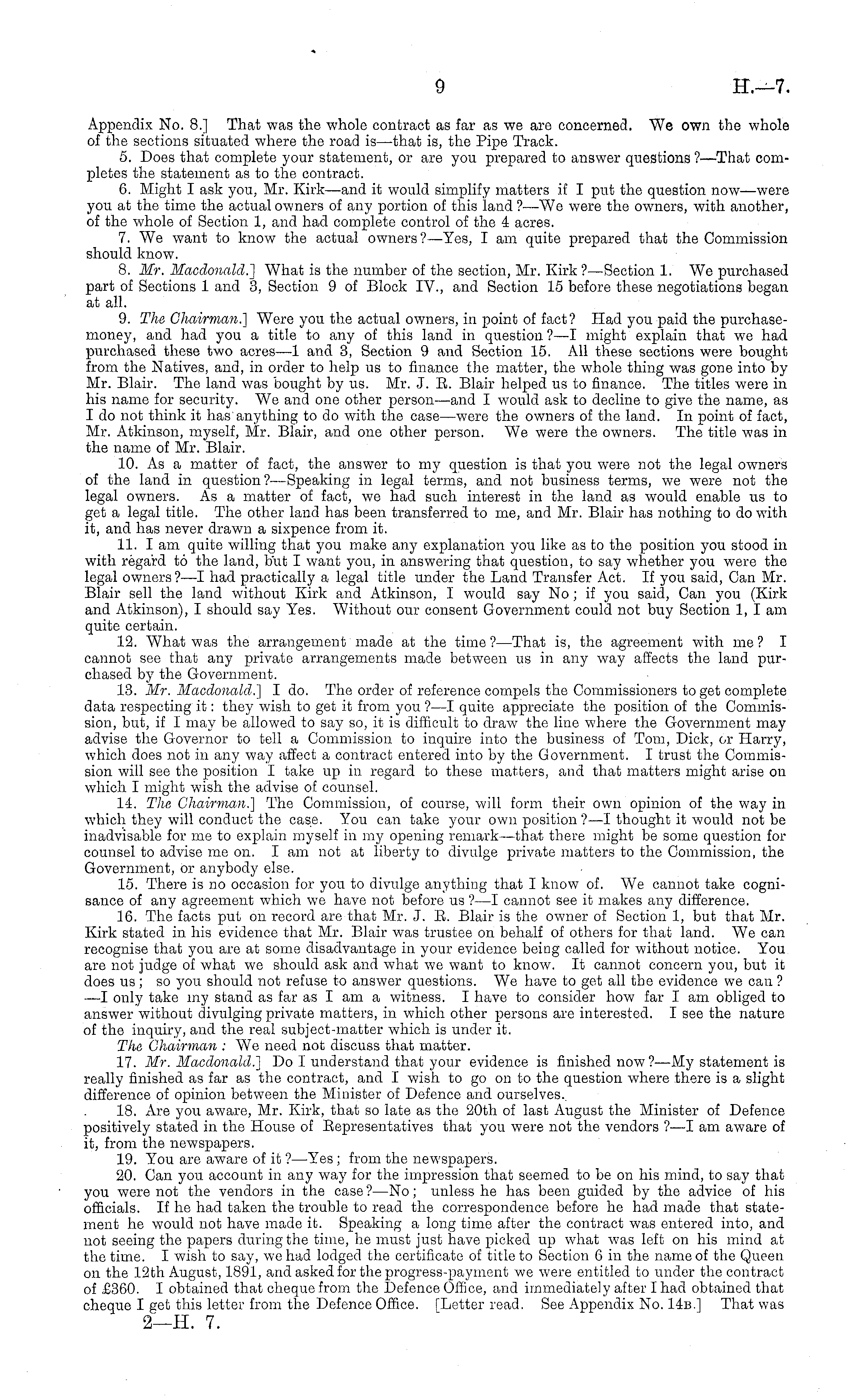 Appendix No. B.] That was the whole contract as far as we are concerned. We own the whole of the sections situated where the road is—that is, the Pipe Track. 5. Does that complete your statement, or are you prepared to answer questions ?—That completes the statement as to the contract. 6. Might I ask you, Mr. Kirk—and it would simplify matters if I put the question now—were you at the time the actual owners of any portion of this land ?—We were the owners, with another, of the whole of Section 1, and had complete control of the 4 acres. 7. We want to know the actual owners?— Yes, I am quite prepared that the Commission should know. 8. Mr. Macdonald.] What is the number of the section, Mr. Kirk ?—Section 1. We purchased part of Sections 1 and 3, Section 9 of Block IV., and Section 15 before these negotiations began at all. 9. The Chairman.] Were you the actual owners, in point of fact? Had you paid the purchasemoney, and had you a title to any of this land in question ? —I might explain that we had purchased these two acres —1 and 3, Section 9 and Section 15. All these sections were bought from the Natives, and, in order to help us to finance the matter, the whole thing was gone into by Mr. Blair. The land was bought by us. Mr. J. R. Blair helped us to finance. The titles were in his name for security. We and one other person—and I would ask to decline to give the name, as Ido not think it has anything to do with the case—were the owners of the land. In point of fact, Mr. Atkinson, myself, Mr. Blair, and one other person. We were the owners. The title was in the name of Mr. Blair. 10. As a matter of fact, the answer to my question is that you were not the legal owners of the land in question?— Speaking in legal terms, and not business terms, we were not the legal owners. As a matter of fact, we had such interest in the land as would enable us to get a legal title. The other land has been transferred to me, and Mr. Blair has nothing to do with it, and has never drawn a sixpence from it. 11. I am quite willing that you make any explanation you like as to the position you stood in with regard to the land, but I want you, in answering that question, to say whether you were the legal owners? —I had practically a legal title under the Land Transfer Act. If you said, Can Mr. Blair sell the land without Kirk and Atkinson, I would say No; if you said, Can you (Kirk and Atkinson), I should say Yes. Without our consent Government could not buy Section 1, lam quite certain. 12. What was the arrangement made at the time ? —That is, the agreement with me ? I cannot see that any private arrangements made between us in any way affects the land purchased by the Government. 13. Mr. Macdonald.] I do. The order of reference compels the Commissioners to get complete data respecting it: they wish to get it from you ?—I quite appreciate the position of the Commission, but, if I may be allowed to say so, it is difficult to draw the line where the Government may advise the Governor to tell a Commission to inquire into the business of Tom, Dick, or Harry, which does not in any way affect a contract entered into by the Government. I trust the Commission will see the position I take up in regard to these matters, and that matters might arise on which I might wish the advise of counsel. 14. The The Commission, of course, will form their own opinion of the way in which they will conduct the case. You can take your own position ? —I thought it would not be inadvisable for me to explain myself in my opening remark —that there might be some question for counsel to advise me on. I am not at liberty to divulge private matters to the Commission, the Government, or anybody else. 15. There is no occasion for you to divulge anything that I know of. We cannot take cognisance of any agreement which we have not before us ?—I cannot see it makes any difference. 16. The facts put on record are that Mr. J. R. Blair is the owner of Section 1, but that Mr. Kirk stated in his evidence that Mr. Blair was trustee on behalf of others for that land. We can recognise that you are at some disadvantage in your evidence being called for without notice. You are not judge of what we should ask and what we want to know. It cannot concern you, but it does us; so you should not refuse to answer questions. We have to get all the evidence we can ? —I only take my stand as far as I am a witness. I have to consider how far I am obliged to answer without divulging private matters, in which other persons are interested. I see the nature of the inquiry, and the real subject-matter which is under it. The Chairman : We need not discuss that matter. 17. Mr. Macdonald.] Do I understand that your evidence is finished now?—My statement is really finished as far as the contract, and I wish to go on to the question where there is a slight difference of opinion between the Minister of Defence and ourselves.. 18. Are you aware, Mr. Kirk, that so late as the 20th of last August the Minister of Defence positively stated in the House of Representatives that you were not the vendors ?—I am aware of it, from the newspapers. 19. You are aware of it ? —Yes ; from the newspapers. 20. Can you account in any way for the impression that seemed to be on his mind, to say that you were not the vendors in the case ? —No; unless he has been guided by the advice of his officials. If he had taken the trouble to read the correspondence before he had made that statement he would not have made it. Speaking a long time after the contract was entered into, and not seeing the papers during the time, he must just have picked up what was left on his mind at the time. I wish to say, we had lodged the certificate of title to Section 6in the name of the Queen on the 12th August, 1891, and asked for the progress-payment we were entitled to under the contract of £360. I obtained that cheque from the Defence Office, and immediately after I had obtain