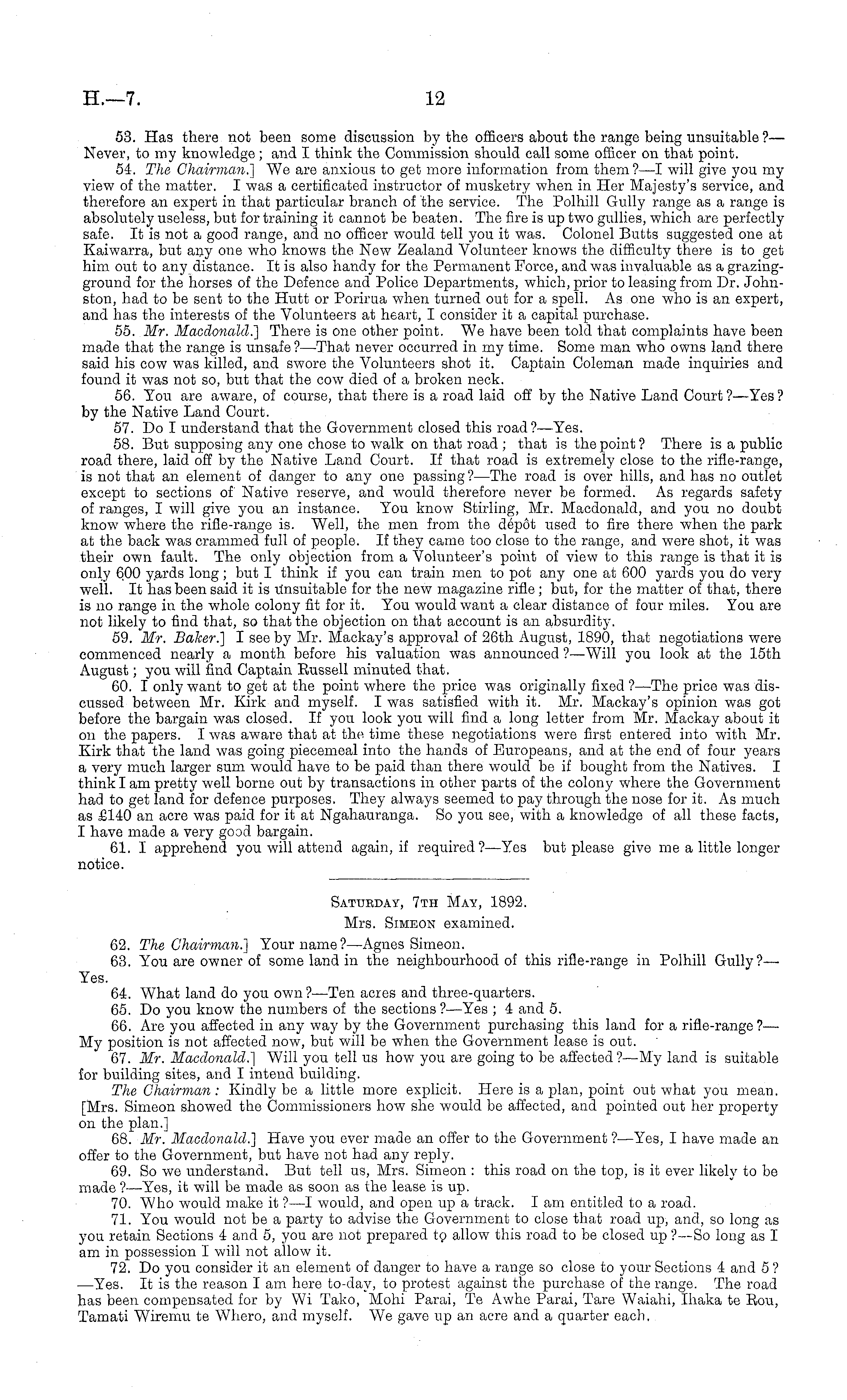 Saturday, 7th May, 1892. Mrs. Simeon examined. 62. The Chairman.] Your name?— Agnes Simeon. 63. You are owner of some land in the neighbourhood of this rifle-range in Polhill Gully?— Yes. 64. What land do you own?— Ten acres and three-quarters. 65. Do you know the numbers of the sections?— Yes ; 4 and 5. 66. Are you affected in any way by the Government purchasing this land for a rifle-range?— My position is not affected now, but will be when the Government lease is out. 67. Mr. Macdonald.] Will you tell us how you are going to be affected?—My land is suitable for building sites, and I intend building. The Chairman : Kindly be a little more explicit. Here is a plan, point out what you mean. [Mrs. Simeon showed the Commissioners how she would be affected, and pointed out her property on the plan.] 68. Mr. Macdonald.] Have you ever made an offer to the Government ?—Yes, I have made an offer to the Government, but have not had any reply. 69. So we understand. But tell us, Mrs. Simeon : this road on the top, is it ever likely to be made ? —Yes, it will be made as soon as the lease is up. 70. Who would make it ? —I would, and open up a track. lam entitled to a road. 71. You would not be a party to advise the Government to close that road up, and, so long as you retain Sections 4 and 5, you are not prepared to allow this road to be closed up ?—So long as I am in possession I will not allow it. 72. Do you consider it an element of danger to have a range so close to your Sections 4 and 5 ? —Yes. It is the reason lam here to-day, to protest against the purchase of the range. The road has been compensated for by Wi Tako, Mohi Parai, Te Awhe Parai, Tare Waiahi, Ihaka te Rou, Tamati Wiremu te Whero, and myself. We gave up an acre and a quarter each.
