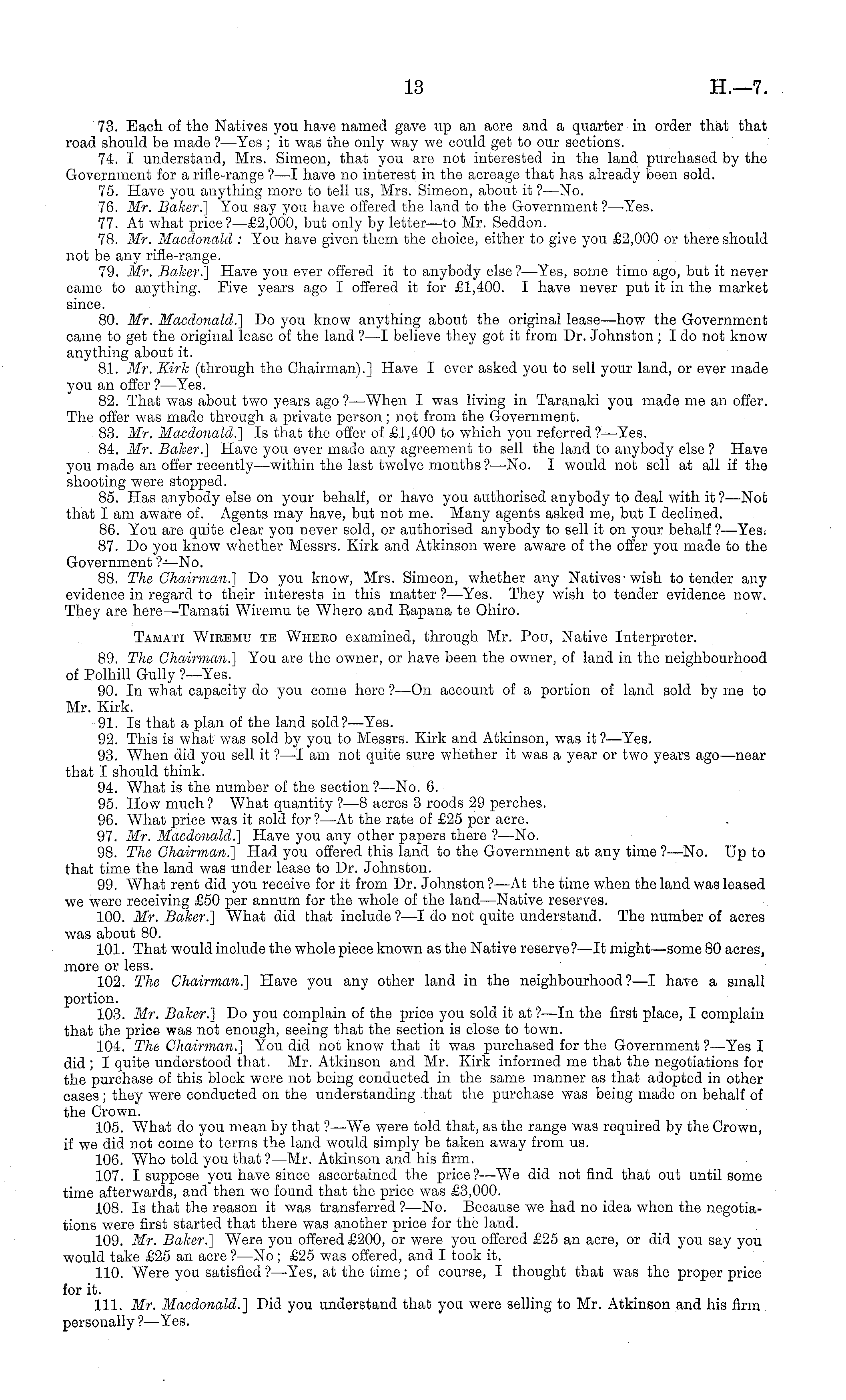 73. Each of the Natives you have named gave up an acre and a quarter in order that that road should be made ? —Yes ; it was the only way we could get to our sections. 74. I understand, Mrs. Simeon, that you are not interested in the land purchased by the Government for a rifle-range ?—I have no interest in the acreage that has already been sold. 75. Have you anything more to tell us, Mrs. Simeon, about it ?—No. 76. Mr. Baker.] You say you have offered the land to the Government ? —Yes. 77. At what price?—£2,ooo, but only by letter—to Mr. Seddon. 78. Mr. Macdonald : You have given them the choice, either to give you £2,000 or there should not be any rifle-range. 79. Mr. Baker.] Have you ever offered it to anybody else ?—Yes, some time ago, but it never came to anything. Five years ago I offered it for £1,400. I have never put it in the market since. 80. Mr. Macdonald.] Do you know anything about the original lease—how the Government came to get the original lease of the land ?—I believe they got it from Dr. Johnston ;I do not know anything about it. 81. Mr. Kirk (through the Chairman).] Have I ever asked you to sell your land, or ever made you an offer? —Yes. 82. That was about two years ago ? —When I was living in Taranaki you made me an offer. The offer was made through a private person; not from the Government. 83. Mr. Macdonald.] Is that the offer of £1,400 to which you referred?— Yes. 84. Mr. Baker.] Have you ever made any agreement to sell the land to anybody else ? Have you made an offer recently—within the last twelve months ? —No. I would not sell at all if the shooting were stopped. 85. Has anybody else on your behalf, or have you authorised anybody to deal with it ? —Not that lam aware of. Agents may have, but not me. Many agents asked me, but I declined. 86. You are quite clear you never sold, or authorised anybody to sell it on your behalf ?—Yes, 87. Do you know whether Messrs. Kirk and Atkinson were aware of the offer you made to the Government ?—No. 88. The Chairman.] Do you know, Mrs. Simeon, whether any Natives-wish to tender any evidence in regard to their interests in this matter ?—Yes. They wish to tender evidence now. They are here —Tamati Wiremu te Whero and Rapana te Ohiro. Tamati Wiremu te Whero examined, through Mr. Pou, Native Interpreter. 89. The Chairman.] You are the owner, or have been the owner, of land in the neighbourhood of Polhill Gully ?—Yes. 90. In what capacity do you come here ? —On account of a portion of land sold by me to Mr. Kirk. 91. Is that a plan of the land sold?— Yes. 92. This is what was sold by you to Messrs. Kirk and Atkinson, was it?— Yes. 93. When did you sell it ?—I am not quite sure whether it was a year or two years ago—near that I should think. 94. What is the number of the section?— No. 6. 95. How much? What quantity ? —8 acres 3 roods 29 perches. 96. What price was it sold for?—At the rate of £25 per acre. 97. Mr. Macdonald.] Have you any other papers there ?—No. 98. The Chairman.] Had you offered this land to the Government at any time ? —No. Up to that time the land was under lease to Dr. Johnston. 99. What rent did you receive for it from Dr. Johnston ?—At the time when the land was leased we were receiving £50 per annum for the whole of the land—Native reserves. 100. Mr. Baker.] What did that include ?—I do not quite understand. The number of acres was about 80. 101. That would include the whole piece known as the Native reserve?—lt might—some 80 acres, more or less. 102. The Chairman.] Have you any other land in the neighbourhood?—l have a small portion. 103. Mr. Baker.] Do you complain of the price you sold it at?—ln the first place, I complain that the price was not enough, seeing that the section is close to town. 104. The Chairman.] You did not know that it was purchased for the Government ?—Yes I did ; I quite understood that. Mr. Atkinson and Mr. Kirk informed me that the negotiations for the purchase of this block were not being conducted in the same manner as that adopted in other cases; they were conducted on the understanding that the purchase was being made on behalf of the Crown. 105. What do you mean by that ?—We were told that, as the range was required by the Crown, if we did not come to terms the land would simply be taken away from us. 106. Who told you that?— Mr. Atkinson and his firm. 107. I suppose you have since ascertained the price?—We did not find that out until some time afterwards, and then we found that the price was £3,000. 108. Is that the reason it was transferred? —No. Because we had no idea when the negotiations were first started that there was another price for the land. 109. Mr. Baker.] Were you offered £200, or were you offered £25 an acre, or did you say you would take £25 an acre ?—No ; £25 was offered, and I took it. 110. Were you satisfied ? —Yes, at the time; of course, I thought that was the proper price for it. 111. Mr. Macdonald.] Did you understand that you were selling to Mr. Atkinson and his firm personally ? —Yes.
