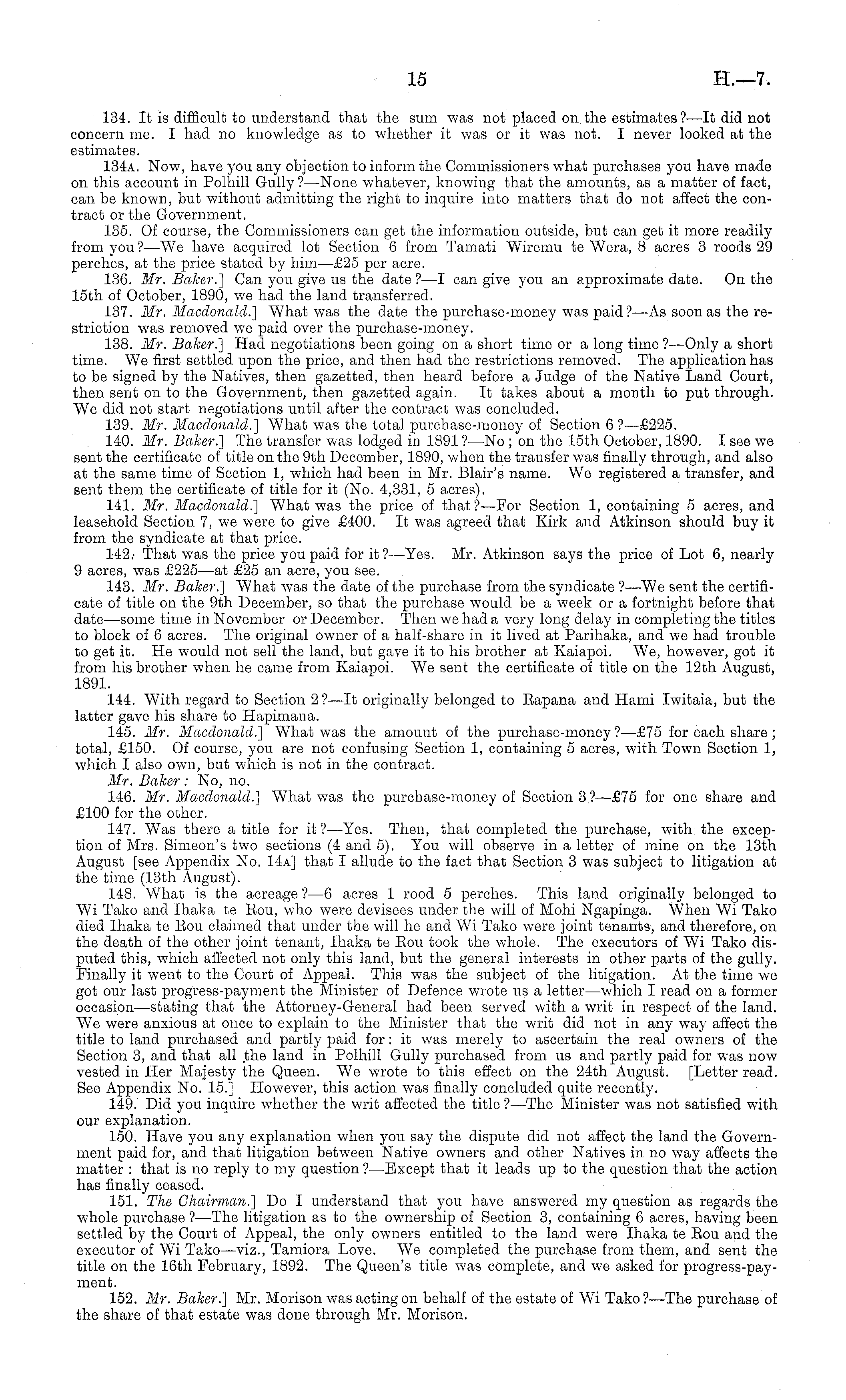 134. It is difficult to understand that the sum was not placed on the estimates?—lt did not concern me. I had no knowledge as to whether it was or it was not. I never looked at the estimates. 134 a. Now, have you any objection to inform the Commissioners what purchases you have made on this account in Polhill Gully ?—None whatever, knowing that the amounts, as a matter of fact, can be known, but without admitting the right to inquire into matters that do not affect the contract or the Government. 135. Of course, the Commissioners can get the information outside, but can get it more readily from you ?—We have acquired lot Section 6 from Tamati Wiremu te Wera, 8 acres 3 roods 29 perches, at the price stated by him—£2s per acre. 136. Mr. Baker.] Can you give us the date ? —I can give you an approximate date. On the 15th of October, 1890, we had the land transferred. 137. Mr. Macdonald.] What was the date the purchase-money was paid?—As soon as the restriction was removed we paid over the purchase-money. 138. Mr. Baker.] Had negotiations been going on a short time or a long time ?—Only a short time. We first settled upon the price, and then had the restrictions removed. The application has to be signed by the Natives, then gazetted, then heard before a Judge of the Native Land Court, then sent on to the Government, then gazetted again. It takes about a month to put through. We did not start negotiations until after the contract was concluded. 139. Mr. Macdonald.] What was the total purchase-money of Section 6 ? —£225. 140. Mr. Baker.] The transfer was lodged in 1891 ?—No ;on the 15th October, 1890. I see we sent the certificate of title on the 9th December, 1890, when the transfer was finally through, and also at the same time of Section 1, which had been in Mr. Blair's name. We registered a transfer, and sent them the certificate of title for it (No. 4,331, 5 acres). 141. Mr. Macdonald.] What was the price of that? —For Section 1, containing 5 acres, and leasehold Section 7, we were to give £400. It was agreed that Kirk and Atkinson should buy it from the syndicate at that price. 142: That was the price you paid for it?— Yes. Mr. Atkinson says the price of Lot 6, nearly 9 acres, was £225 —at £25 an acre, you see. 143. Mr. Baker.] What was the date of the purchase from the syndicate ?—We sent the certificate of title on the 9th December, so that the purchase would be a week or a fortnight before that date—some time in November or December. Then we had a very long delay in completing the titles to block of 6 acres. The original owner of a half-share in it lived at Parihaka, and we had trouble to get it. He would not sell the land, but gave it to his brother at Kaiapoi. We, however, got it from his brother when he came from Kaiapoi. We sent the certificate of title on the 12th August, 1891. 144. With regard to Section 2?—lt originally belonged to Rapana and Hami Iwitaia, but the latter gave his share to Hapimana. 145. Mr. Macdonald.] What was the amount of the purchase-money ?—£7s for each share ; total, £150. Of course, you are not confusing Section 1, containing 5 acres, with Town Section 1, which I also own, but which is not in the contract. Mr. Baker : No, no. 146. Mr. Macdonald.] What was the purchase-money of Section 3 ?—£7s for one share and £100 for the other. 147. Was there a title for it ?—Yes. Then, that completed the purchase, with the exception of Mrs. Simeon's two sections (4 and 5). You will observe in a letter of mine on the 13th August [see Appendix No. 14a] that I allude to the fact that Section 3 was subject to litigation at the time (13th August). 148. What is the acreage ?—6 acres 1 rood 5 perches. This land originally belonged to Wi Tako and Ihaka te Rou, who were devisees under the will of Mohi Ngapinga. When Wi Tako died Ihaka te Rou claimed that under the will he and Wi Tako were joint tenants, and therefore, on the death of the other joint tenant, Ihaka te Rou took the whole. The executors of Wi Tako disputed this, which affected not only this land, but the general interests in other parts of the gully. Finally it went to the Court of Appeal. This was the subject of the litigation. At the time we got our last progress-payment the Minister of Defence wrote us a letter—which I read on a former occasion—stating that the Attorney-General had been served with a writ in respect of the land. We were anxious at once to explain to the Minister that the writ did not in any way affect the title to land purchased and partly paid for: it was merely to ascertain the real owners of the Section 3, and that all the land in Polhill Gully purchased from us and partly paid for was now vested in Her Majesty the Queen. We wrote to this effect on the 24th August. [Letter read. See Appendix No. 15.] However, this action was finally concluded quite recently. 149. Did you inquire whether the writ affected the title ? —The Minister was not satisfied with our explanation. 150. Have you any explanation when you say the dispute did not affect the land the Government paid for, and that litigation between Native owners and other Natives in no way affects the matter : that is no reply to my question ?—Except that it leads up to the question that the action has finally ceased. 151. The Chairman.] Do I understand that you have answered my question as regards the whole purchase ?—The litigation as to the ownership of Section 3, containing 6 acres, having been settled by the Court of Apjpeal, the only owners entitled to the land were Ihaka te Rou and the executor of Wi Tako—viz., Tamiora Love. We completed the purchase from them, and sent the title on the 16th February, 1892. The Queen's title was complete, and we asked for progress-pay-ment. 152. Mr. Baker.] Mr. Morison was acting on behalf of the estate of Wi Tako ?—The purchase of the share of that estate was done through Mr. Morison.