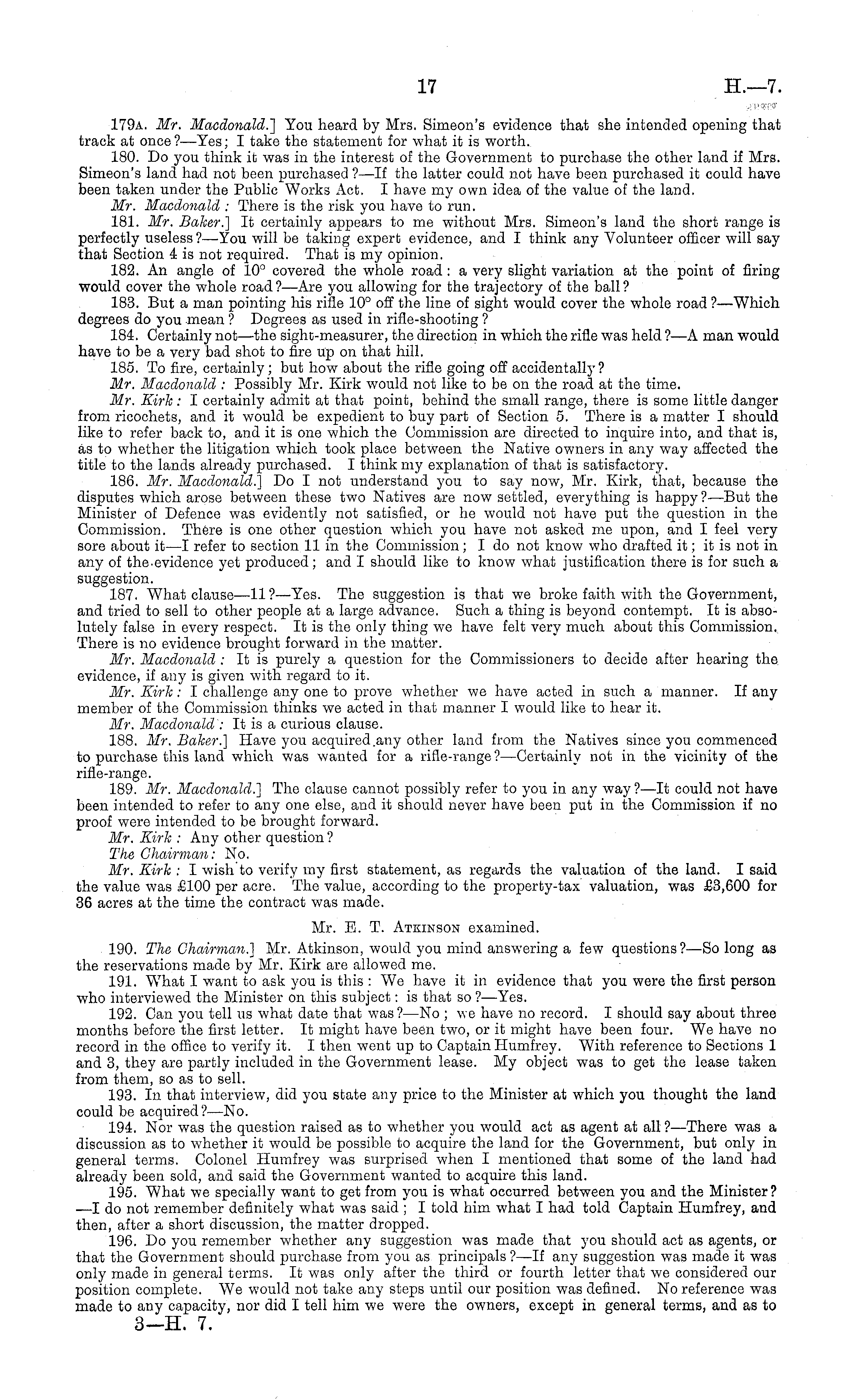 179 a. Mr. Macdonald.] You heard by Mrs. Simeon's evidence that she intended opening that track at once?— Yes; I take the statement for what it is worth. 180. Do you think it was in the interest of the Government to purchase the other land if Mrs. Simeon's land had not been purchased ?—lf the latter could not have been purchased it could have been taken under the Public Works Act. I have my own idea of the value of the land. Mr. Macdonald : There is the risk you have to run. 181. Mr. Baker.] It certainly appears to me without Mrs. Simeon's land the short range is perfectly useless ?—-You will be taking expert evidence, and I think any Volunteer officer will say that Section 4is not required. That is my opinion. 182. An angle of 10° covered the whole road : a very slight variation at the point of firing would cover the whole road?— Are you allowing for the trajectory of the ball? 183. But a man pointing his rifle 10° off the line of sight would cover the whole road ?—Which degrees do you mean ? Degrees as used in rifle-shooting ? 184. Certainly not—the sight-measurer, the direction in which the rifle was held ?—A man would have to be a very bad shot to fire up on that hill. 185. To fire, certainly ; but how about the rifle going off accidentally? Mr. Macdonald : Possibly Mr. Kirk would not like to be on the road at the time. Mr. Kirk: I certainly admit at that point, behind the small range, there is some little danger from ricochets, and it would be expedient to buy part of Section 5. There is a matter I should like to refer back to, and it is one which the Commission are directed to inquire into, and that is, as to whether the litigation which took place between the Native owners in any way affected the title to the lands already purchased. I think my explanation of that is satisfactory. 186. Mr. Macdonald.] Do I not understand you to say now, Mr. Kirk, that, because the disputes which arose between these two Natives are now settled, everything is happy ?—But the Minister of Defence was evidently not satisfied, or ho would not have put the question in the Commission. There is one other question which you have not asked me upon, and I feel very sore about it —I refer to section 11 in the Commission; Ido not know who drafted it; it is not in any of the-evidence yet produced; and I should like to know what justification there is for such a suggestion. 187. What clause —11? —Yes. The suggestion is that we broke faith with the Government, and tried to sell to other people at a large advance. Such a thing is beyond contempt. It is absolutely false in every respect. It is the only thing we have felt very much about this Commission. There is no evidence brought forward in the matter. Mr. Macdonald : It is purely a question for the Commissioners to decide after hearing the evidence, if any is given with regard to it. Mr. Kirk: I challenge any one to prove whether we have acted in such a manner. If any member of the Commission thinks we acted in that manner I would like to hear it. Mr. Macdonald : It is a curious clause. 188. Mr. Baker.] Have you acquired.any other land from the Natives since you commenced to purchase this land which was wanted for a rifle-range?— Certainly not in the vicinity of the rifle-range. 189. Mr. Macdonald.] The clause cannot possibly refer to you in any way?—lt could not have been intended to refer to any one else, and it should never have been put in the Commission if no proof were intended to be brought forward. Mr. Kirk : Any other question ? The Chairman: No. Mr. Kirk : I wish to verify my first statement, as regards the valuation of the land. I said the value was £100 per acre. The value, according to the property-tax valuation, was £3,600 for 36 acres at the time the contract was made. Mr. E. T. Atkinson examined. 190. The Chairman.] Mr. Atkinson, would you mind answering a few questions?—So long as the reservations made by Mr. Kirk are allowed mo. 191. What I want to ask you is this : We have it in evidence that you were the first person who interviewed the Minister on this subject: is that so ? —Yes. 192. Can you tell us what date that was? —No ;we have no record. I should say about three months before the first letter. It might have been two, or it might have been four. We have no record in the office to verify it. I then went up to Captain Humfrey. With reference to Sections 1 and 3, they are partly included in the Government lease. My object was to get the lease taken from them, so as to sell. 193. In that interview, did you state any price to the Minister at which you thought the land could be acquired?— No. 194. Nor was the question raised as to whether you would act as agent at all ?—There was a discussion as to whether it would be possible to acquire the land for the Government, but only in general terms. Colonel Humfrey was surprised when I mentioned that some of the land had already been sold, and said the Government wanted to acquire this land. 195. What we specially want to get from you is what occurred between you and the Minister? -—I do not remember definitely what was said ; I told him what I had told Captain Humfrey, and then, after a short discussion, the matter dropped. 196. Do you remember whether any suggestion was made that you should act as agents, or that the Government should purchase from you as principals ? —lf any suggestion was made it was only made in general terms. It was only after the third or fourth letter that we considered our position complete. We would not take any steps until our position was defined. No reference was made to any capacity, nor did I tell him we were the owners, except in general terms, and as to 3-H. 7.