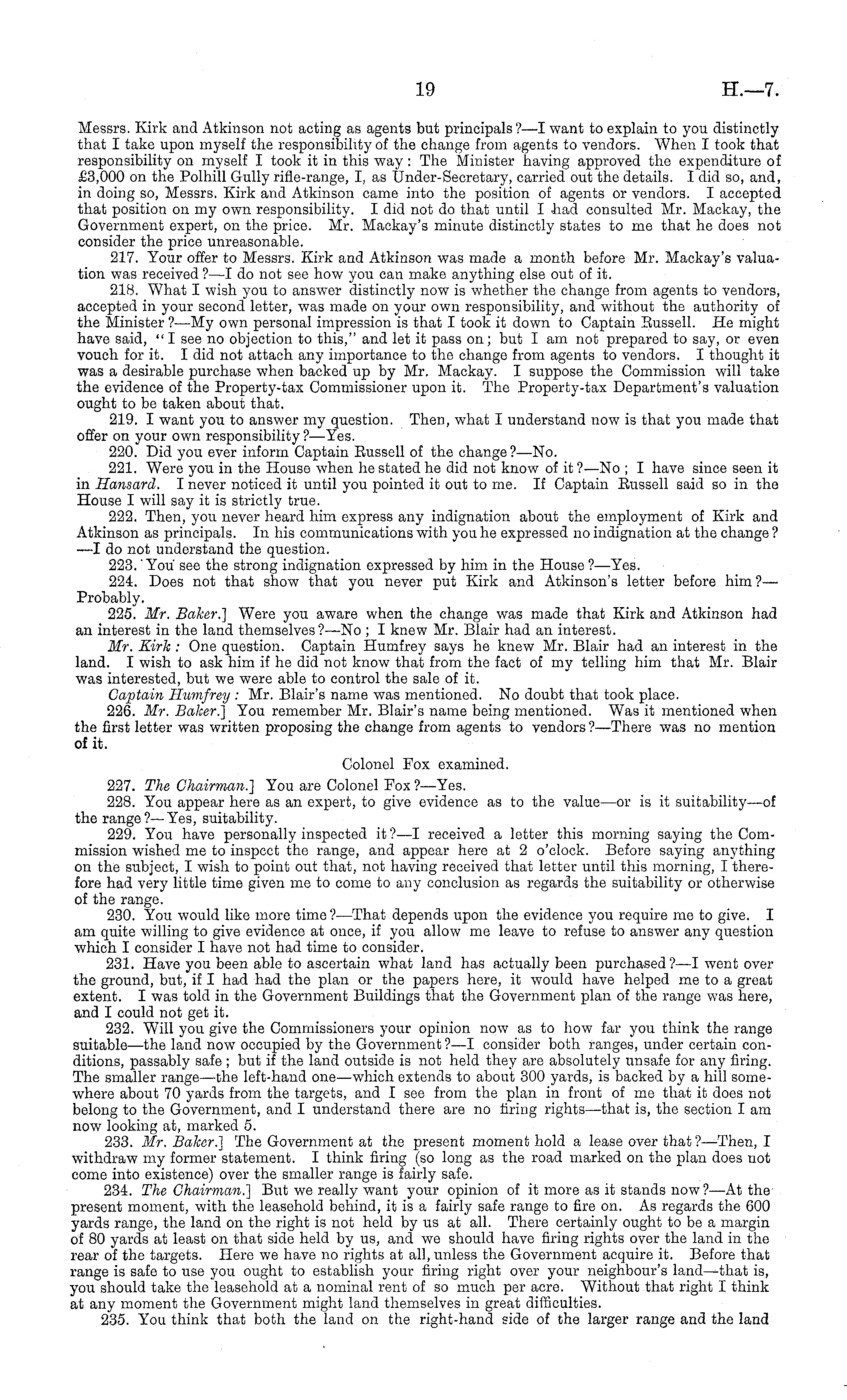 Messrs. Kirk and Atkinson not acting as agents but principals ?—I want to explain to you distinctly that I take upon myself the responsibility of the change from agents to vendors. When I took that responsibility on myself I took it in this way : The Minister having approved the expenditure of £3,000 on the Polhill Gully rifle-range, I, as Under-Secretary, carried out the details. I did so, and, in doing so, Messrs. Kirk and Atkinson came into the position of agents or vendors. I accepted that position on my own responsibility. I did not do that until I -had consulted Mr. Mackay, the Government expert, on the price. Mr. Mackay's minute distinctly states to me that he does not consider the price unreasonable. 217. Your offer to Messrs. Kirk and Atkinson was made a month before Mr. Mackay's valuation was received ?—I do not see how you can make anything else out of it. 218. What I wish you to answer distinctly now is whether the change from agents to vendors, accepted in your second letter, was made on your own responsibility, and without the authority of the Minister?—My own personal impression is that I took it down to Captain Russell. He might have said, " I see no objection to this," and let it pass on; but I am not prepared to say, or even vouch for it. I did not attach any importance to the change from agents to vendors. I thought it was a desirable purchase when backed up by Mr. Mackay. I suppose the Commission will take the evidence of the Property-tax Commissioner upon it. The Property-tax Department's valuation ought to be taken about that. 219. I want you to answer my question. Then, what I understand now is that you made that offer on your own responsibility ?—Yes. 220. Did you ever inform Captain Russell of the change?— No. 221. Were you in the House when he stated he did not know of it ?—No ; I have since seen it in Hansard. I never noticed it until you pointed it out to me. If Captain Russell said so in the House I will say it is strictly true. 222. Then, you never heard him express any indignation about the employment of Kirk and Atkinson as principals. In his communications with you he expressed no indignation at the change ? —I do not understand the question. 223. You see the strong indignation expressed by him in the House ?—Yes. 224. Does not that show that you never put Kirk and Atkinson's letter before him ?—• Probably. 225. Mr. Baker.] Were you aware when the change was made that Kirk and Atkinson had an interest in the land themselves? —No ; I knew Mr. Blair had an interest. Mr. Kirk : One question. Captain Humfrey says he knew Mr. Blair had an interest in the land. I wish to ask him if he did not know that from the fact of my telling him that Mr. Blair was interested, but we were able to control the sale of it. Captain Humfrey : Mr. Blair's name was mentioned. No doubt that took place. 226. Mr. Baker.] You remember Mr. Blair's name being mentioned. Was it mentioned when the first letter was written proposing the change from agents to vendors ?—There was no mention of it. Colonel Fox examined. 227. The Chairman.] You are Colonel Fox ? —Yes. 228. You appear here as an expert, to give evidence as to the value—or is it suitability—of the range? —Yes, suitability. 229. You have personally inspected it ?—I received a letter this morning saying the Commission wished me to inspect the range, and appear here at 2 o'clock. Before saying anything on the subject, I wish to point out that, not having received that letter until this morning, I therefore had very little time given me to come to any conclusion as regards the suitability or otherwise of the range. 230. You would like more time ?—That depends upon the evidence you require me to give. I am quite willing to give evidence at once, if you allow me leave to refuse to answer any question which I consider I have not had time to consider. 231. Have you been able to ascertain what land has actually been purchased?—l went over the ground, but, if I had had the plan or the papers here, it would have helped me to a great extent. I was told in the Government Buildings that the Government plan of the range was here, and I could not get it. 232. Will you give the Commissioners your opinion now as to how far you think the range suitable—the land now occupied by the Government ?—I consider both ranges, under certain conditions, passably safe; but if the land outside is not held they are absolutely unsafe for any firing. The smaller range —the left-hand one—which extends to about 300 yards, is backed by a hill somewhere about 70 yards from the targets, and I see from the plan in front of me that it does not belong to the Government, and I understand there are no firing rights—that is, the section I am now looking at, marked 5. 233. Mr. Baker.] The Government at the present moment hold a lease over that ?—Then, I withdraw my former statement. I think firing (so long as the road marked on the plan does not come into existence) over the smaller range is fairly safe. 234. The But we really want your opinion of it more as it stands now?—At the present moment, with the leasehold behind, it is a fairly safe range to fire on. As regards the 600 yards range, the land on the right is not held by us at all. There certainly ought to be a margin of 80 yards at least on that side held by us, and we should have firing rights over the land in the rear of the targets. Here we have no rights at all, unless the Government acquire it. Before that range is safe to use you ought to establish your firing right over your neighbour's land—that is, you should take the leasehold at a nominal rent of so much per acre. Without that right I think at any moment the Government might land themselves in great difficulties. 235. You think that both the land on the right-hand side of the larger range and the land