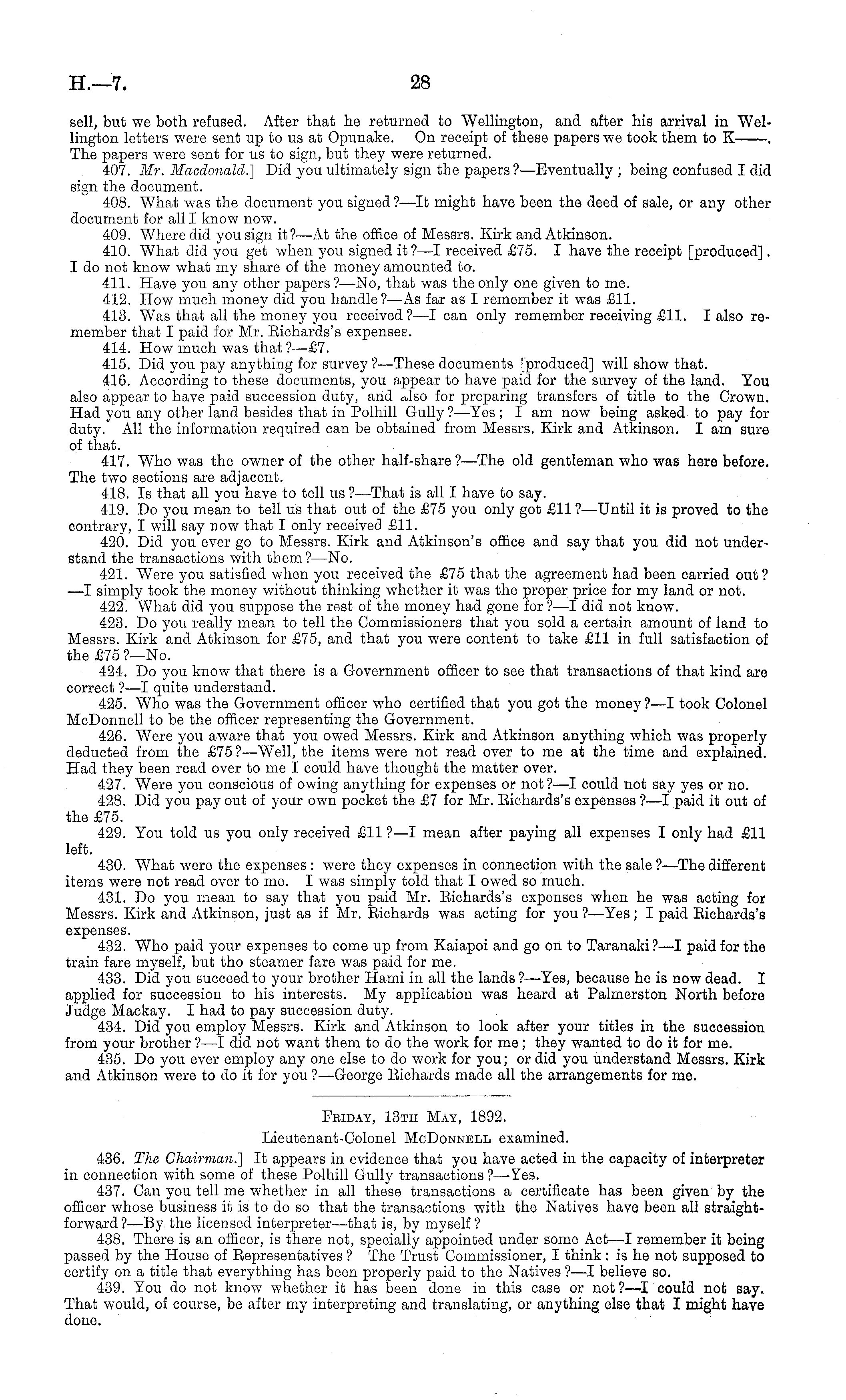 Friday, 13th May, 1892. Lieutenant-Colonel McDonnell examined. 436. The Chairman.] It appears in evidence that you have acted in the capacity of interpreter in connection with some of these Polhill Gully transactions? —Yes. 437. Can you tell me whether in all these transactions a certificate has been given by the officer whose business it is to do so that the transactions with the Natives have been all straightforward?—By the licensed interpreter—that is, by myself? 438. There is an officer, is there not, specially appointed under some Act—l remember it being passed by the House of Representatives ? The Trust Commissioner, I think: is he not supposed to certify on a title that everything has been properly paid to the Natives ?—I believe so. 439. You do not know whether it has been done in this case or not?—l could not say. That would, of course, be after my interpreting and translating, or anything else that I might have done.