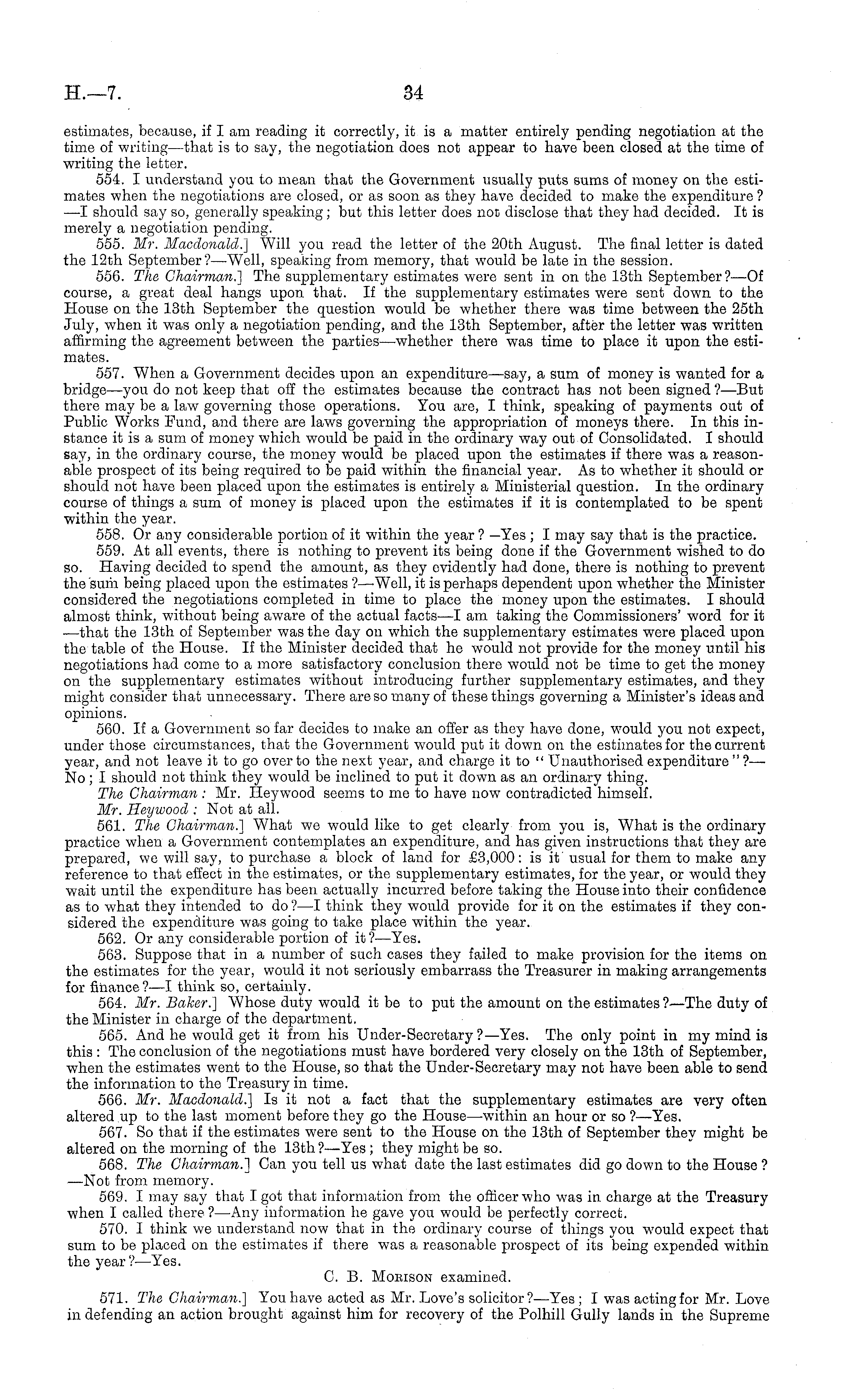 estimates, because, if I am reading it correctly, it is a matter entirely pending negotiation at the time of writing—that is to say, the negotiation does not appear to have been closed at the time of writing the letter. 554. I understand you to mean that the Government usually puts sums of money on the estimates when the negotiations are closed, or as soon as they have decided to make the expenditure ? —I should say so, generally speaking ; but this letter does not disclose that they had decided. It is merely a negotiation pending. 555. Mr. Macdonald.] Will you read the letter of the 20th August. The final letter is dated the 12th September?— Well, speaking from memory, that would be late in the session. 556. The Chairman.] The supplementary estimates were sent in on the 13th September?—Of course, a great deal hangs upon that. If the supplementary estimates were sent down to the House on the 13th September the question would be whether there was time between the 25th July, when it was only a negotiation pending, and the 13th September, after the letter was written affirming the agreement between the parties—whether there was time to place it upon the estimates. 557. When a Government decides upon an expenditure—say, a sum of money is wanted for a bridge—you do not keep that off the estimates because the contract has not been signed ? —But there may be a law governing those operations. You are, I think, speaking of payments out of Public Works Fund, and there are laws governing the appropriation of moneys there. In this instance it is a sum of money which would be paid in the ordinary way out of Consolidated. I should say, in the ordinary course, the money would be placed upon the estimates if there was a reasonable prospect of its being required to be paid within the financial year. As to whether it should or should not have been placed upon the estimates is entirely a Ministerial question. In the ordinary course of things a sum of money is placed upon the estimates if it is contemplated to be spent within the year. 558. Or any considerable portion of it within the year ? —Yes ; I may say that is the practice. 559. At all events, there is nothing to prevent its being done if the Government wished to do so. Having decided to spend the amount, as they evidently had done, there is nothing to prevent the sum being placed upon the estimates ? —Well, it is perhaps dependent upon whether the Minister considered the negotiations completed in time to place the money upon the estimates. I should almost think, without being aware of the actual facts—l am taking the Commissioners' word for it —that the 13th of September was the day on which the supplementary estimates were placed upon the table of the House. If the Minister decided that he would not provide for the money until his negotiations had come to a more satisfactory conclusion there would not be time to get the money on the supplementary estimates without introducing further supplementary estimates, and they might consider that unnecessary. There are so many of these things governing a Minister's ideas and opinions. 560. If a Government so far decides to make an offer as they have done, would you not expect, under those circumstances, that the Government would put it down on the estimates for the current year, and not leave it to go over to the next year, and charge it to " Unauthorised expenditure " ?—- No ; I should not think they would be inclined to put it down as an ordinary thing. The Chairman : Mr. Heywood seems to me to have now contradicted himself. Mr. Heywood : Not at all. 561. The Chairman.] What we would like to get clearly from you is, What is the ordinary practice when a Government contemplates an expenditure, and has given instructions that they are prepared, we will say, to purchase a block of land for £3,000: is it usual for them to make any reference to that effect in the estimates, or the supplementary estimates, for the year, or would they wait until the expenditure has been actually incurred before taking the House into their confidence as to what they intended to do ?—I think they would provide for it on the estimates if they considered the expenditure was going to take place within the year. 562. Or any considerable portion of it?— Yes. 563. Suppose that in a number of such cases they failed to make provision for the items on the estimates for the year, would it not seriously embarrass the Treasurer in making arrangements for finance ?—I think so, certainly. 564. Mr. Baker.] Whose duty would it be to put the amount on the estimates?— The duty of the Minister in charge of the department. 565. And he would get it from his Under-Secretary ?—Yes. The only point in my mind is this : The conclusion of the negotiations must have bordered very closely on the 13th of September, when the estimates went to the House, so that the Under-Secretary may not have been able to send the information to the Treasury in time. 566. Mr. Macdonald.] Is it not a fact that the supplementary estimates are very often altered up to the last moment before they go the House—within an hour or so ? —Yes. 567. So that if the estimates were sent to the House on the 13th of September they might be altered on the morning of the 13th?—Yes ; they might be so. 568. The Chairman.] Can you tell us what date the last estimates did go down to the House ? —Not from memory. 569. I may say that I got that information from the officer who was in charge at the Treasury when I called there ? —Any information he gave you would be perfectly correct. 570. I think we understand now that in the ordinary course of things you would expect that sum to be placed on the estimates if there was a reasonable prospect of its being expended within the year? —Yes. C. B. Morison examined. 571. The Chairman.] You have acted as Mr. Love's solicitor ?—Yes; I was acting for Mr. Love in defending an action brought against him for recovery