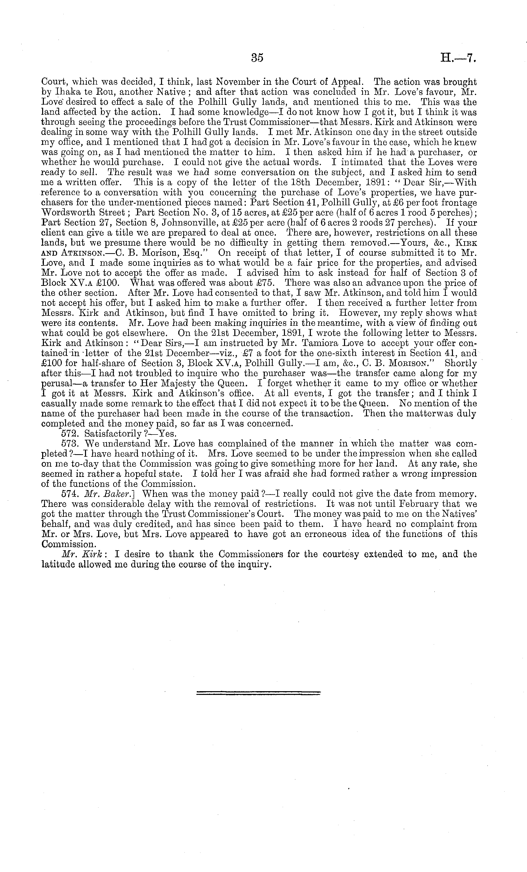 Court, which was decided, I think, last November in the Court of Appeal. The action was brought by Ihaka te Rou, another Native ; and after that action was concluded in Mr. Love's favour, Mr. Love desired to effect a sale of the Polhill Gully lands, and mentioned this to me. This was the land affected by the action. I had some knowledge—l do not know how I got it, but I think it was through seeing the proceedings before the Trust Commissioner —that Messrs. Kirk and Atkinson were dealing in some way with the Polhill Gully lands. I met Mr. Atkinson one day in the street outside my office, and I mentioned that I had got a decision in Mr. Love's favour in the case, which he knew was going on, as I had mentioned the matter to him. I then asked him if he had a purchaser, or whether he would purchase. I could not give the actual words. I intimated that the Loves were ready to sell. The result was we had some conversation on the subject, and I asked him to send me a written offer. This is a copy of the letter of the 18th December, 1891: " Dear Sir, —With reference to a conversation with you concerning the purchase of Love's properties, we have purchasers for the under-mentioned pieces named: Part Section 41, Polhill Gully, at £6 per foot frontage Wordsworth Street; Part Section No. 3, of 15 acres, at £25 per acre (half of 6 acres 1 rood 5 perches); Part Section 27, Section 8, Johnsonville, at £25 per acre (half of 6 acres 2 roods 27 perches). If your client can give a title we are prepared to deal at once. There are, however, restrictions on all these lands, but we presume there would be no difficulty in getting them removed.—Yours, &c, Kirk and Atkinson.—C. B. Morison, Esq." On receipt of that letter, lof course submitted it to Mr. Love, and I made some inquiries as to what would be a fair price for the properties, and advised Mr. Love not to accept the offer as made. I advised him to ask instead for half of Section 3of Block XV.a £100. What was offered was about £75. There was also an advance upon the price of the other section. After Mr. Love had consented to that, I saw Mr. Atkinson, and told him I would not accept his offer, but I asked him to make a further offer. I then received a further letter from Messrs. Kirk and Atkinson, but find I have omitted to bring it. However, my reply shows what were its contents. Mr. Love had been making inquiries in the meantime, with a view of finding out what could be got elsewhere. On the 21st December, 1891, I wrote the following letter to Messrs. Kirk and Atkinson : "Dear Sirs, —I am instructed by Mr. Tamiora Love to accept your offer contained in letter of the 21st December —viz., £7 a foot for the one-sixth interest in Section 41, and £100 for half-share of Section 3, Block XV.a, Polhill Gully.—l am, &c, C. B. Morison." Shortly after this—l had not troubled to inquire who the purchaser was—the transfer came along for my perusal—a transfer to Her Majesty the Queen. I forget whether it came to my office or whether I got it at Messrs. Kirk and Atkinson's office. At all events, I got the transfer; and I think I casually made some remark to the effect that I did not expect it to be the Queen. No mention of the name of the purchaser had been made in the course of the transaction. Then the matterwas duly completed and the money paid, so far as I was concerned. 572. Satisfactorily ?—Yes. 573. We understand Mr. Love has complained of the manner in which the matter was completed?—l have heard nothing of it. Mrs. Love seemed to be under the impression when she called on me to-day that the Commission was going to give something more for her land. At any rate, she seemed in rather a hopeful state. I told her I was afraid she had formed rather a wrong impression of the functions of the Commission. 574. Mr. Baker.] When was the money paid ? —I really could not give the date from memory. There was considerable delay with the removal of restrictions. It was not until February that we got the matter through the Trust Commissioner's Court. The money was paid to me on the Natives' behalf, and was duly credited, and has since been paid to them. I have heard no complaint from Mr. or Mrs. Love, but Mrs. Love appeared to have got an erroneous idea of the functions of this Commission. Mr. Kirk : I desire to thank the Commissioners for the courtesy extended to me, and the latitude allowed me during the course of the inquiry.