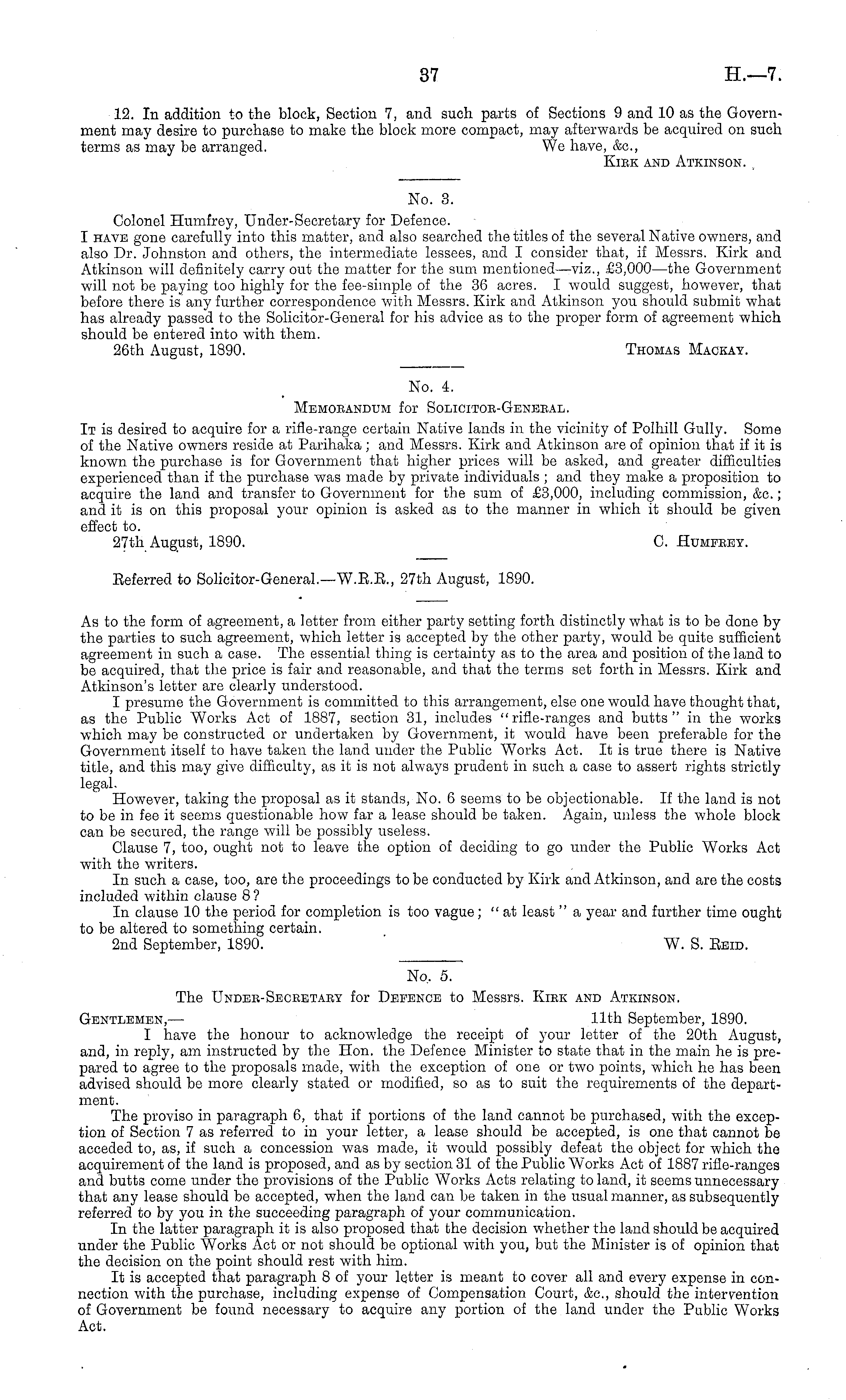 No. 3. Colonel Humfrey, Under-Secretary for Defence. I have gone carefully into this matter, and also searched the titles of the several Native owners, and also Dr. Johnston and others, the intermediate lessees, and I consider that, if Messrs. Kirk and Atkinson will definitely carry out the matter for the sum mentioned—viz., £3,000 —the Government will not be paying too highly for the fee-simple of the 36 acres. I would suggest, however, that before there is any further correspondence with Messrs. Kirk and Atkinson you should submit what has already passed to the Solicitor-General for his advice as to the proper form of agreement which should be entered into with them. 26th August, 1890. Thomas Mackay.