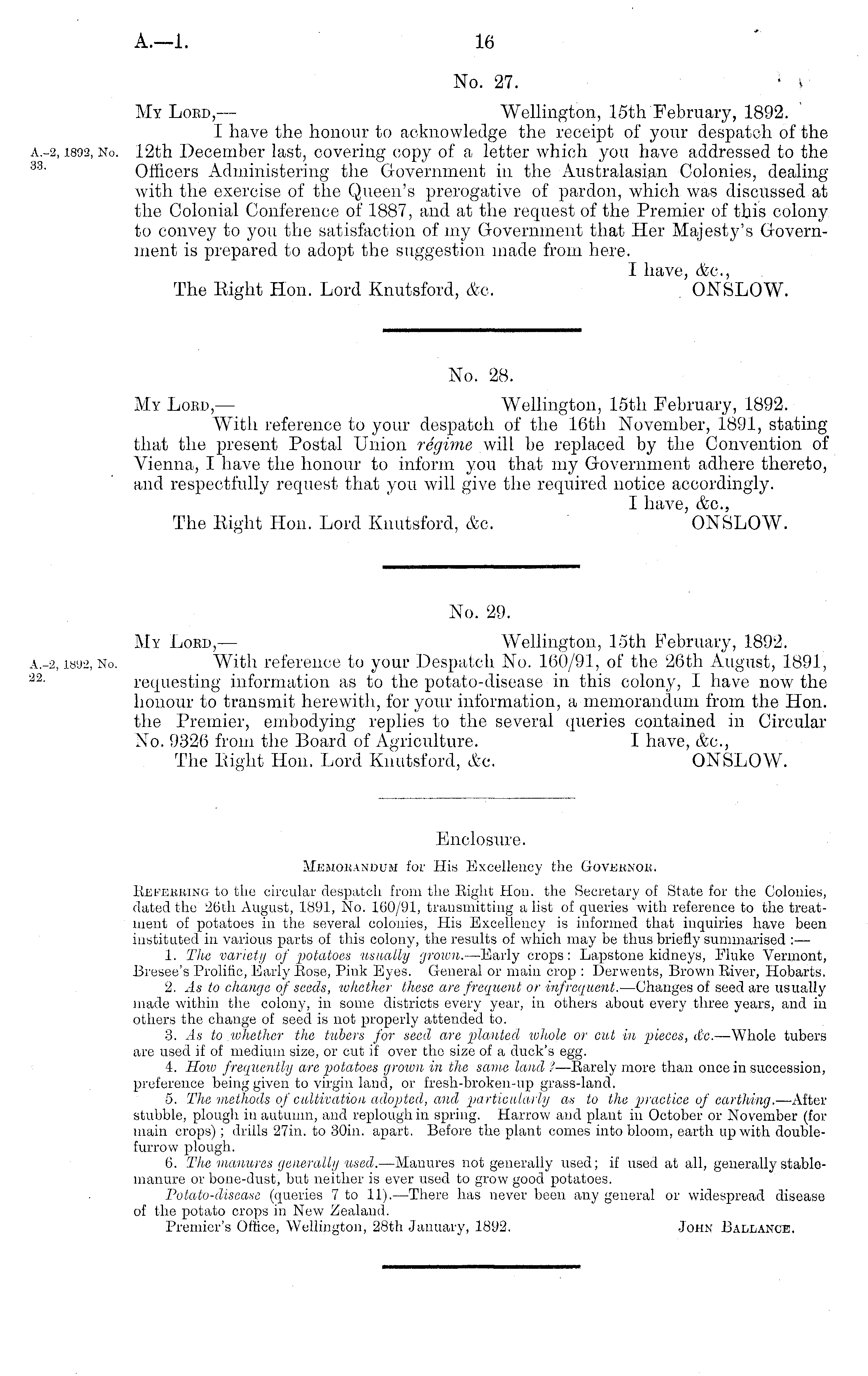 Enclosure. Memorandum for His Excellency the Governor. Befekring to the circular despatch from the Bight Hon. the Secretary of State for the Colonies, dated the 26th August, 1891, No. 160/91, transmitting a list of queries with reference to the treatment of potatoes in the several colonies, His Excellency is informed that inquiries have been instituted in various parts of this colony, the results of which may be thus briefly summarised :— 1. The variety of potatoes usually grown. —Early crops: Lapstone kidneys, Fluke Vermont, Bresee's Prolific, Early Bose, Pink Eyes. General or main crop : Derwents, Brown Biver, Hobarts. 2. As to change of seeds, whether these are frequent or infrequent. —Changes of seed are usually made within the colony, in some districts every year, in others about every three years, and in others the change of seed is not properly attended to. 3. As to whether the tubers for seed are -planted wliole or cut in pieces, dtc, —Whole tubers are used if of medium size, or cut if over the size of a duck's egg. 4. How frequently are potatoes grown in the same land ? —Barely more than once in succession, preference being given to virgin land, or fresh-broken-up grass-land. 5. The methods of cultivation adopted, and particularly as to the practice of earthing. —After stubble, plough in autumn, and reploughin spring. Harrow and plant in October or November (for main crops); drills 27in. to 30in. apart. Before the plant comes into bloom, earth up with doublefurrow plough. 6. The manures generally used. —Manures not generally used; if used at all, generally stablemanure or bone-dust, but neither is ever used to grow good potatoes. Potato-disease (queries 7 to 11). —There has never been any general or widespread disease of the potato crops in New Zealand. Premier's Office, Wellington, 28th January, 1892. John Ballance.