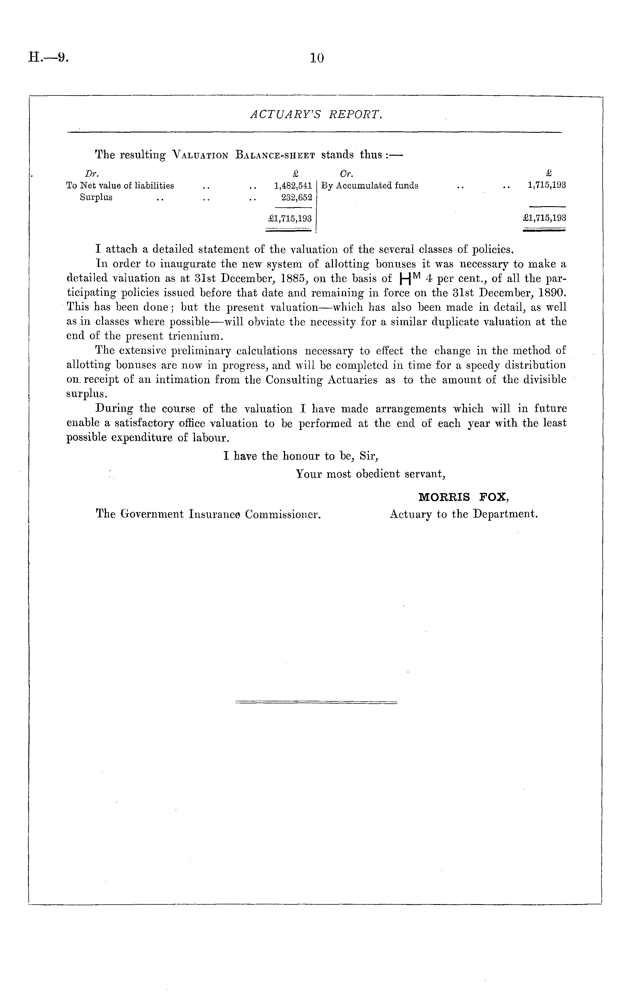 ACTUARY'S REPORT. The resulting Valuation Balance-sheet stands thus : — Dr. £ Cr. £ To Net value of liabilities .. .. 1,482,541 By Accumulated funds .. .. 1,715,193 Surplus .. .. .. 232,652 £1,715,193 £1,715,193 I attach a detailed statement of the valuation of the several classes of policies. In order to inaugurate the new system of allotting bonuses it was necessary to make a detailed valuation as at 31st December, 1885, on the basis of |— \ M 4 per cent., of all the participating policies issued before that date and remaining in force on the 31st December, 1890. This has been done; but the present valuation —which has also been made in detail, as well as in classes where possible—will obviate the necessity for a similar duplicate valuation at the end of the present triennium. The extensive preliminary calculations necessary to effect the change in the method of allotting bonuses are now in progress, and will be completed in time for a speedy distribution on. receipt of an intimation from the Consulting Actuaries as to the amount of the divisible surplus. During the course of the valuation I have made arrangements which will in future enable a satisfactory office valuation to be performed at the end of each year with the least possible expenditure of labour. I have the honour to be, Sir, '. Your most obedient servant, MORRIS FOX, The Government Insurance Commissioner. Actuary to the Department.