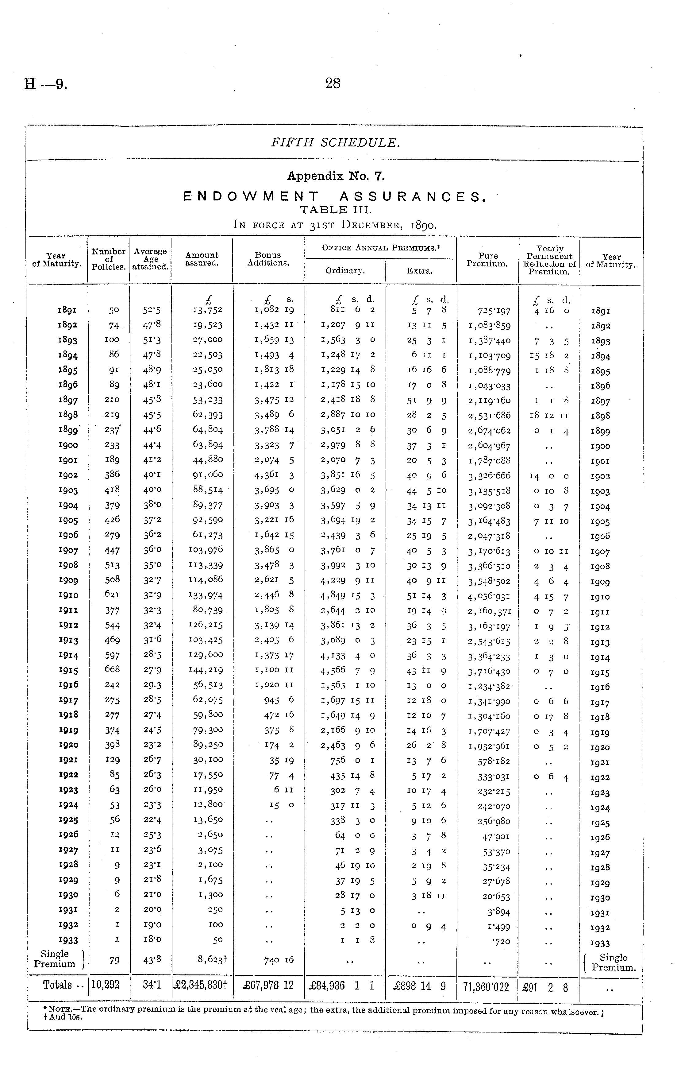 FIFTH SCHEDULE. Appendix No. 7. ENDOWMENT ASSURANCES. TABLE III. In force at 31st December, 1890.