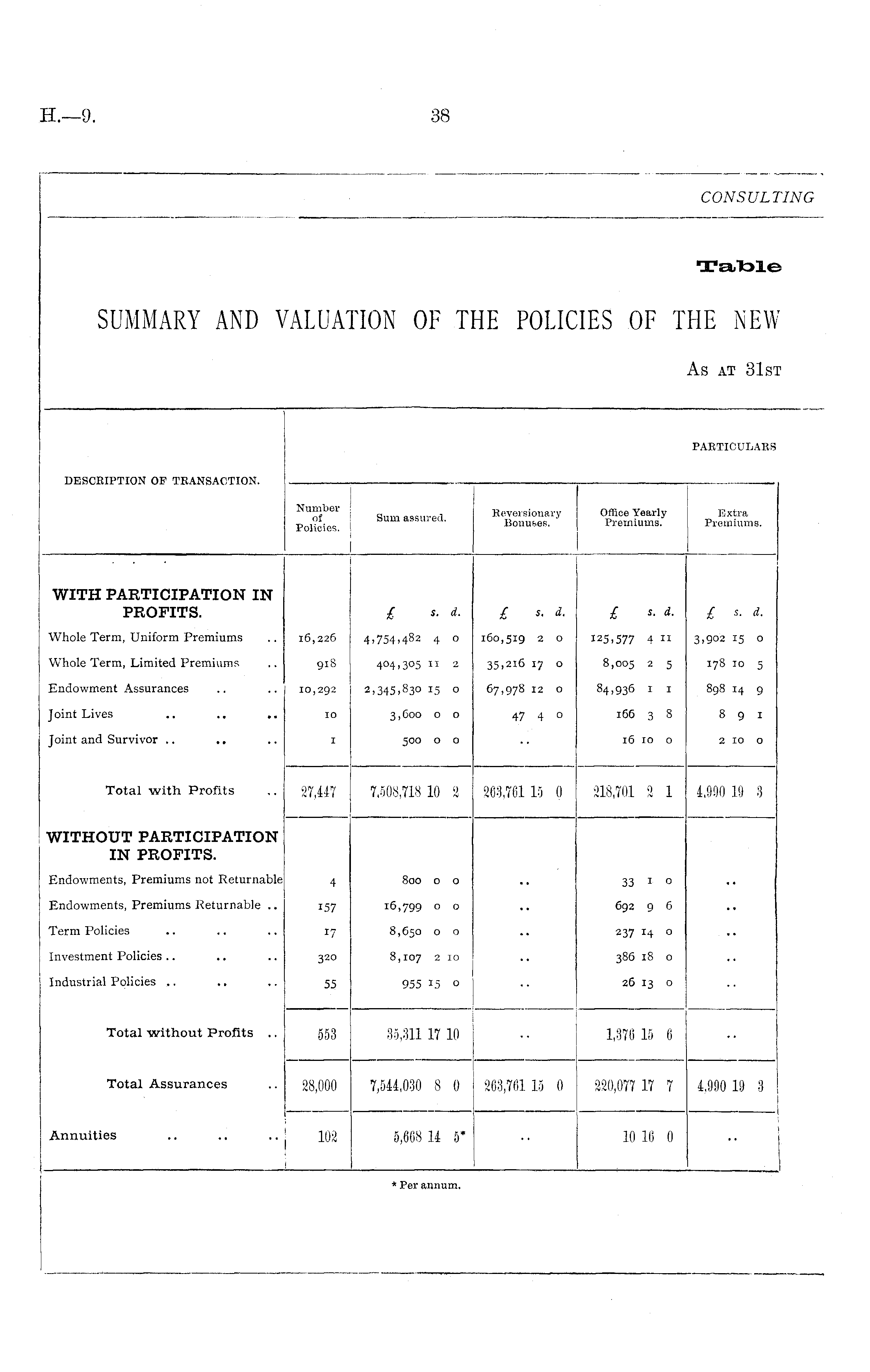 PARTICULARS DESCRIPTION OP TRANSACTION. Number of Policies. Sum assured. Reversionary Bonuses. Office Yearly Premiums. Extra Premiums. WITH PARTICIPATION IN PROFITS. £ s. d. £ s. d. £ s. d. £ s. d. Whole Term, Uniform Premiums 16,226 4,754,482 4 o 160,519 2 o 125,577 4 11 3,902 15 o Whole Term, Limited Premiums 918 404,305 11 2 35,216 17 o 8,005 2 5 178 10 5 Endowment Assurances 10,292 2,345,830 15 o 67,978 12 O 84,936 I 1 898 14 9 Joint Lives .. .. .. 10 3,600 o o 47 4 o 166 3 8 8 9 1 Joint and Survivor .. 1 500 o o 16 10 o 2 IO o Total with Profits 27,447 7,508,718 10 2 263,761 15 0 218,701 2 1 4,990 19 3 WITHOUT PARTICIPATION IN PROFITS. Endowments, Premiums not Returnable 4 800 o o 33 I o Endowments, Premiums Returnable .. 157 16,799 o o 692 9 6 Term Policies 17 8,650 o o 237 14 o Investment Policies 320 8,107 2 I0 386 18 o Industrial Policies 55 955 15 o 26 13 o i Total -without Profits .. 553 35,311 17 10 1,376 15 6 Total Assurances 28,000 7,544,030 8 0 263,761 13 0 220,077 17 7 4,990 19 3 Annuities 102 5,608 14 5* 10 16 0 *Per inum