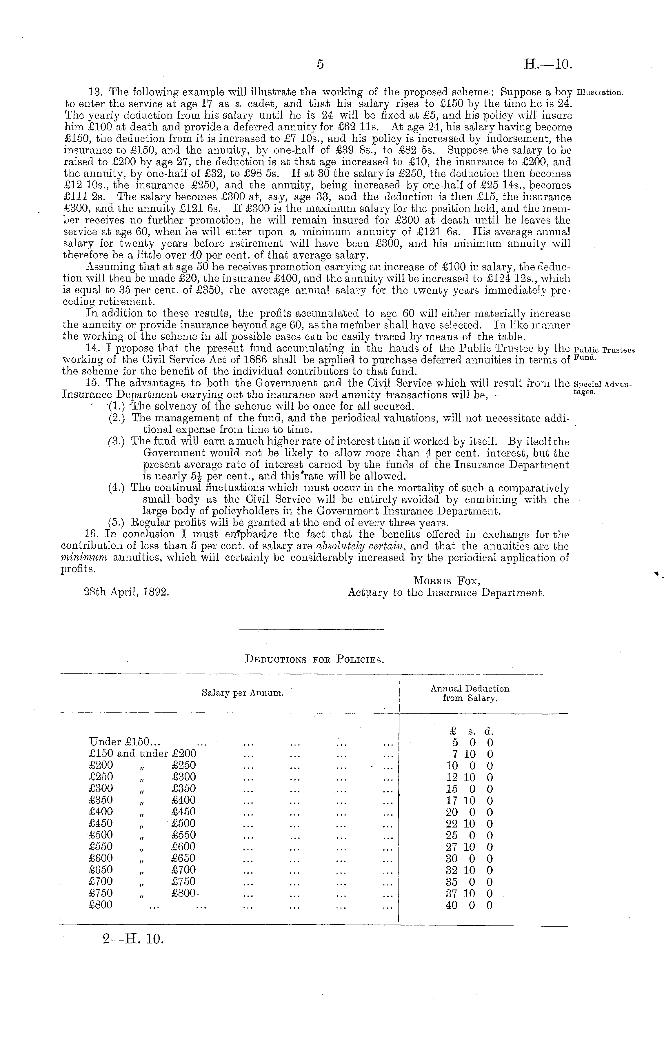13. The following example will illustrate the working of the proposed scheme : Suppose a boy to enter the service at age 17 as a cadet, and that his salary rises to £150 by the time he is 24. The yearly deduction from his salary until he is 24 will be fixed at £5, and his policy will insure him £100 at death and provide a deferred annuity for £62 lis. At age 24, his salary having become £150, the deduction from it is increased to £7 10s., and his policy is increased by indorsement, the insurance to £150, and the annuity, by one-half of £39 Bs., to £82 ss. Suppose the salary to be raised to £200 by age 27, the deduction is at that age increased to £10, the insurance to £200, and the annuity, by one-half of £32, to £98 ss. If at 30 the salary is £250, the deduction then becomes £12 10s., the insurance £250, and the annuity, being increased by one-half of £25 145., becomes £111 2s. The salary becomes £300 at, say, age 33, and the deduction is then £15, the insurance £300, and the annuity £121 6s. If £300 is the maximum salary for the position held, and the member receives no further promotion, he will remain insured for £300 at death until he leaves the service at age 60, when he will enter upon a minimum annuity of £121 6s. His average annual salary for twenty years before retirement will have been £300, and his minimum annuity will therefore be a little over 40 per cent, of that average salary. Assuming that at age 50 he receives promotion carrying an increase of £100 in salary, the deduction will then be made £20, the insurance £400, and the annuity will be increased to £124 125., which is equal to 35 per, cent, of £350, the average annual salary for the twenty years immediately preceding retirement. In addition to these results, the profits accumulated to age 60 will either materially increase the annuity or provide insurance beyond age 60, as the member shall have selected. In like manner the working of the scheme in all possible cases can be easily traced by means of the table. 14. I propose that the present fund accumulating in the hands of the Public Trustee by the working of the Civil Service Act of 1886 shall be applied to purchase deferred annuities in terms of the scheme for the benefit of the individual contributors to that fund. 15. The advantages to both the Government and the Civil Service which will result from the Insurance Department carrying out the insurance and annuity transactions will be, — •(1.) The solvency of the scheme will be once for all secured. (2.) The management of the fund, and the periodical valuations, will not necessitate additional expense from time to time. (3.) The fund will earn a much higher rate of interest than if worked by itself. By itself the Government would not be likely to allow more than 4 per cent, interest, but the present average rate of interest earned by the funds of the Insurance Department is nearly 5J per cent., and this'rate will be allowed. (4.) The continual fluctuations which must occur in the mortality of such a comparatively small body as the Civil Service will be entirely avoided by combining with the large body of policyholders in the Government Insurance Department. (5.) Eegular profits will be granted at the end of every three years. 16. In conclusion I must eiriphasize the fact that the benefits offered in exchange for the contribution of less than 5 per cent, of salary are absolutely certain, and that the annuities are the minimum annuities, which will certainly be considerably increased by the periodical application of profits. Morris Fox, 28th April, 1892. Actuary to the Insurance Department.
