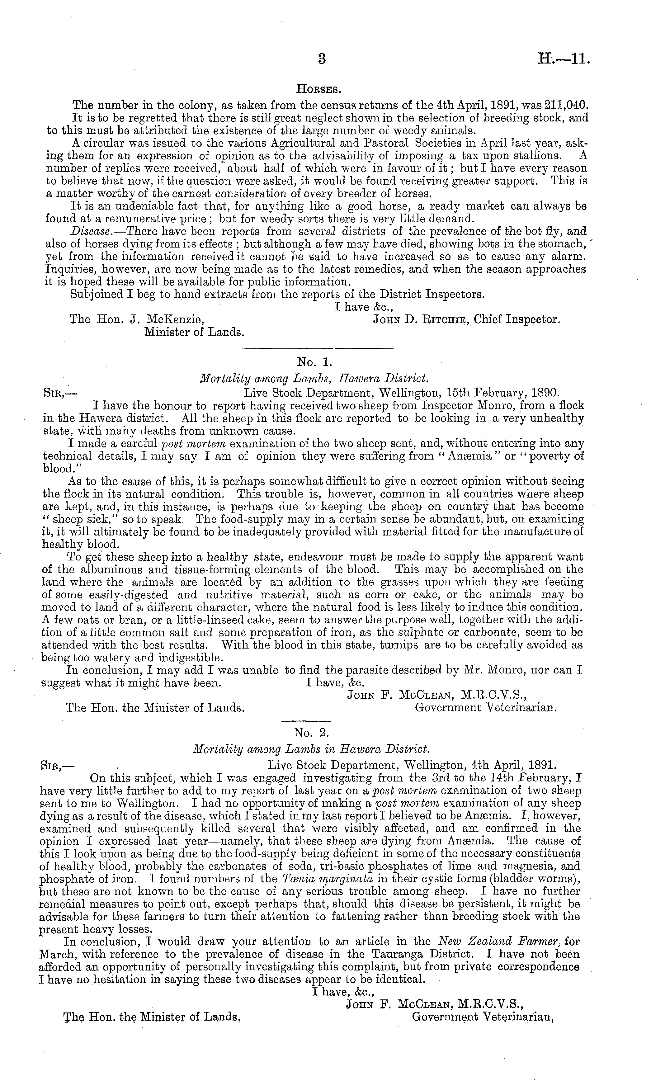 No. 2. Mortality among Lambs in Hawera District. Sir, — . Live Stock Department, Wellington, 4th April, 1891. On this subject, which I was engaged investigating from the 3rd to the 14th February, I have very little further to add to my report of last year on a post mortem examination of two sheep sent to me to Wellington. I had no opportunity of making a post mortem examination of any sheep dying as a result of the disease, which I stated in my last report I believed to be Anaemia. I, however, examined and subsequently killed several that were visibly affected, and am confirmed in the opinion I expressed last year—namely, that these sheep are dying from Anaemia. The cause of this I look upon as being due to the food-supply being deficient in some of the necessary constituents of healthy blood, probably the carbonates of soda, tri-basic phosphates of lime and magnesia, and phosphate of iron. I found numbers of the Taenia marginata in their cystic forms (bladder worms), but these are not known to be the cause of any serious trouble among sheep. I have no further remedial measures to point out, except perhaps that, should this disease be persistent, it might be advisable for these farmers to turn their attention to fattening rather than breeding stock with the present heavy losses. In conclusion, I would draw your attention to an article in the New Zealand Farmer, for March, with reference to the prevalence of disease in the Tauranga District. I have not been afforded an opportunity of personally investigating this complaint, but from private correspondence I have no hesitation in saying these two diseases appear to be identical. I have, &c, John F. McClean, M.8.C.V.5., The Hon. the Minister of Lands. Government Veterinarian,