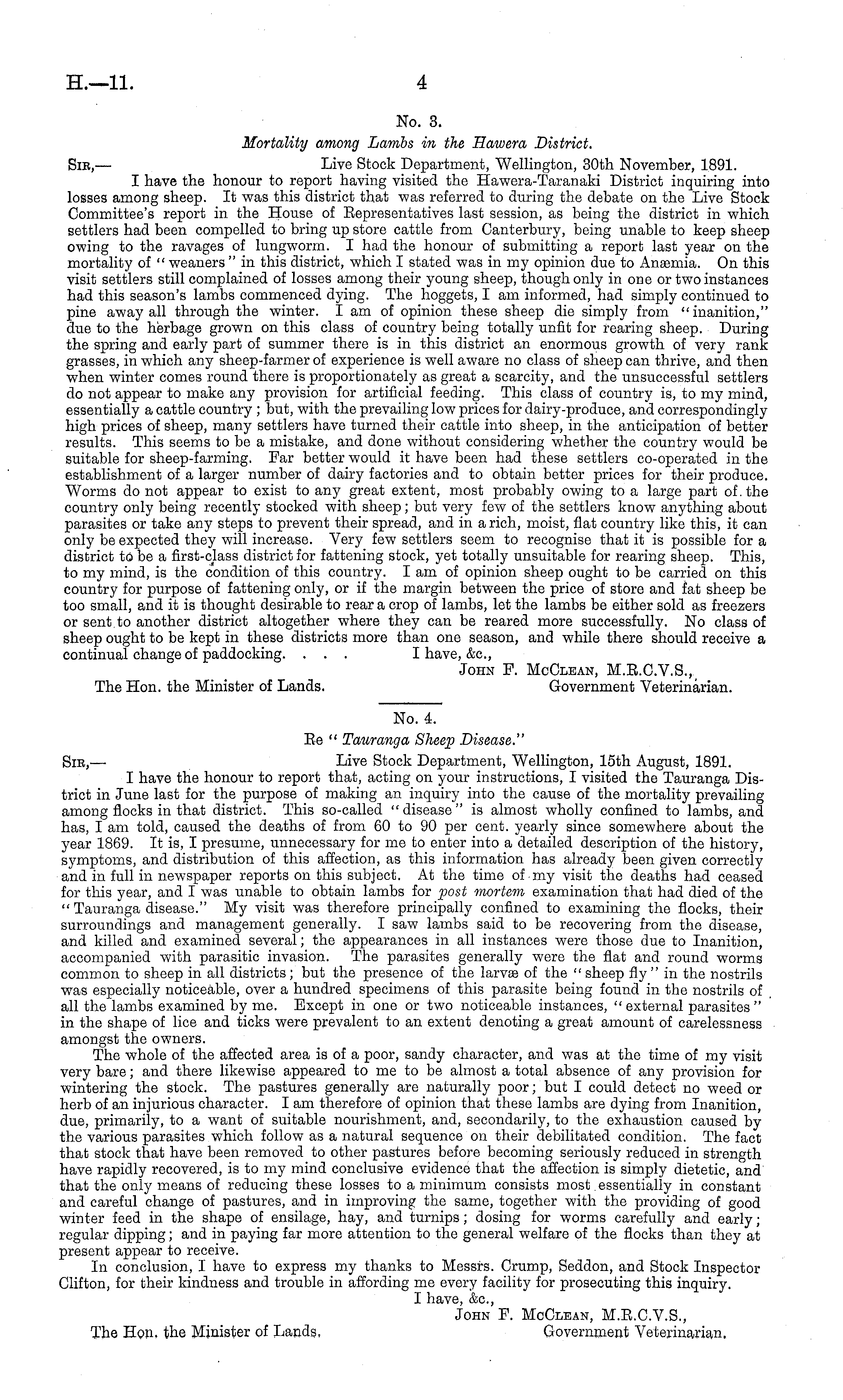 No. 4. Be " Tauranga Sheep Disease." Sir, —■ Live Stock Department, Wellington, 15th August, 1891. I have the honour to report that, acting on your instructions, I visited the Tauranga District in June last for the purpose of making an inquiry into the cause of the mortality prevailing among flocks in that district. This so-called "disease" is almost wholly confined to lambs, and has, I am told, caused the deaths of from 60 to 90 per cent, yearly since somewhere about the year 1869. It is, I presume, unnecessary for me to enter into a detailed description of the history, symptoms, and distribution of this affection, as this information has already been given correctly and in full in newspaper reports on this subject. At the time of my visit the deaths had ceased for this year, and I was unable to obtain lambs for post mortem examination that had died of the " Tauranga disease." My visit was therefore principally confined to examining the flocks, their surroundings and management generally. I saw lambs said to be recovering from the disease, and killed and examined several; the appearances in all instances were those due to Inanition, accompanied with parasitic invasion. The parasites generally were the flat and round worms common to sheep in all districts; but the presence of the larvae of the "sheep fly" in the nostrils was especially noticeable, over a hundred specimens of this parasite being found in the nostrils of all the lambs examined by me. Except in one or two noticeable instances, " external parasites " in the shape of lice and ticks were prevalent to an extent denoting a great amount of carelessness amongst the owners. The whole of the affected area is of a poor, sandy character, and was at the time of my visit very bare; and there likewise appeared to me to be almost a total absence of any provision for wintering the stock. The pastures generally are naturally poor; but I could detect no weed or herb of an injurious character. lam therefore of opinion that these lambs are dying from Inanition, due, primarily, to a want of suitable nourishment, and, secondarily, to the exhaustion caused by the various parasites which follow as a natural sequence on their debilitated condition. The fact that stock that have been removed to other pastures before becoming seriously reduced in strength have rapidly recovered, is to my mind conclusive evidence that the affection is simply dietetic, and that the only means of reducing these losses to a minimum consists most essentially in constant and careful change of pastures, and in improving the same, together with the providing of good winter feed in the shape of ensilage, hay, and turnips ; dosing for worms carefully and early; regular dipping; and in paying far more attention to the general welfare of the flocks than they at present appear to receive. In conclusion, I have to express my thanks to Messrs. Crump, Seddon, and Stock Inspector Clifton, for their kindness and trouble in affording me every facility for prosecuting this inquiry. I have, &c, John F. McClean, M.E.C.V.S., The Hon. the Minister of Lands, Government Veterinarian.
