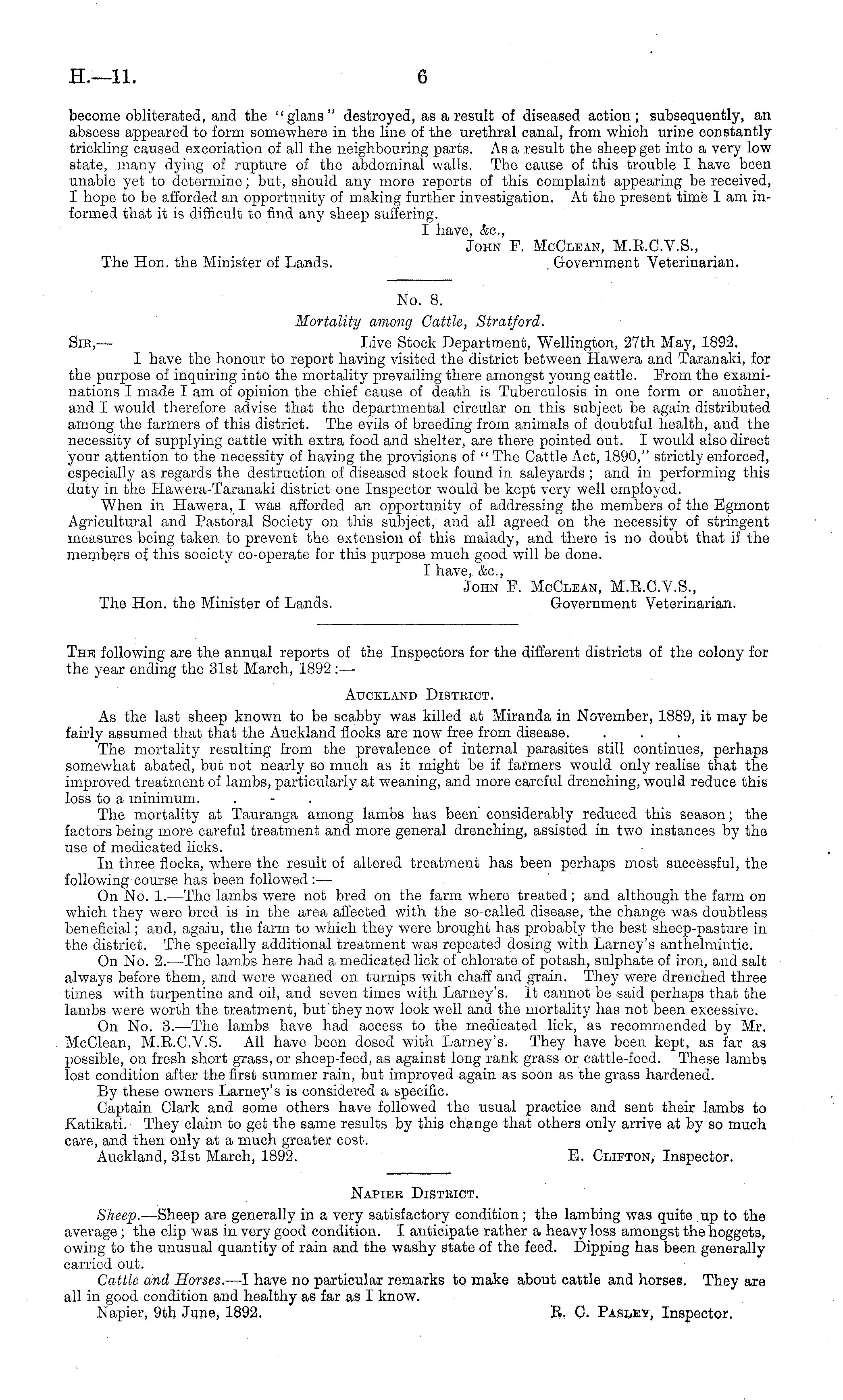 The following are the annual reports of the Inspectors for the different districts of the colony for the year ending the 31st March, 1892 : — Auckland District. As the last sheep known to be scabby was killed at Miranda in November, 1889, it may be fairly assumed that that the Auckland flocks are now free from disease. The mortality resulting from the prevalence of internal parasites still continues, perhaps somewhat abated, but not nearly so much as it might be if farmers would only realise that the improved treatment of lambs, particularly at weaning, and more careful drenching, would reduce this loss to a minimum. The mortality at Tauranga among lambs has been considerably reduced this season; the factors being more careful treatment and more general drenching, assisted in two instances by the use of medicated licks. In three flocks, where the result of altered treatment has been perhaps most successful, the following course has been followed : — On No. I.—The lambs were not bred on the farm where treated; and although the farm on which they were bred is in the area affected with the so-called disease, the change was doubtless beneficial; and, again, the farm to which they were brought has probably the best sheep-pasture in the district. The specially additional treatment was repeated dosing with Larney's anthelmintic. On No. 2.—The lambs here had a medicated lick of chlorate of potash, sulphate of iron, and salt always before them, and were weaned on turnips with chaff and grain. They were drenched three times with turpentine and oil, and seven times with Larney's. It cannot be said perhaps that the lambs were worth the treatment, but'they now look well and the mortality has not been excessive. On No. 3. —The lambs have had access to the medicated lick, as recommended by Mr. McClean, M.E.C.V.S. All have been dosed with Larney's. They have been kept, as far as possible, on fresh short grass, or sheep-feed, as against long rank grass or cattle-feed. These lambs lost condition after the first summer rain, but improved again as soon as the grass hardened. By these owners Larney's is considered a specific. Captain Clark and some others have followed the usual practice and sent their lambs to Katikati. They claim to get the same results by this change that others only arrive at by so much care, and then only at a much greater cost. Auckland, 31st March, 1892. E. Clifton, Inspector.