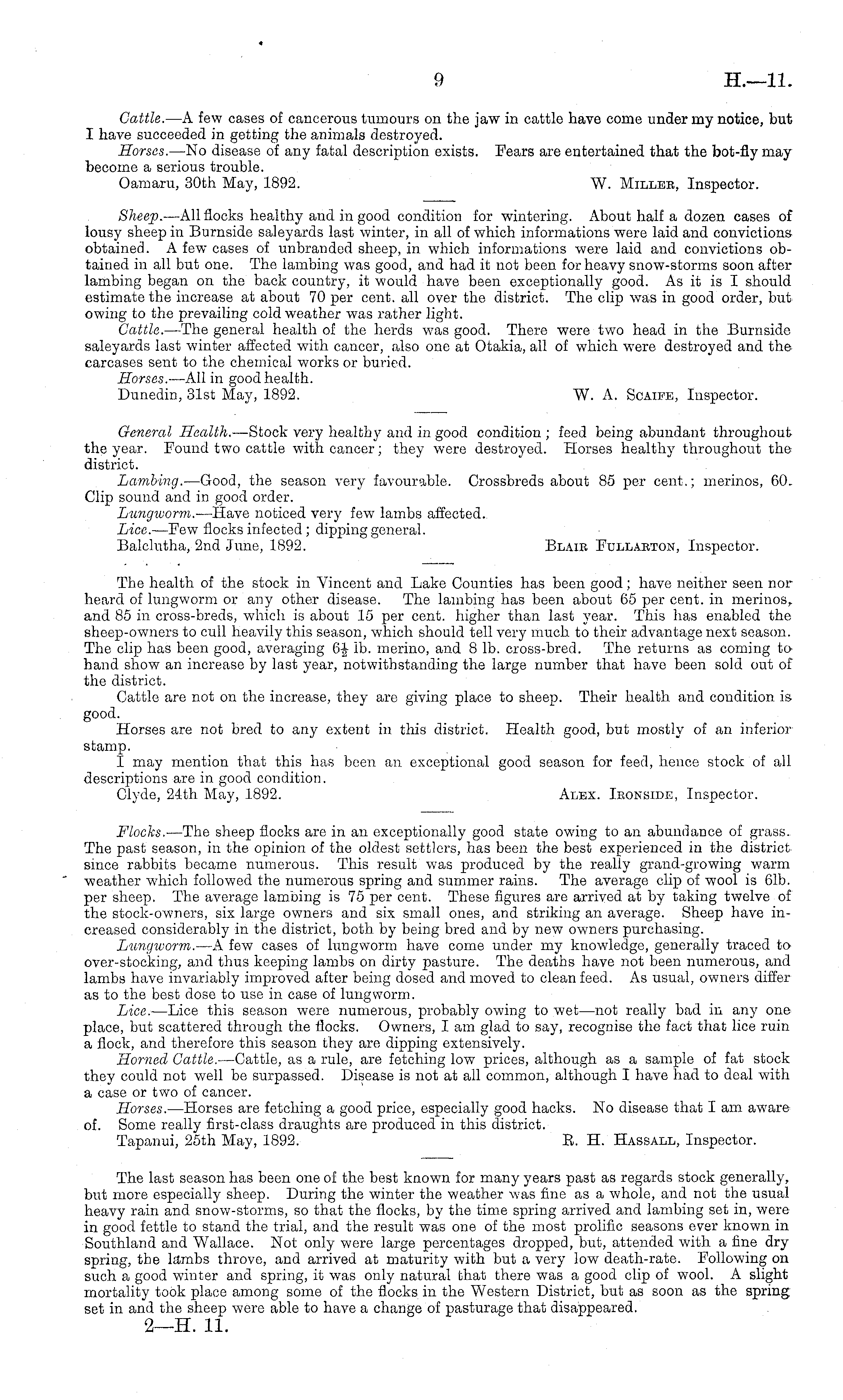 Sheep. —All flocks healthy and in good condition for wintering. About half a dozen cases of lousy sheep in Burnside saleyards last winter, in all of which informations were laid and convictions obtained. A few cases of unbrauded sheep, in which informations were laid and convictions obtained in all but one. The lambing was good, and had it not been for heavy snow-storms soon after lambing began on the back country, it would have been exceptionally good. As it is I should estimate the increase at about 70 per cent, all over the district. The clip was in good order, but owing to the prevailing cold weather was rather light. Cattle. —The general health of the herds was good. There were two head in the Burnside saleyards last winter affected with cancer, also one at Otakia, all of which were destroyed and the carcases sent to the chemical works or buried. Horses. —All in good health. Dunedin, 31st May, 1892. W. A. Scaife, Inspector.