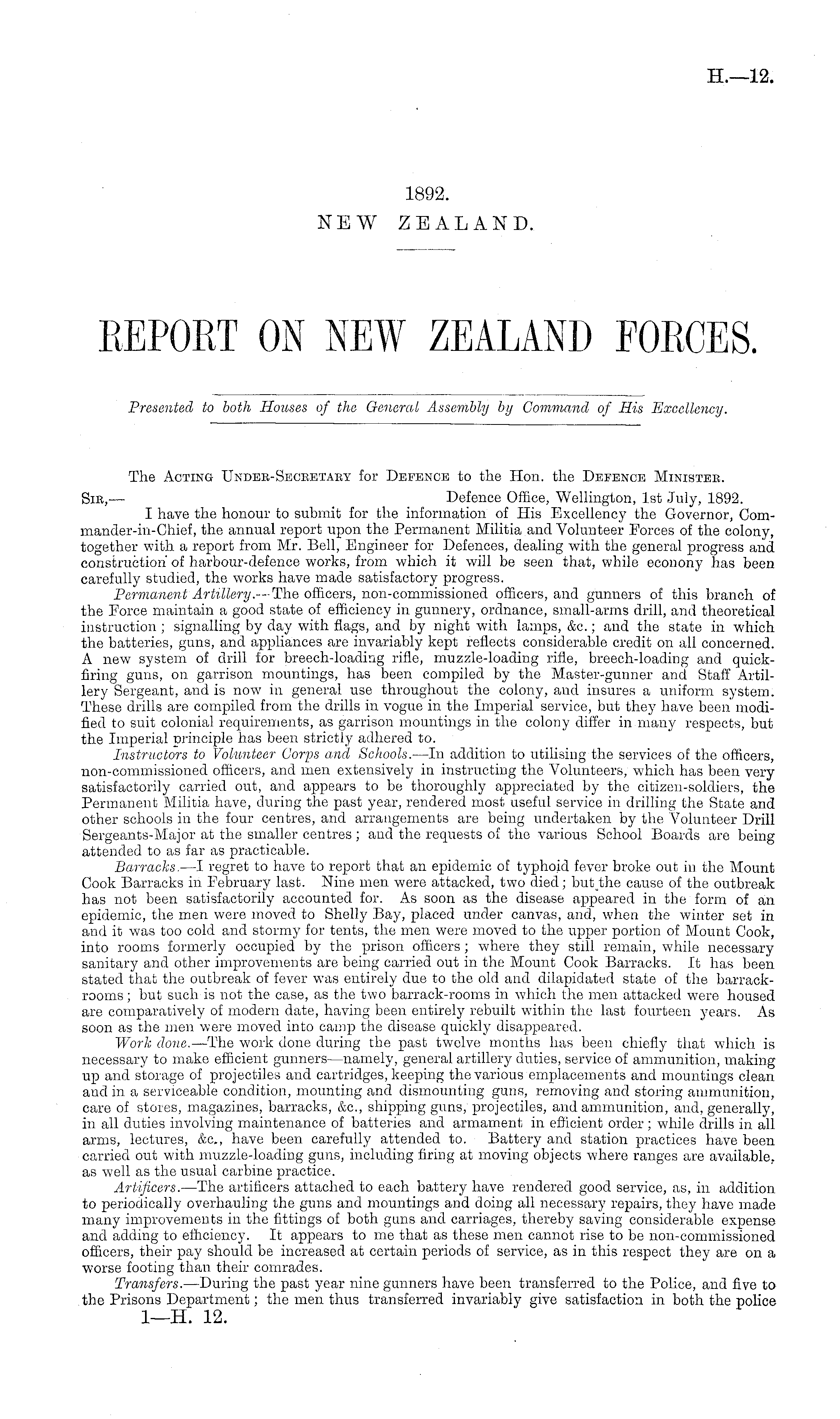 The Acting Undee-Seceetaby for Defence to the Hon. the Defence Ministee. Sic, — Defence Office, Wellington, Ist July, 1892. I have the honour to submit for the information of His Excellency the Governor, Com-mander-iu-Chief, the annual report upon the Permanent Militia and Volunteer Forces of the colony, together with a report from Mr. Bell, Engineer for Defences, dealing with the general progress and construction of harbour-defence works, from which it will be seen that, while econony has been carefully studied, the works have made satisfactory progress. Permanent Artillery.— The officers, non-commissioned officers, and gunners of this branch of the Force maintain a good state of efficiency in gunnery, ordnance, small-arms drill, and theoretical instruction ; signalling by day with flags, and by night with lamps, &c.; and the state in which the batteries, guns, and appliances are invariably kept reflects considerable credit on all concerned. A new system of drill for breech-loading rifle, muzzle-loading rifle, breech-loading and quickfiring guns, on garrison mountings, has been compiled by the Master-gunner and Staff Artillery Sergeant, and is now in general use throughout the colony, and insures a uniform system. These drills are compiled from the drills in vogue in the Imperial service, but they have been modified to suit colonial requirements, as garrison mountings in the colony differ in many respects, but the Imperial Drinciple has been strictly adhered to. Instructors to Volunteer Corps and Schools. —In addition to utilising the services of the officers, non-commissioned officers, and men extensively in instructing the Volunteers, which has been very satisfactorily carried out, and appears to be thoroughly appreciated by the citizen-soldiers, the Permanent Militia have, during the past year, rendered most useful service in drilling the State and other schools in the four centres, and arrangements are being undertaken by the Volunteer Drill Sergeants-Major at the smaller centres ; and the requests of the various School Boards are being attended to as far as practicable. Barracks. —I regret to have to report that an epidemic of typhoid fever broke out in the Mount Cook Barracks in February last. Nine men were attacked, two died; butthe cause of the outbreak has not been satisfactorily accounted for. As soon as the disease appeared in the form of an epidemic, the men were moved to Shelly Bay, placed under canvas, and, when the winter set in and it was too cold and stormy for tents, the men were moved to the upper portion of Mount Cook, into rooms formerly occupied by the prison officers ; where they still remain, while necessary sanitary and other improvements are being carried out in the Mount Cook Barracks. It has been stated that the outbreak of fever was entirely due to the old and dilapidated state of the barrackrooms; but such is not the case, as the two barrack-rooms in which the men attacked were housed are comparatively of modern date, having been entirely rebuilt within the last fourteen years. As soon as the men were moved into camp the disease quickly disappeared. Work done. —The work done during the past twelve months has been chiefly that which is necessary to make efficient gunners —namely, general artillery duties, service of ammunition, making up and storage of projectiles and cartridges, keeping the various emplacements and mountings clean and in a serviceable condition, mounting and dismounting guns, removing and storing ammunition, care of stores, magazines, barracks, &c, shipping guns, projectiles, and ammunition, and, generally, in all duties involving maintenance of batteries and armament in efficient order; while drills in all arms, lectures, &c, have been carefully attended to. Battery and station practices have been carried out with muzzle-loading guns, including firing at moving objects where ranges are available. as well as the usual carbine practice. Artificers. —The artificers attached to each battery have rendered good service, as, in addition to periodically overhauling the guns and mountings and doing all necessary repairs, they have made many improvements in the fittings of both guns and carriages, thereby saving considerable expense and adding to efficiency. It appears to me that as these men cannot rise to be non-commissioned officers, their pay should be increased at certain periods of service, as in this respect they are on a worse footing than their comrades. Transfers. —During the past year nine gunners have been transferred to the Police, and five to the Prisons Department; the men thus transferred invariably give satisfaction in both the police I—H. 12.