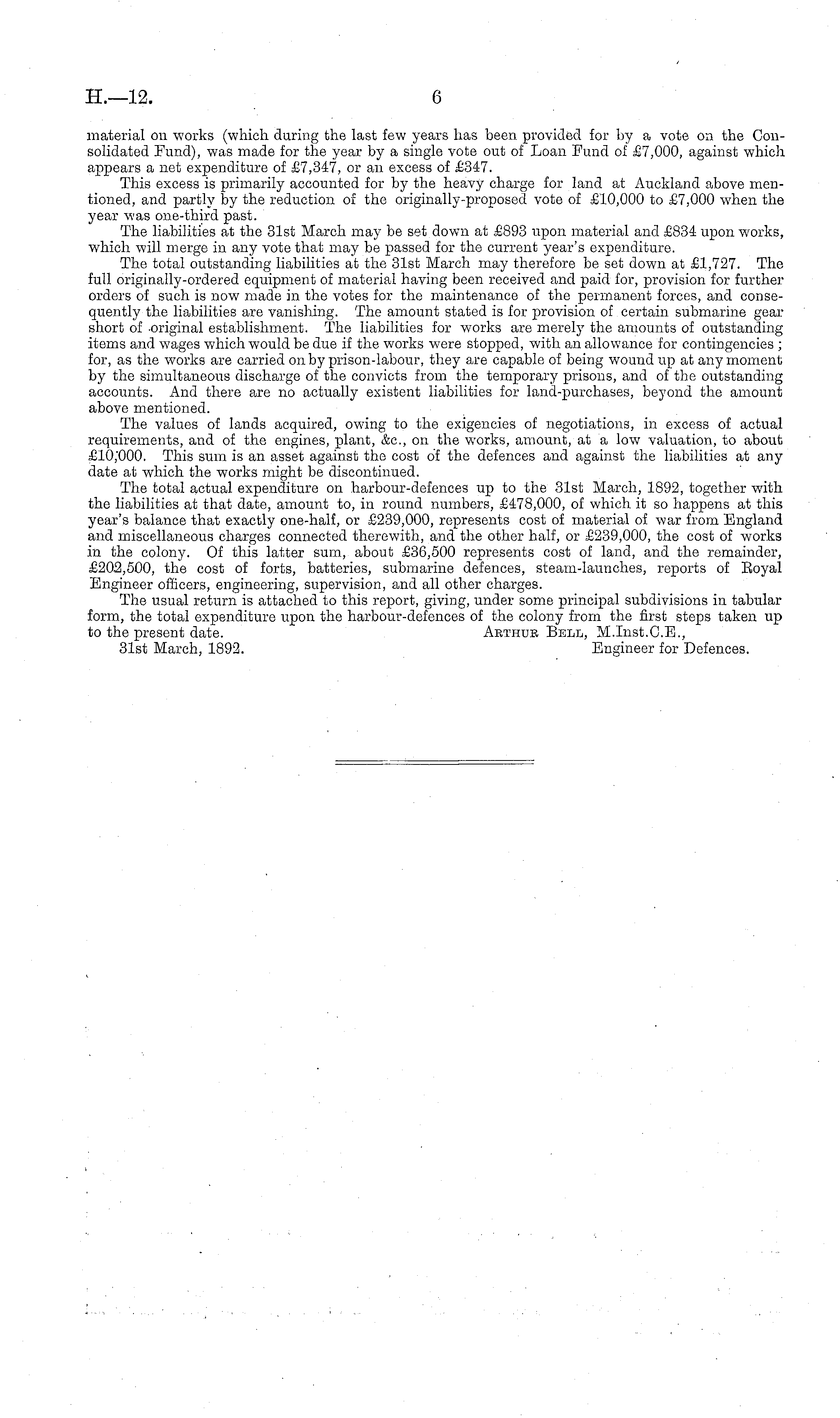material on works (which during the last few years has been provided for by a vote on the Consolidated Fund), was made for the year by a single vote out of Loan Fund of £7,000, against which appears a net expenditure of £7,347, or an excess of £34-7. This excess is primarily accounted for by the heavy charge for land at Auckland above mentioned, and partly by the reduction of the originally-proposed vote of £10,000 to £7,000 when the year was one-third past. The liabilities at the 31st March may be set down at £893 upon material and £834 upon works, which will merge in any vote that may be passed for the current year's expenditure. The total outstanding liabilities at the 31st March may therefore be set down at £1,727. The full originally-ordered equipment of material having been received and paid for, provision for further orders of such is now made in the votes for the maintenance of the permanent forces, and consequently the liabilities are vanishing. The amount stated is for provision of certain submarine gear short of -original establishment. The liabilities for works are merely the amounts of outstanding items and wages which would be due if the works were stopped, with an allowance for contingencies ; for, as the works are carried on by prison-labour, they are capable of being wound up at any moment by the simultaneous discharge of the convicts from the temporary prisons, and of the outstanding accounts. And there are no actually existent liabilities for land-purchases, beyond the amount above mentioned. The values of lands acquired, owing to the exigencies of negotiations, in excess of actual requirements, and of the engines, plant, &c, on the works, amount, at a low valuation, to about £10,000. This sum is an asset against the cost of the defences and against the liabilities at any date at which the works might be discontinued. The total actual expenditure on harbour-defences up to the 31st March, 1892, together with the liabilities at that date, amount to, in round numbers, £478,000, of which it so happens at this year's balance that exactly one-half, or £239,000, represents cost of material of war from England and miscellaneous charges connected therewith, and the other half, or £239,000, the cost of works in the colony. Of this latter sum, about £36,500 represents cost of land, and the remainder, £20-2,500, the cost of forts, batteries, submarine defences, steam-launches, reports of Eoyal Engineer oflicers, engineering, supervision, and all other charges. The usual return is attached to this report, giving, under some principal subdivisions in tabular form, the total expenditure upon the harbour-defences of the colony from the first steps taken up to the present date. Aethue Bell, M.lnst.O.E., 31st March, 1892. Engineer for Defences.