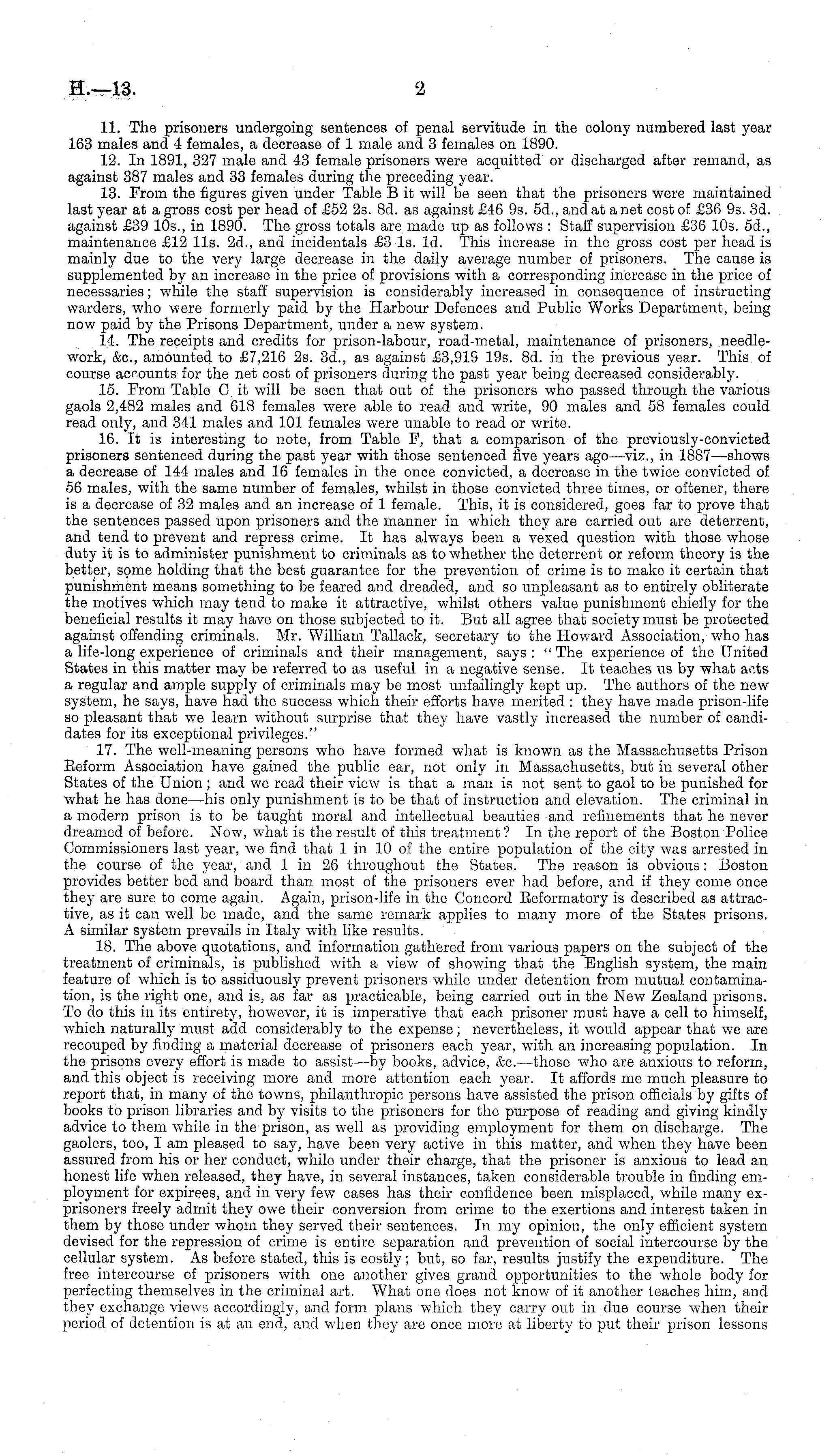 11. The prisoners undergoing sentences of penal servitude in the colony numbered last year 163 males and 4 females, a decrease of 1 male and 3 females on 1890. 12. In 1891, 327 male and 43 female prisoners were acquitted or discharged after remand, as against 387 males and 33 females during the preceding year. 13. From the figures given under Table B it will be seen that the prisoners were maintained last year at a gross cost per head of £52 2s. Bd. as against £46 9s. 5d., and at a net cost of £36 9s. 3d. against £39 10s., in 1890. The gross totals are made up as follows : Staff supervision £36 10s. 5d., maintenance £12 11s. 2d., and incidentals £3 Is. Id. This increase in the gross cost per head is mainly due to the very large decrease in the daily average number of prisoners. The cause is supplemented by an increase in the price of provisions with a corresponding increase in the price of necessaries; while the staff supervision is considerably increased in consequence of instructing warders, who were formerly paid by the Harbour Defences and Public Works Department, being now paid by the Prisons Department, under a new system. 14. The receipts and credits for prison-labour, road-metal, maintenance of prisoners, needlework, &c, amounted to £7,216 2s. 3d., as against £3,915 19s. Bd. in the previous year. This of course accounts for the net cost of prisoners during the past year being decreased considerably. 15. From Table C. it will be seen that out of the prisoners who passed through the various gaols 2,482 males and 618 females were able to read and write, 90 males and 58 females could read only, and 341 males and 101 females were unable to read or write. 16. It is interesting to note, from Table F, that a comparison of the previously-convicted prisoners sentenced during the past year with those sentenced five years ago—viz., in 1887 —shows a decrease of 144 males and 16 females in the once convicted, a decrease in the twice convicted of 56 males, with the same number of females, whilst in those convicted three times, or oftener, there is a decrease of 32 males and an increase of 1 female. This, it is considered, goes far to prove that the sentences passed upon prisoners and the manner in which they are carried out are deterrent, and tend to prevent and repress crime. It has always been a vexed question with those whose duty it is to administer punishment to criminals as to whether the deterrent or reform theory is the better, some holding that the best guarantee for the prevention of crime is to make it certain that punishment means something to be feared and dreaded, and so unpleasant as to entirely obliterate the motives which may tend to make it attractive, whilst others value punishment chiefly for the beneficial results it may have on those subjected to it. But all agree that society must be protected against offending criminals. Mr. William Tallack, secretary to the Howard Association, who has a life-long experience of criminals and their management, says : " The experience of the United States in this matter may be referred to as useful in a negative sense. It teaches us by what acts a regular and ample supply of criminals may be most unfailingly kept up. The authors of the new system, he says, have had the success which their efforts have merited : they have made prison-life so pleasant that we learn without surprise that they have vastly increased the number of candidates for its exceptional privileges." 17. The well-meaning persons who have formed what is known as the Massachusetts Prison Reform Association have gained the public ear, not only in Massachusetts, but in several other States of the Union ; and we read their view is that a man is not sent to gaol to be punished for what he has done—his only punishment is to be that of instruction and elevation. The criminal in a modern prison is to be taught moral and intellectual beauties and refinements that he never dreamed of before. Now, what is the result of this treatment? In the report of the Boston Police Commissioners last year, we find that 1 in 10 of the entire population of the city was arrested in the course of the year, and lin 26 throughout the States. The reason is obvious: Boston provides better bed and board than most of the prisoners ever had before, and if they come once they are sure to come again. Again, prison-life in the Concord Reformatory is described as attractive, as it can well be made, and the same remark applies to many more of the States prisons. A similar system prevails in Italy with like results. 18. The above quotations, and information gathered from various papers on the subject of the treatment of criminals, is published with a view of showing that the English system, the main feature of which is to assiduously prevent prisoners while under detention from mutual contamination, is the right one, and is, as far as practicable, being carried out in the New Zealand prisons. To do this in its entirety, however, it is imperative that each prisoner must have a cell to himself, which naturally must add considerably to the expense; nevertheless, it would appear that we are recouped by finding a material decrease of prisoners each year, with an increasing population. In the prisons every effort is made to assist—by books, advice, &c.—those who are anxious to reform, and this object is receiving more and more attention each year. It affords me much pleasure to report that, in many of the towns, philanthropic persons have assisted the prison officials by gifts of books to prison libraries and by visits to the prisoners for the purpose of reading and giving kindly advice to them while in the prison, as well as providing employment for them on discharge. The gaolers, too, I am pleased to say, have been very active in this matter, and when they have been assured from his or her conduct, while under their charge, that the prisoner is anxious to lead an honest life when released, they hav