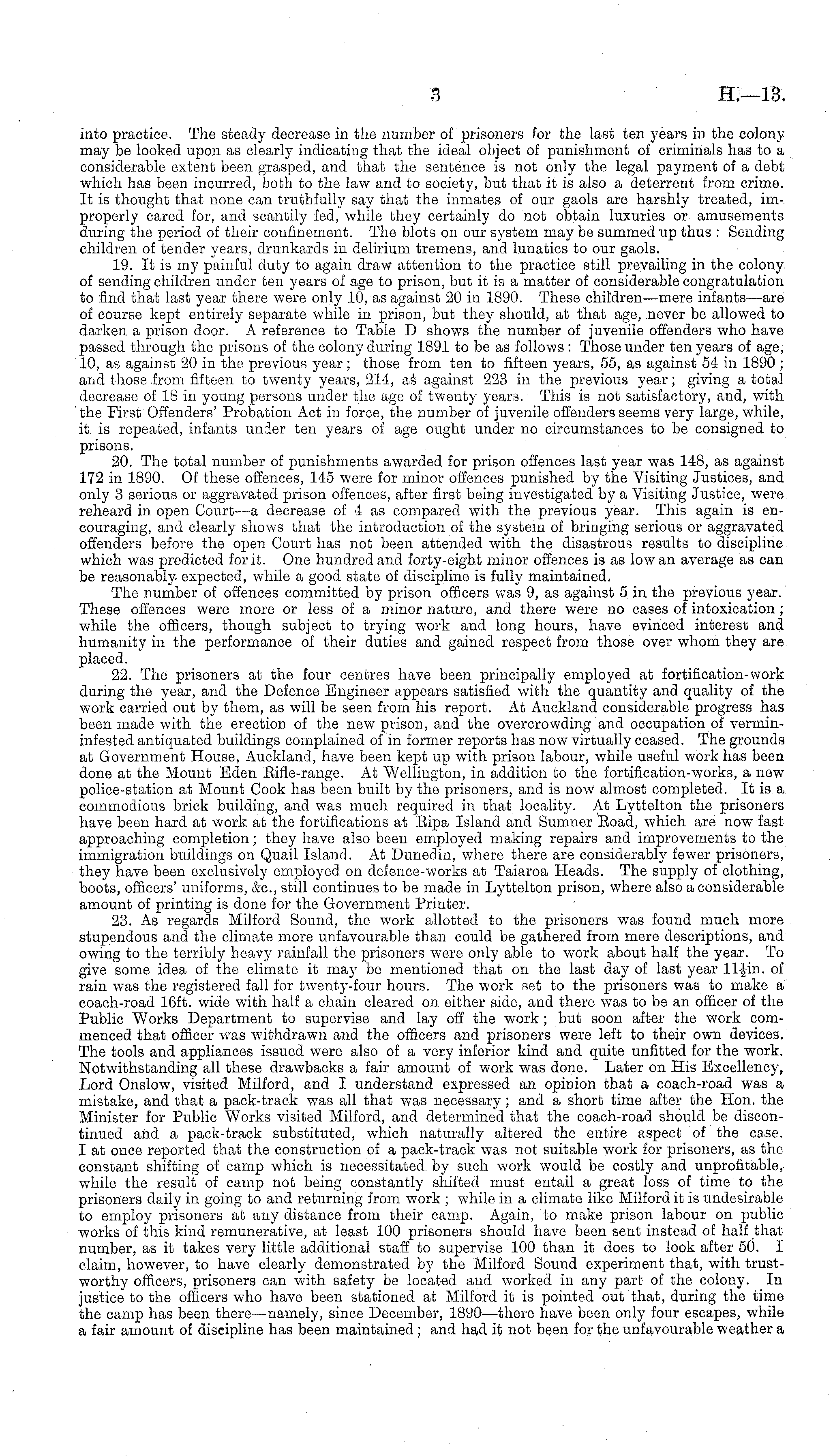 into practice. The steady decrease in the number of prisoners for the last ten years in the colony may be looked upon as clearly indicating that the ideal object of punishment of criminals has to a considerable extent been grasped, and that the sentence is not only the legal payment of a debt which has been incurred, both to the law and to society, but that it is also a deterrent from crime. It is thought that none can truthfully say that the inmates of our gaols are harshly treated, improperly cared for, and scantily fed, while they certainly do not obtain luxuries or amusements during the period of their confinement. The blots on our system may be summed lip thus : Sending children of tender years, drunkards in delirium tremens, and lunatics to our gaols. 19. It is my painful duty to again draw attention to the practice still prevailing in the colony of sending children under ten years of age to prison, but it is a matter of considerable congratulation to find that last year there were only 10, as against 20 in 1890. These children—mere infants—are of course kept entirely separate while in prison, but they should, at that age, never be allowed to darken a prison door. A reference to Table D shows the number of juvenile offenders who have passed through the prisons of the colony during 1891 to be as follows : Those under ten years of age, 10, as against 20 in the previous year; those from ten to fifteen years, 55, as against 54 in 1890 ; and those from fifteen to twenty years, 214, as against 223 in the previous year; giving a total decrease of 18 in young persons under the age of twenty years. This is not satisfactory, and, with the First Offenders' Probation Act in force, the number of juvenile offenders seems very large, while, it is repeated, infants under ten years of age ought under no circumstances to be consigned to prisons. 20. The total number of punishments awarded for prison offences last year was 148, as against 172 in 1890. Of these offences, 145 were for minor offences punished by the Visiting Justices, and only 3 serious or aggravated prison offences, after first being investigated by a Visiting Justice, were reheard in open Court—a decrease of 4 as compared with the previous year. This again is encouraging, and clearly shows that the introduction of the system of bringing serious or aggravated offenders before the open Court has not been attended with the disastrous results to discipline which was predicted for it. One hundred and forty-eight minor offences is as low an average as can be reasonably, expected, while a good state of discipline is fully maintained. The number of offences committed by prison officers was 9, as against 5 in the previous year. These offences were more or less of a minor nature, and there were no cases of intoxication ; while the officers, though subject to trying work and long hours, have evinced interest and humanity in the performance of their duties and gained respect from those over whom they are placed. 22. The prisoners at the four centres have been principally employed at fortification-work during the year, and the Defence Engineer appears satisfied with the quantity and quality of the work carried out by them, as will be seen from his report. At Auckland considerable progress has been made with the erection of the new prison, and the overcrowding and occupation of vermininfested antiquated buildings complained of in former reports has now virtually ceased. The grounds at Government House, Auckland, have been kept up with prison labour, while useful work has been done at the Mount Eden Eifle-range. At Wellington, in addition to the fortification-works, a new police-station at Mount Cook has been built by the prisoners, and is now almost completed. It is a commodious brick building, and was much required in that locality. At Lyttelton the prisoners have been hard at work at the fortifications at Eipa Island and Sumner Eoad, which are now fast approaching completion; they have also been employed making repairs and improvements to the immigration buildings on Quail Island. At Dunedin, where there are considerably fewer prisoners, they have been exclusively employed on defence-works at Taiaroa Heads. The supply of clothing, boots, officers' uniforms, &c, still continues to be made in Lyttelton prison, where also a considerable amount of printing is done for the Government Printer. 23. As regards Milford Sound, the work allotted to the prisoners was found much more stupendous and the climate more unfavourable than could be gathered from mere descriptions, and owing to the terribly heavy rainfall the prisoners were only able to work about half the year. To give some idea of the climate it may be mentioned that on the last day of last year llfin. of rain was the registered fall for twenty-four hours. The work set to the prisoners was to make a coach-road 16ft. wide with half a chain cleared on either side, and there was to be an officer of the Public Works Department to supervise and lay off the work; but soon after the work commenced that officer w r as withdrawn and the officers and prisoners were left to their own devices. The tools and appliances issued were also of a very inferior kind and quite unfitted for the work. Notwithstanding all these drawbacks a fair amount of work was done. Later on His Excellency, Lord Onslow, visited Milford, and I understand expressed an opinion that a coach-road was a mistake, and that a pack-track was all that was necessary; and a short time after the Hon. the Minister for Public Works visited Milford, and determined that the coach-road should be discontinued and a pack-track substituted, which naturally altered the entire aspect of the case. I at once reported that the construction of a pack-track was not suitable work for prisoners, as the constant shifting of camp which is necessitated by such work would be costly and unprofitable, while the result of camp not being constantly shifted must entail