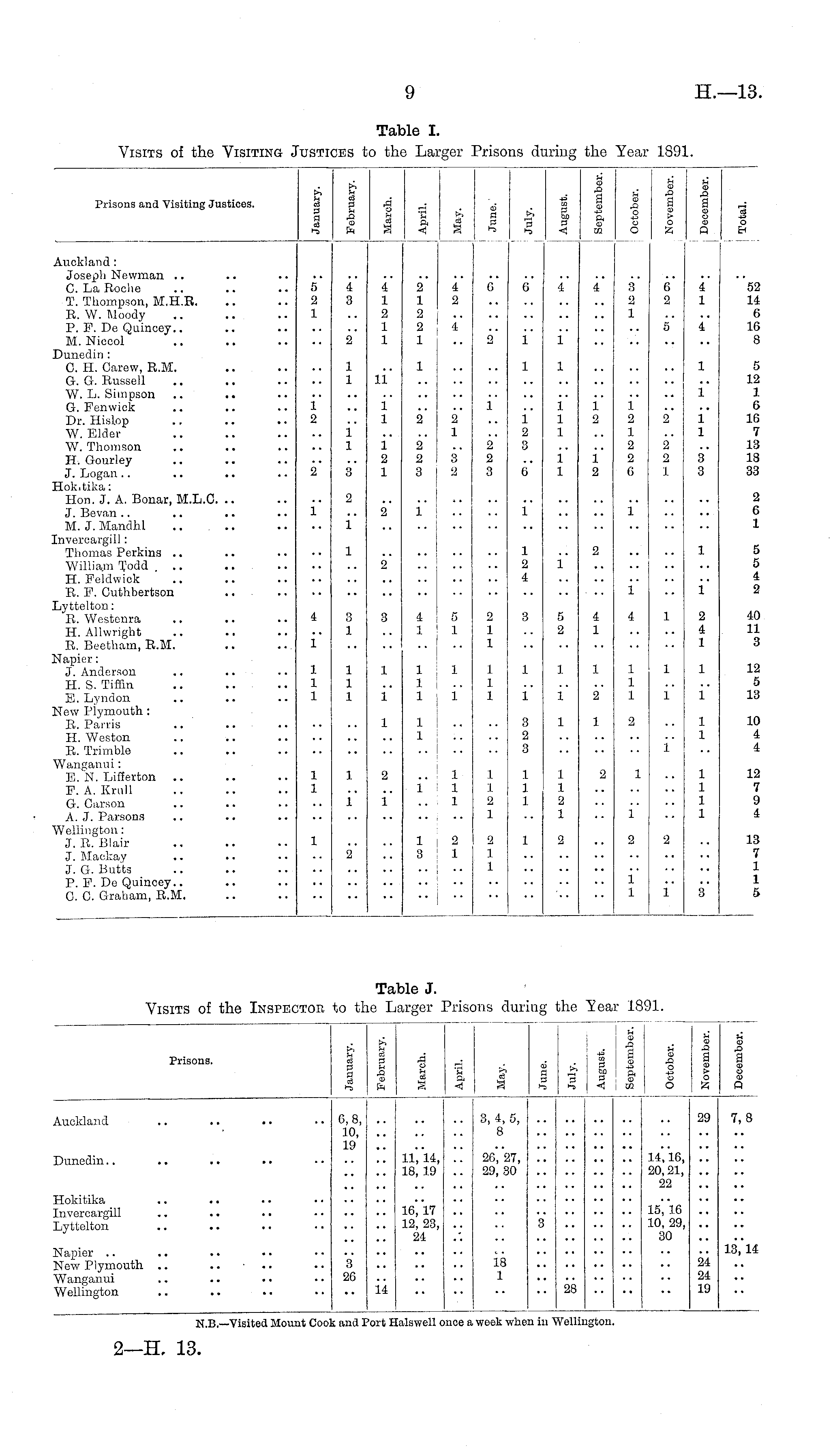 Table J. Visits of the Inspector to the Larger Prisons during the Year 1891.