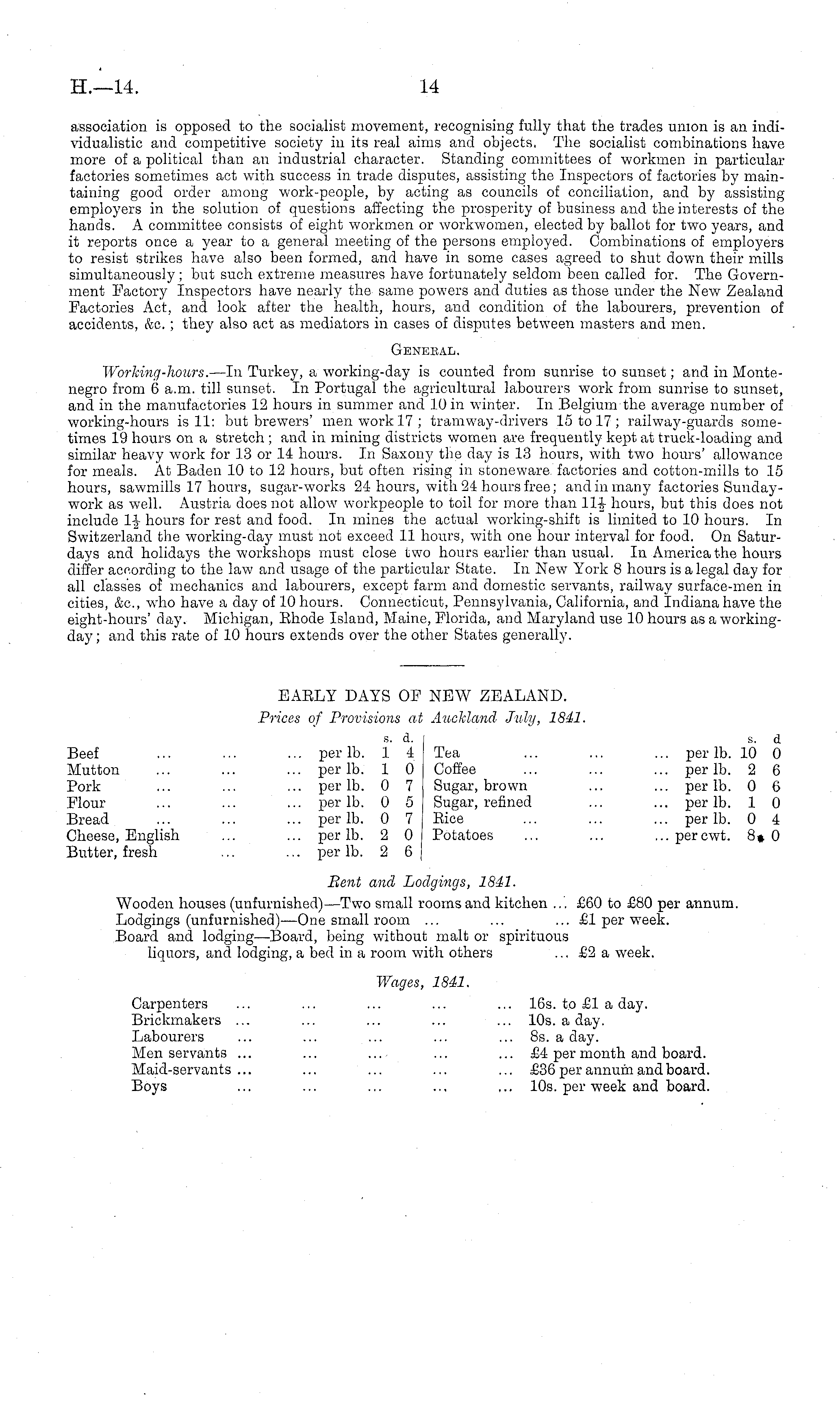 association is opposed to the socialist movement, recognising fully that the trades union is an individualistic and competitive society in its real aims and objects. The socialist combinations have more of a political than an industrial character. Standing committees of workmen in particular factories sometimes act with success in trade disputes, assisting the Inspectors of factories by maintaining good order among work-people, by acting as councils of conciliation, and by assisting employers in the solution of questions affecting the prosperity of business and the interests of the hands. A committee consists of eight workmen or workwomen, elected by ballot for two years, and it reports once a year to a general meeting of the persons employed. Combinations of employers to resist strikes have also been formed, and have in some cases agreed to shut down their mills simultaneously ; but such extreme measures have fortunately seldom been called for. The Government Factory Inspectors have nearly the- same powers and duties as those under the New Zealand Factories Act, and look after the health, hours, and condition of the labourers, prevention of accidents, &c. ; they also act as mediators in cases of disputes between masters and men. Genebal. Working-hours. —ln Turkey, a working-day is counted from sunrise to sunset; and in Montenegro from 6 a.m. till sunset. In Portugal the agricultural labourers work from sunrise to sunset, and in the manufactories 12 hours in summer and 10 in winter. In Belgium the average number of working-hours is 11: but brewers' men work 17: tramway-drivers 15 to 17 ; railway-guards sometimes 19 hours on a stretch ; and in mining districts women are frequently kept at truck-loading and similar heavy work for 13 or 14 hours. In Saxony the day is 13 hours, with two hours' allowance for meals. At Baden 10 to 12 hours, but often rising in stoneware, factories and cotton-mills to 15 hours, sawmills 17 hours, sugar-works 24 hours, with 24 hoars free; and in many factories Sundaywork as well. Austria does not allow workpeople to toil for more than Hi hours, but this does not include 1J hours for rest and food. In mines the actual working-shift is limited to 10 hours. In Switzerland the working-day must not exceed 11 hours, with one hour interval for food. On Saturdays and holidays the workshops must close two hours earlier than usual. In America the hours differ according to the law and usage of the particular State. In New York 8 hours is a legal day for all classes of mechanics and labourers, except farm and domestic servants, railway surface-men in cities, &c, who have a day of 10 hours. Connecticut, Pennsylvania, California, and Indiana have the eight-hours' day. Michigan, Ehode Island, Maine, Florida, and Maryland use 10 hours as a workingday ; and this rate of 10 hours extends over the other States generally. EAELY DAYS OF NEW ZEALAND. Prices of Provisions at Auckland July, 1841. s. d. s. d Beef ... ... ... per lb. 1 4 Tea ... ... ... per lb. 10 0 Mutton ... ... ... per lb. 1 0 Coffee ... ... ... per lb. 2 6 Pork ... ... ... per lb. 0 7 Sugar, brown ... ... per lb. 0 6 Flour ... ... ... per lb. 0 5 Sugar, refined ... ... per lb. 1 0 Bread ... ... ... per lb. 0 7 Eice ... ... ... per lb. 0 4 Cheese, English ... ... per lb. 2 0 Potatoes ... ... ... perewt. 8# 0 Butter, fresh ... ... per lb. 2 6 Bent and Lodgings, 1841. Wooden houses (unfurnished) —Two small rooms and kitchen ... £60 to £80 per annum. Lodgings (unfurnished) —One small room ... ... ... £1 per week. Board and lodging—Board, being without malt or spirituous liquors, and lodging, a bed in a room with others ... £2 a week. Wages, 1841. Carpenters ... ... ... ... ... 16s. to £1 a day. Brickmakers ... ... ... ... ... 10s. a day. Labourers ... ... ... ... ... Bs. a day. Men servants ... ... .... ... ... £4 per month and board. Maid-servants... ... ... ... ... £36 per annum and board. Boys ... ... ... ... ~. 10s. per week and board.