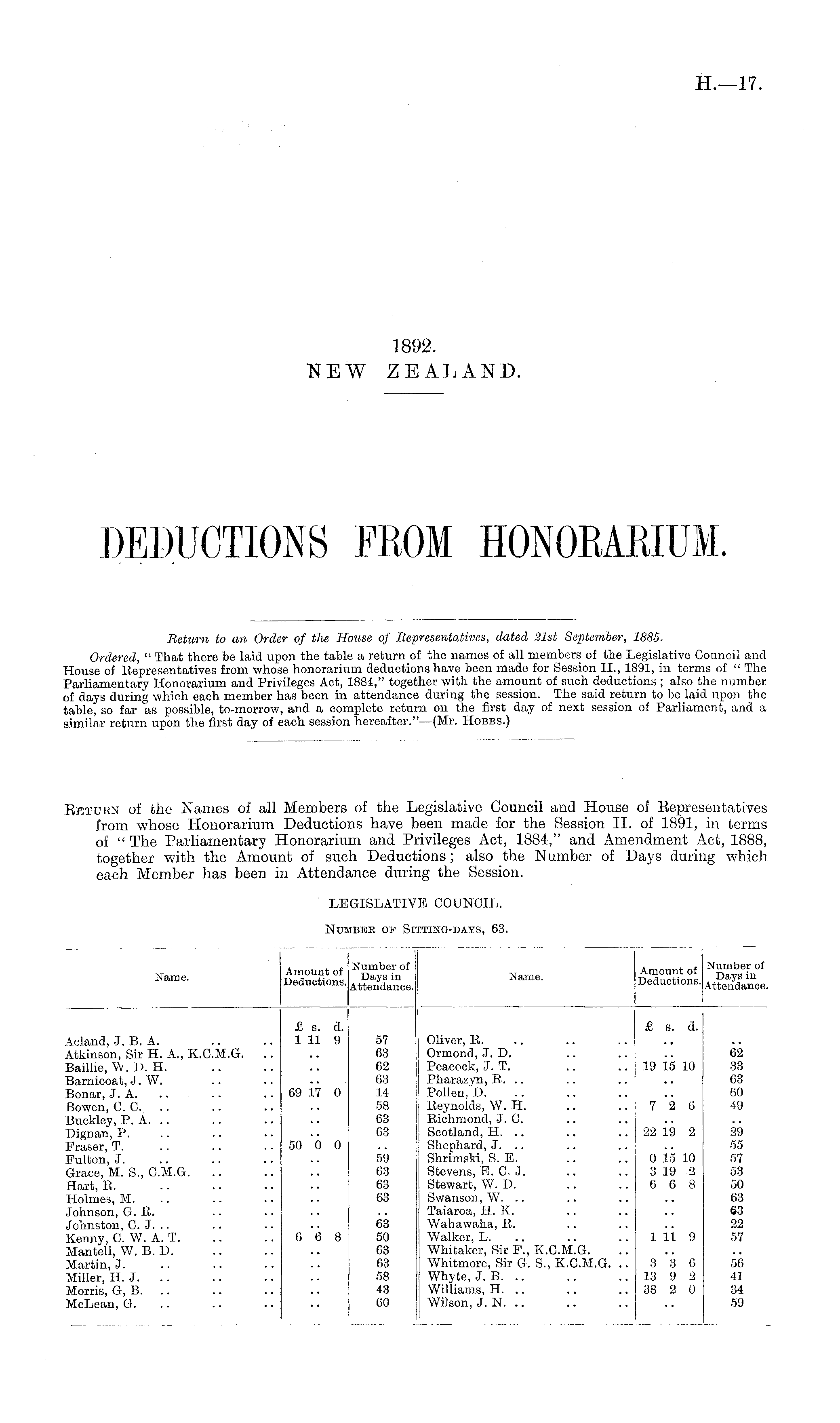 Return to an Order of the House of Representatives, dated 21st September, 1885. Ordered, " That there be laid upon the table a return of the names of all members of the Legislative Council and House of Representatives from whose honorarium deductions have been made for Session 11., 1891, in terms of " The Parliamentary Honorarium and Privileges Act, 1884," together with the amount of such deductions ; also the number of days during which each member has been in attendance during the session. The said return to be laid upon the table, so far as possible, to-morrow, and a complete return on the first day of next session of Parliament, and a similar return upon the first day of each session hereafter."—(Mr. Hobes.)