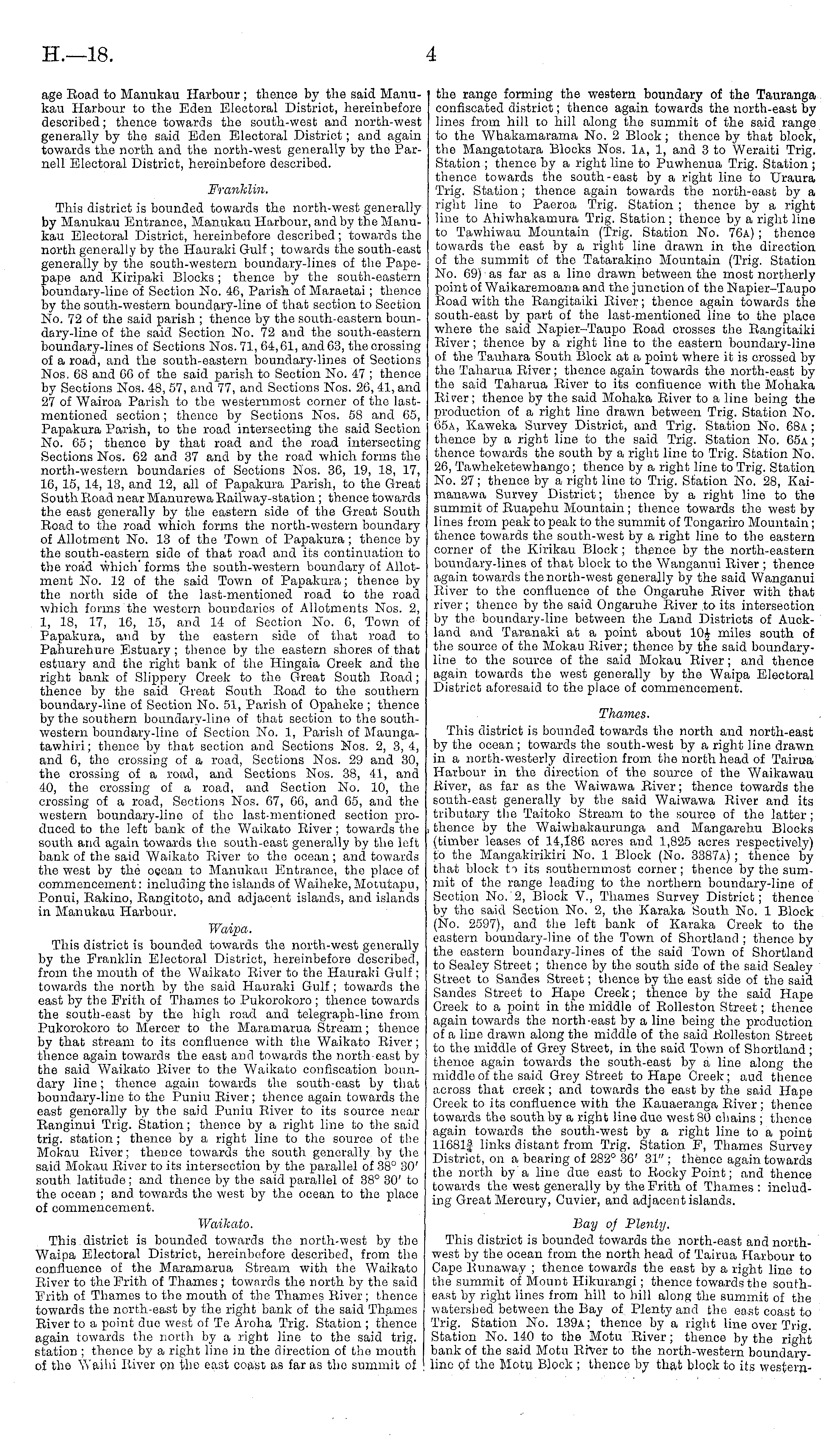age Road to Manukau Harbour ; thence by the said Manukau Harbour to the Eden Electoral District, hereinbefore described; thenco towards the south-west and north-west generally by the said Eden Electoral District; and again towards the north and the north-west generally by the Parnell Electoral District, hereinbefore described. Franklin. This district is bounded towards tho north-west generally by Manukau Entrance, Manukau Harbour, and by the Manukau Electoral District, hereinbefore described; towards the north generally by the Hauraki Gulf; towards the south-east generally by the south-western boundary-lines of the Papepape and Kiripaki Blocks ; thence by the south-eastern boundary-line of Section No. 46, Parish of Maraetai ; thence by the south-western boundary-line of that section to Section No. 72 of the said parish ; thence by the south-eastern boun-dary-line of the said Section No. 72 and the south-eastern boundary-linos of Sections Nos. 71, 64,61, and 63, the crossing of a road, and the south-eastern boundary-lines of Sections Nos, 68 and 66 of the said parish to Section No. 47 ; thence by Sections Nos. 48, 57, and 77, and Sections Nos. 20, 41, and 27 of Wairoa Parish to the westernmost corner of the lastmentioned section; thence by Sections Nos. 58 and 65, Papakura Parish, to tho road intersecting tho said Section No. 65; thence by that road and the road intersecting Sections Nos. 62 and 37 and by the road which forms the north-western boundaries of Sections Nos. 36, 19, 18, 17, 16, 15, 14, 13, and 12, all of Papakura Parish, to the Great South Road near Manurewa Railway-station; thenco towards tho east generally by the eastern side of the Great South Road to the road which forms tho north-western boundary of Allotment No. 13 of the Town of Papakura; thence by tho south-eastern side of that road and its continuation to the road which' forms the south-western boundary of Allotment No. 12 of the said Town of Papakura; thence by the north side of the last-mentioned road to the road which forms the western boundaries of Allotments Nos. 2, 1, 18, 17, 16, 15, and 14 of Section No. 6, Town of Papakura, and by the eastern side of that road to Pahurehure Estuary ; thence by the eastern shores of that estuary and the right bank of the Hingaia Creek and the right bank of Slippery Creek to the Great South Road; thence by tho said Great South Road to the southern boundary-line of Section No. 51, Parish of Opaheko ; thenco by the southern boundary-lino of that section to the southwestern boundary-line of Section No. 1, Parish of Maungatawhiri; thence by that section and Sections Nos. 2, 3, 4, and 6, tho crossing of a road, Sections Nos. 29 and 30, the crossing of a road, and Sections Nos. 38, 41, and 40, the crossing of a road, and Section No. 10, the crossing of a road, Sections Nos. 67, 66, and 65, and the western boundary-line of tho last-mentioned section produced to the left bank of the Waikato River ; towards the south and again towards the south-east generally by the left bank of the said Waikato River to the ocean; and towards the west by the ocean to Manukau Entrance, the place of commencement: including the islands of Waiheke, Motutapu, Ponui, Rakino, Rangitoto, and adjacent islands, and islands in Manukau Harbour. Waipa. This district is bounded towards the north-west generally by the Franklin Electoral District, hereinbefore described, from the mouth of the Waikato River to the Hauraki Gulf; towards the north by the said Hauraki Gulf; towards the east by the Frith of Thames to Pukorokoro ; thence towards the south-east by the high road and telegraph-line from Pukorokoro to Mercer to the Maramarua Stream; thence by that stream to its confluence with the Waikato River; thenco again towards the east and towards the north-east by the said Waikato River to the Waikato confiscation boundary line; thence again towards the south-east by that boundary-line to the Puniu River; thence again towards the east generally by the said Puniu River to its source near Ranginui Trig. Station; thence by a right line to the said trig, station ; thence by a right line to the source of the Mokau River; thence towards the south generally by the said Mokau River to its intersection by the parallel of 38° 30' south, latitude; and thence by the said parallel of 38° 30' to the ocean ; and towards the west by the ocean to the place of commencement. Waikato. This district is bounded towards the north-west by the Waipa Electoral District, hereinbefore described, from the confluence of the Maramarua Stream with the Waikato River to the Frith of Thames ; towards the north by the said Frith of Thames to the mouth of the Thames River; thence towards the north-east by the right bank of the said Thames River to a point due west of Te Aroha Trig. Station ; thence again towards the north by a right line to the said trig, station ; thence by a right line in the direction of the mouth of the Waihi River on the east coast as far as the summit of