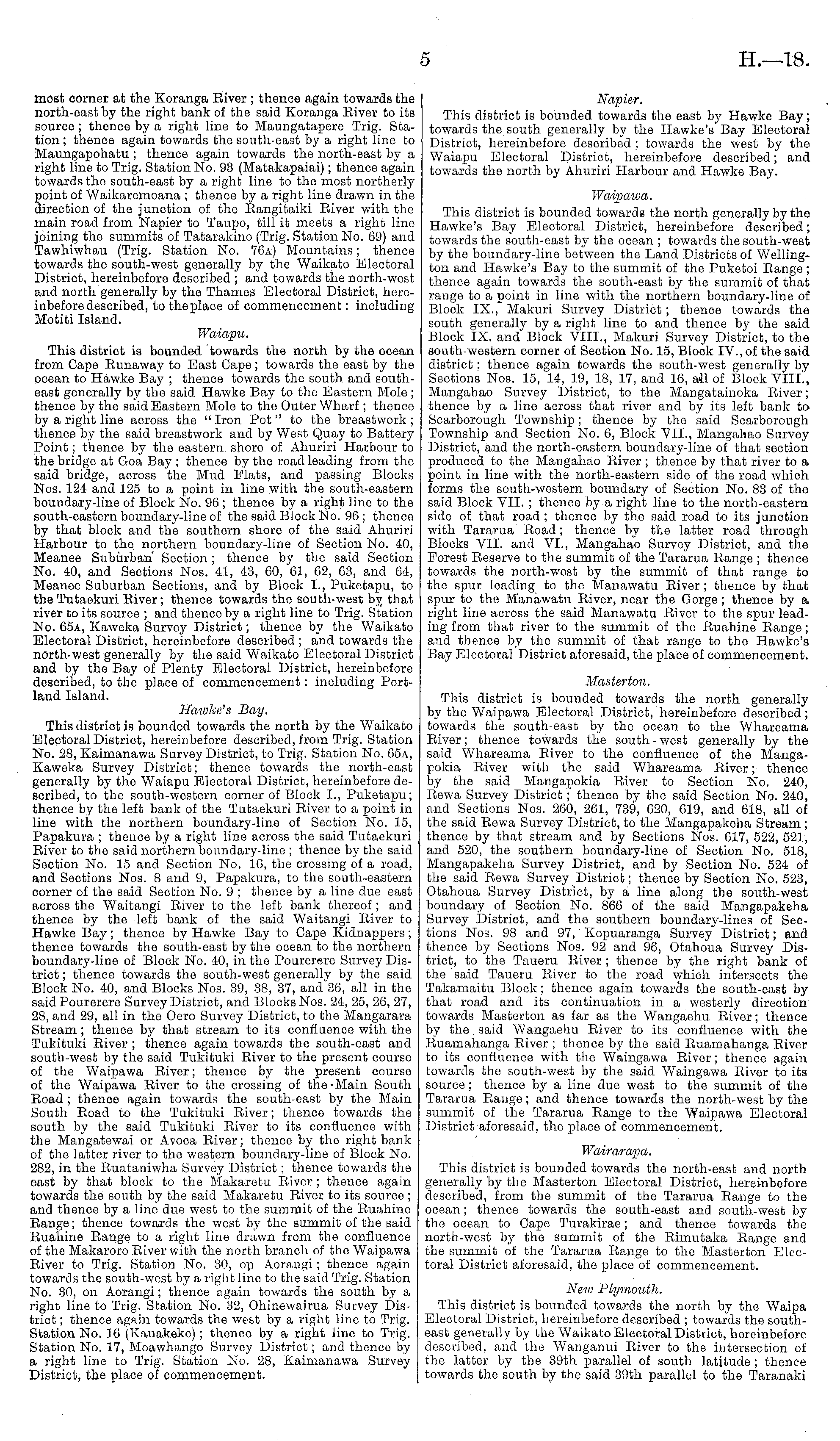 Napier. This district is bounded towards the east by Hawke Bay; towards the south generally by the Hawke's Bay Electoral District, hereinbefore described ; towards the west by the Waiapu Electoral District, hereinbefore described; and towards the north by Ahuriri Harbour and Hawke Bay. Waipawa. This district is bounded towards the north generally by the Hawke's Bay Electoral District, hereinbefore described; towards the south-east by the ocean ; towards the south-west by the boundary-line between the Land Districts of Wellington and Hawke's Bay to the summit of the Puketoi Range; thence again towards the south-east by the summit of that range to a point in line with the northern boundary-line of Block IX., Makuri Survey District; thence towards the south generally by a right line to and thence by the said Block IX. and Block VIII., Makuri Survey District, to the south-western corner of Section No. 15, Block IV., of the said district: thence again towards the south-west generally by Sections Nos. 15, 14, 19, 18, 17, and 16, aJI of Block VIIL, Mangahao Survey District, to the Mangatainoka River; thence by a line across that river and by its left bank to Scarborough Township; thenco by the said Scarborough Township and Section No. 6, Block VII., Mangahao Survey District, and the north-eastern boundary-line of that section produced to the Mangahao River ; thence by that river to a point in line with the north-eastern side of the road which forms the south-western boundary of Section No. 83 of the said Block VII. ; thenco by a right line to the north-eastern side of that road ; thence by the said road to its junction with Tararua Road; thenoe by the latter road through Blocks VII. and VI., Mangahao Survey District, and the Forest Reserve to the summit of the Tararua Range ; thence towards the north-west by the summit of that range to the spur leading to tho Manawatu River; thence by that spur to tho Manawatu River, near the Gorge ; thence by a right line across the said Manawatu River to the spur leading from that river to the summit of the Ruahine Range; and thence by the summit of that range to the Hawke's Bay Electoral District aforesaid, the place of commencement. Masterton. This district is bounded towards the north generally by the Waipawa Electoral District, hereinbefore described ; towards tho south-east by the ocean to the Whareama River; thence towards the south - west generally by the said Whareama River to the confluence of the Mangapokia River with the said Whareama River; thence by the said Mangapokia River to Section No. 240, Rewa Survey District ; thence by the said Section No. 240, and Sections Nos. 200, 261, 739, 620, 619, and 618, all of the said Rewa Survey District, to the Mangapakeba Stream ; thence by that stream and by Sections Nos. 617, 522, 521, and 520, the southern boundary-line of Section No. 518, Mangapakeba Survey District, and by Section No. 524 of the said Rewa Survey District; thence by Section No. 523, Otahoua Survey District, by a line along the south-west boundary of Section No. 866 of the said Mangapakeha Survey District, and the southern boundary-lines of Sections Nos. 98 and 97, Kopuaranga Survey District; and thence by Sections Nos. 92 and 96, Otahoua Survey District, to the Taueru River ; thence by the right bank of the said Taueru River to the road which intersects the Takamaitu Block; thence again towards the south-east by that road and its continuation in a westerly direction towards Masterton as far as the Wangaehu River; thence by the said Wangaehu River to its confluence with the Ruamahanga River ; thence by the said Ruamahanga River to its confluence with the Waingawa River; thence again towards the south-west by the said Waingawa River to its source; thence by a line due west to the summit of the Tararua Range ; and thence towards the north-west by the summit of the Tararua Range to the Waipawa Electoral District aforesaid, the place of commencement. Wairarapa. This district is bounded towards the north-east and north generally by the Masterton Electoral District, hereinbefore described, from the summit of the Tararua Range to the ocean; thence towards the south-east and south-wost by the ocean to Cape Turakirae; and thenoe towards the north-west by the summit of the Rimutaka Range a.nd the summit of the Tararua Range to tho Masterton Electoral District aforesaid, the place of commencement. New Plymouth. This district is bounded towards the north by tho Waipa Electoral District, hereinbefore described ; towards the southeast generally by the Waikato Electoral District, hereinbefore described, and tho Wanganui River to the intersection of the latter by the 39th parallel of south latitude ; thence towards the south by the said 39th parallel to the Taranaki