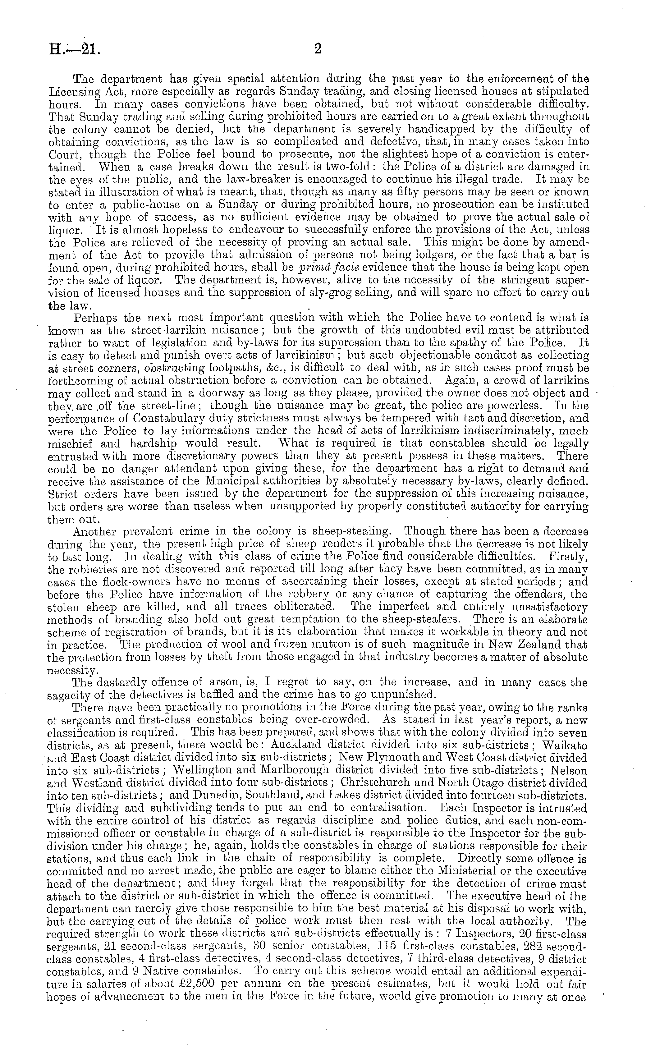 The department has given special attention during the past year to the enforcement of the Licensing Act, more especially as regards Sunday trading, and closing licensed houses at stipulated hours. In many cases convictions have been obtained, but not without considerable difficulty. That Sunday trading and selling during prohibited hours are carried on to a great extent throughout the colony cannot be denied, but the department is severely handicapped by the difficulty of obtaining convictions, as the law is so complicated and defective, that, in many cases taken into Court, though the Police feel bound to prosecute, not the slightest hope of a conviction is entertained. When a case breaks down the result is two-fold : the Police of a district are damaged in the eyes of the public, and the law-breaker is encouraged to continue his illegal trade. It may be stated in illustration of what is meant, that, though as many as fifty persons may be seen or known to enter a public-house on a Sunday or during prohibited hours, no prosecution can be instituted with any hope of success, as no sufficient evidence may be obtained, to prove the actual sale of liquor. It is almost hopeless to endeavour to successfully enforce the provisions of the Act, unless the Police aie relieved of the necessity of proving an actual sale. This might be done by amendment of the Act to provide that admission of persons not being lodgers, or the fact that a bar is found open, during prohibited hours, shall be primd facie evidence that the house is being kept open for the sale of liquor. The department is, however, alive to the necessity of the stringent supervision of licensed houses and the suppression of sly-grog selling, and will spare no effort to carry out the law. Perhaps the next most important question with which the Police have to contend is what is known as the street-larrikin nuisance; but the growth of this undoubted evil must be attributed rather to want of legislation and by-laws for its suppression than to the apathy of the Police. It is easy to detect and punish overt acts of larrikinism; but such objectionable conduct as collecting at street corners, obstructing footpaths, &c, is difficult to deal with, as in such cases proof must be forthcoming of actual obstruction before a conviction can be obtained. Again, a crowd of larrikins may collect and stand in a doorway as long as they please, provided the owner does not object and they, are .off the street-line; though the nuisance may be great, the police are powerless. In the performance of Constabulary duty strictness must always be tempered with tact and discretion, and were the Police to lay informations under the head of acts of larrikinism indiscriminately, much mischief and hardship would result. What is required is that constables should be legally entrusted with more discretionary powers than they at present possess in these matters. There could be no danger attendant upon giving these, for the department has a right to demand and receive the assistance of the Municipal authorities by absolutely necessary by-laws, clearly denned. Strict orders have been issued by the department for the suppression of this increasing nuisance, but orders are worse than useless when unsupported by properly constituted authority for carrying them out. Another prevalent crime in the colony is sheep-stealing. Though there has been a decrease during the year, the present high price of sheep renders it probable that the decrease is not likely to last long. In dealing with this class of crime the Police find considerable difficulties. Firstly, the robberies are not discovered and reported till long after they have been committed, as in many cases the flock-owners have no means of ascertaining their losses, except at stated periods ; and before the Police have information of the robbery or any chance of capturing the offenders, the stolen sheep are killed, and all traces obliterated. The imperfect and entirely unsatisfactory methods of branding also hold out great temptation to the sheep-stealers. There is an elaborate scheme of registration of brands, but it is its elaboration that makes it workable in theory and not in practice. The production of wool and frozen mutton is of such magnitude in New Zealand that the protection from losses by theft from those engaged in that industry becomes a matter of absolute necessity. The dastardly offence of arson, is, I regret to say, on the increase, and in many cases the sagacity of the detectives is baffled and the crime has to go unpunished. There have been practically no promotions in the Force during the past year, owing to the ranks of sergeants and first-class constables being over-crowded. As stated in last year's report, a new classification is required. This has been prepared, and shows that with the colony divided into seven districts, as at present, there would be: Auckland district divided into six sub-districts ; Waikato and Bast Coast district divided into six sub-districts; Now Plymouth and West Coast district divided into six sub-districts; Wellington and Marlborough district divided into five sub-districts; Nelson and Westland district divided into four sub-districts ; Christchurch and North Otago district divided into ten sub-districts; and Dunedin, Southland, and Lakes district divided into fourteen sub-districts. This dividing and subdividing tends to put an end to centralisation. Each Inspector is intrusted with the entire control of his district as regards discipline and police duties, and each non-com-missioned officer or constable in charge of a sub-district is responsible to the Inspector for the subdivision under his charge; he, again, holds the constables in charge of stations responsible for their stations, and thus each link in the chain of responsibility is complete. Directly some offence is committed and no arrest made, the public are eager to blame either the Ministerial or the executive head of the d