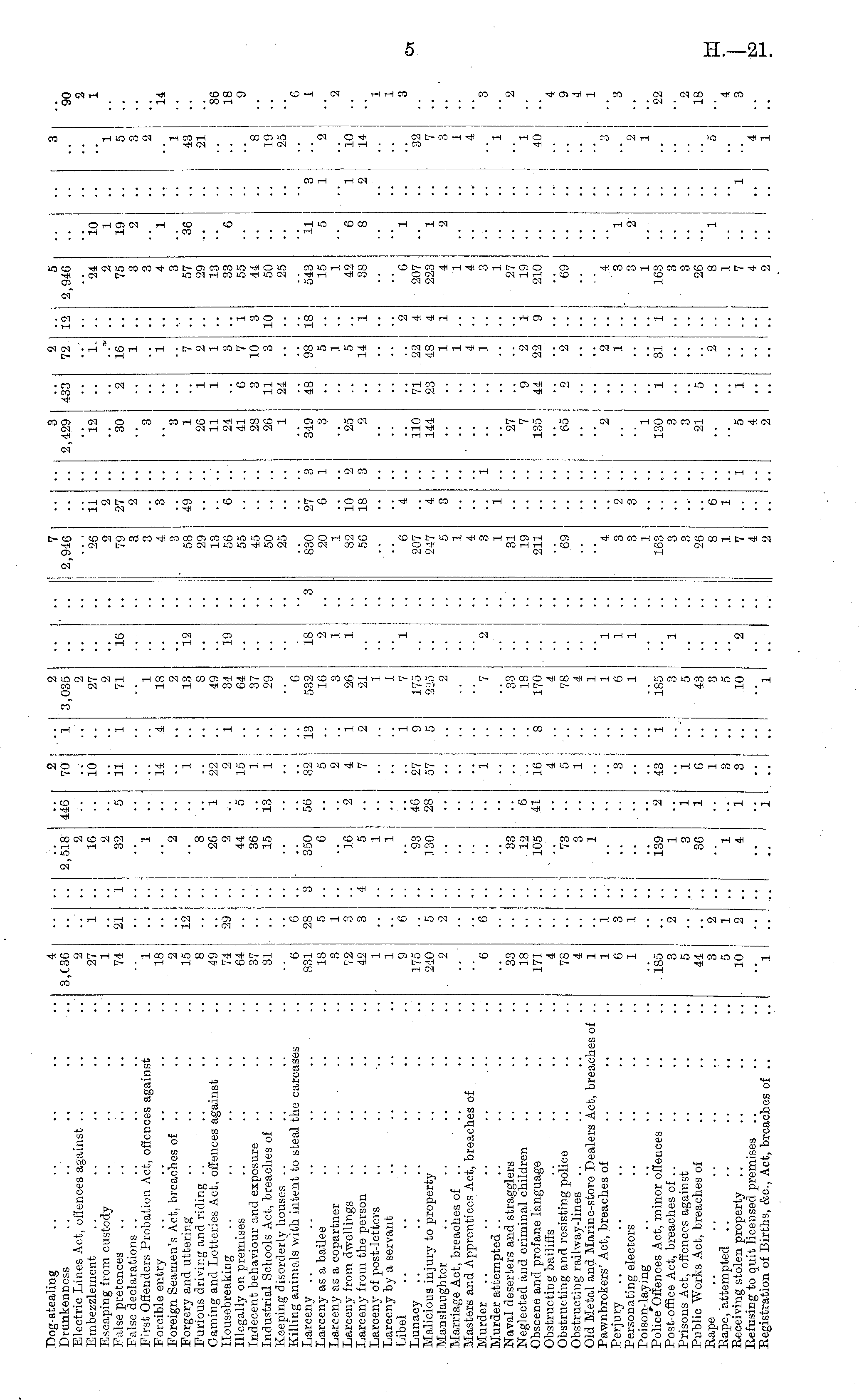 Dog-stealing Drunkenness Electric Lines Act, offences against .. Embezzlement TCscaping from custody .. False pretences False declarations .. First Offenders Probation Act, offences against Forcible entry Foreign Seamen's Act, breaches of .. Forgery and uttering Furious driving and riding Gaming and Lotteries Act, offences against .. Housebreaking Illegally on premises Indecent behaviour and exposure Industrial Schools Act, breaches of .. Keeping disorderly houses Killing animals with intent to steal the carcases Larceny Larceny as a bailee Larceny as a copartner .. Larceny from dwellings Larceny from the person Larceny of post-letters Larceny by a servant Libel Lunacy Malicious injury to property Manslaughter Marriage Act, breaohes of .. Masters and Apprentices Act, breaches of Murder Murder attempted Naval deserters and stragglers Neglected and criminal children Obscene and profane language Obstructing bailiffs Obstructing and resisting police Obstructing railway-lines Old Metal and Marine-store Dealers Act, breaches of .. Pawnbrokers' Act, breaches of Perjury Personating electors Poison-laying Police'Offences Act, minor offences Post-office Act, breaches of .. Prisons Act, offences against Public Works Act, breaohes of Rape Rape, attempted Receiving stolen property Refusing to quit licensed premises Registration of Births, &c, Act, breaches of .. 3,C36 2 27 1 74 1 2,518 2 16 2 32 446 70 1 2 3,035 2 27 2 71 7 2,946 3 2,429 433 2 72 12 5 2,946 3 y< 21 1 5 16 11 1 16 26 2 79 3 3 4 3 58 29 13 56 55 45 50 25 11 2 27 2 12 '30 2 1 i<3 1 24 2 75 3 3 4 3 57 29 13 33 55 44 50 25 10 1 19 2 1 5 3 2 1 18 2 15 8 49 74 64 37 31 1 1 18 2 13 8 49 34 64 37 29 "3 "2 14 4 3 1 1 i< 12 29 "a 26 2 44 36 15 1 5 1 22 2 15 1 1 1 12 19 49 6 3 1 26 11 24 41 28 26 1 1 6 3 11 24 7 2 1 3 7 10 3 '36 6 1 43 21 31 11 13 1 3 10 8 19 25 6 831 18 3 72 42 1 1 9 175 240 2 6 23 5 1 3 3 *3 350 6 56 82 5 2 4 7 13 6 532 16 3 26 21 1 1 7 175 225 o 18 2 1 1 "3 830 20 1 82 56 27 6 3 1 349 3 48 98 5 1 5 14 is 543 15 1 42 38 11 5 3 1 "2 4 16 5 1 1 2 1 2 10 18 2 3 '25 2 1 6 8 1 2 'io 14 ' G 93 130 46 28 1 9 5 1 6 207 247 5 1 4 3 1 31 19 211 4 2 4 4 1 6 207 223 4 1 4 3 1 27 19 210 1 ■5 2 27 57 4 3 iio 144 71 23 22 48 1 1 4 1 1 2 32 7 3 1 4 6 G 1 7 2 1 33 12 105 1 "l 33 18 171 4 78 4 1 1 6 1 73 3 1 6 41 16 4 5 1 's 33 IS 170 4 78 4 1 1 6 1 '69 27 7 135 65 '9 44 2 2 22 2 l9 69 ' 1 40 1 3 1 3 1 1 1 4 3 3 1 1G3 3 3 26 8 1 7 4 2 2 3 "2 2 1 4 3 3 1 163 3 3 26 8 1 7 4 2 1 2 "3 1 130 3 3 21 "2 1 .185 3 5 44 3 5 10 139 1 3 36 2 43 1 185 3 5 43 3 5 10 1 31 1 *2! 2 1 1 1 2 1 2 1 4 1 6 1 3 3 6 1 5 2 1 5 1! 'i 2 1 5 4 2 1 1 4 1 1 1 1