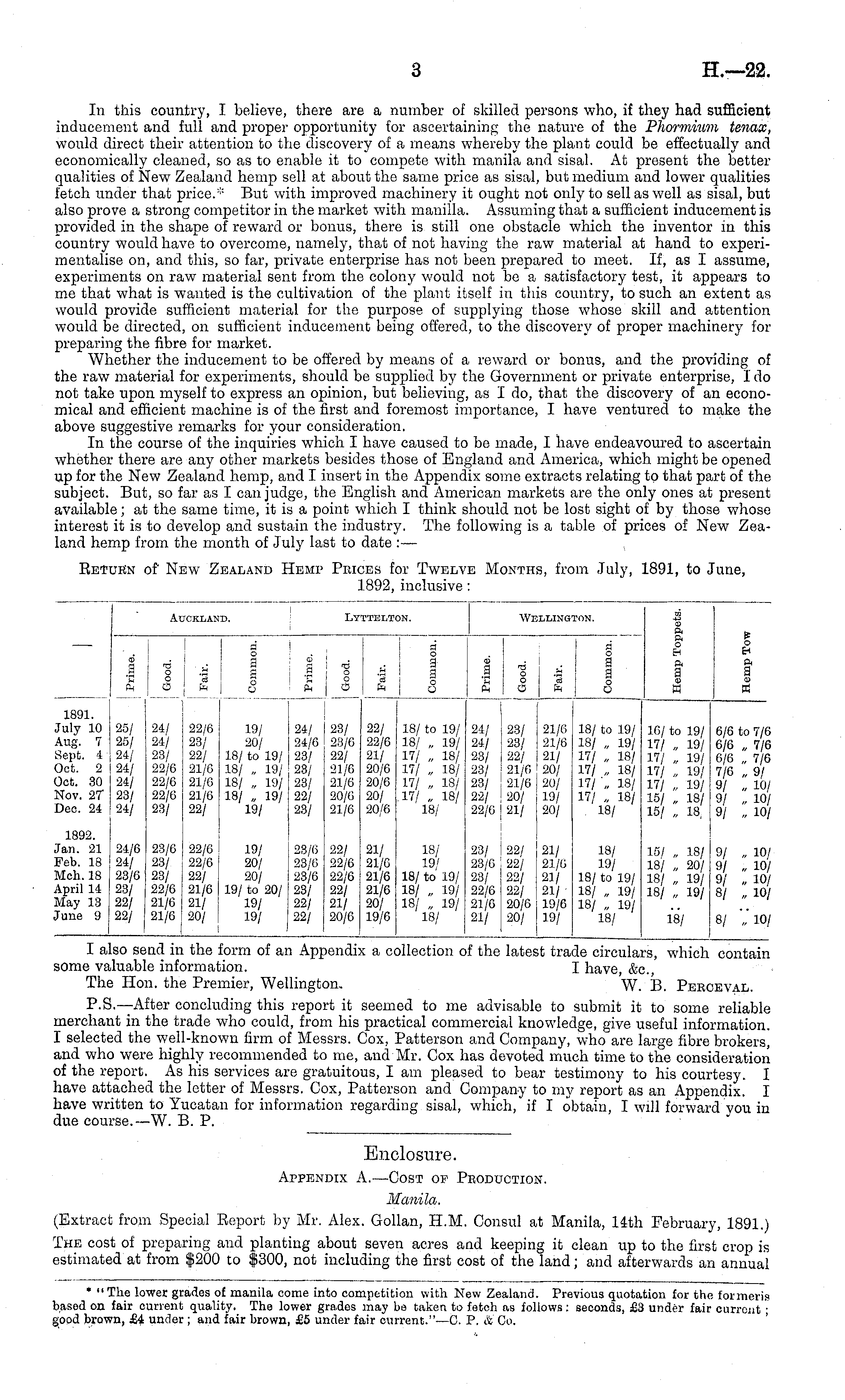 I also send in the form of an Appendix a collection of the latest trade circulars, which contain some valuable information. I have, &c. The Hon. the Premier, Wellington. W. B. Pebceval. P.S.—After concluding this report it seemed to me advisable to submit it to some reliable merchant in the trade who could, from his practical commercial knowledge, give useful information. I selected the well-known firm of Messrs. Cox, Patterson and Company, who are large fibre brokers, and who were highly recommended to me, and Mr. Cox has devoted much time to the consideration of the report. As his services are gratuitous, lam pleased to bear testimony to his courtesy. I have attached the letter of Messrs. Cox, Patterson and Company to my report as an Appendix. I have written to Yucatan for information regarding sisal, which, if I obtain, I will forward you in due course.—W. B. P.