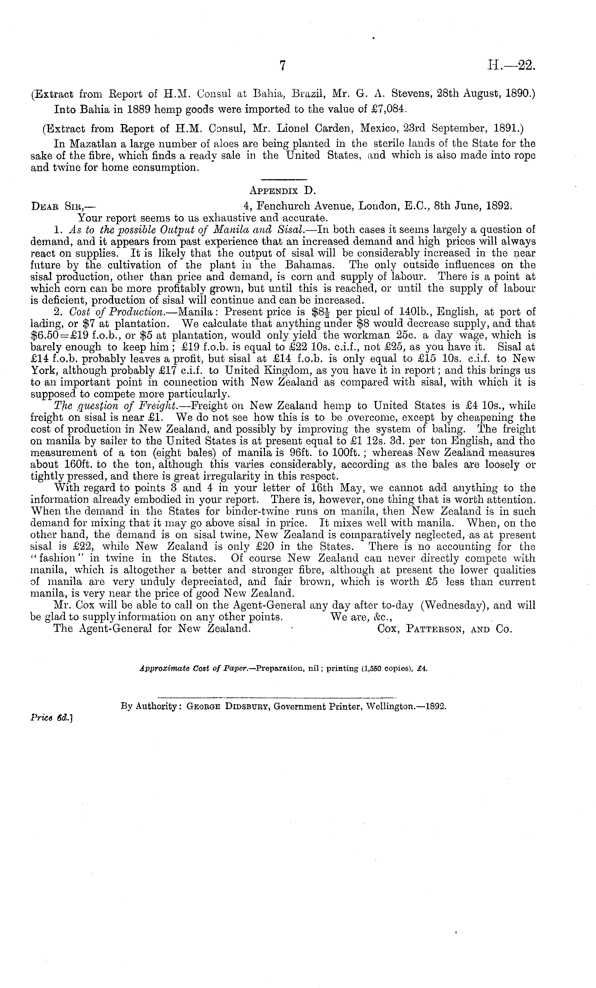 Appendix D. Deab Sib, — 4, Fenchurch Avenue, London, E.C., Bth June, 1892. Your report seems to us exhaustive and accurate. 1. As to the possible Output of Manila and Sisal. —In both cases it seems largely a question of demand, and it appears from past experience that an increased demand and high prices will always react on supplies. It is likely that the output of sisal will be considerably increased in the near future by the cultivation of the plant in the Bahamas. The only outside influences on the sisal production, other than price and demand, is corn and supply of labour. There is a point at which corn can be more profitably grown, but until this is reached, or until the supply of labour is deficient, production of sisal will continue and can be increased. 2. Cost of Production. —Manila: Present price is $8J per picul of 1401b., English, at port of lading, or $7 at plantation. We calculate that anything under $8 would decrease supply, and that $6.50 = £19 f.0.b., or $5 at plantation, would only yield the workman 25c. a day wage, which is barely enough to keep him ; £19 f.o.b. is equal to £22 10s. c.i.f., not £25, as you have it. Sisal at £14 f.o.b. probably leaves a profit, but sisal at £14 f.o.b. is only equal to £15 10s. c.i.f. to New York, although probably £17 c.i.f. to United Kingdom, as you have it in report; and this brings us to an important point in connection with New Zealand as compared with sisal, with which it is supposed to compete more particularly. The .question of Freight. —Freight on New Zealand hemp to United States is £4 10s., while freight on sisal is near £1. We do not see how this is to be .overcome, except by cheapening the cost of production in New Zealand, and possibly by improving the system of baling. The freight on manila by sailer to the "United States is at present equal to £1 12s. 3d. per ton English, and the measurement of a ton (eight bales) of manila is 96ft. to 100 ft.; whereas New Zealand measures about 160 ft. to the ton, although this varies considerably, according as the bales are loosely or tightly pressed, and there is great irregularity in this respect. With regard to points 3 and 4 in your letter of 16th May, we cannot add anything to the information already embodied in your report. There is, however, one thing that is worth attention. When the demand in the States for binder-twine runs on manila, then New Zealand is in such demand for mixing that it may go above sisal in price. It mixes well with manila. When, on the other hand, the demand is on sisal twine, New Zealand is comparatively neglected, as at present sisal is £22, while New Zealand is only £20 in the States. There is no accounting for the "fashion" in twine in the States. Of course New Zealand can never directly compete with manila, which is altogether a better and stronger fibre, although at present the lower qualities of manila are very unduly depreciated, and fair brown, which is worth £5 less than current manila, is very near the price of good New Zealand. Mr. Cox will be able to call on the Agent-General any day after to-day (Wednesday), and will be glad to supply information on any other points. We are, &c, The Agent-General for New Zealand. Cox, Patterson, and Co.