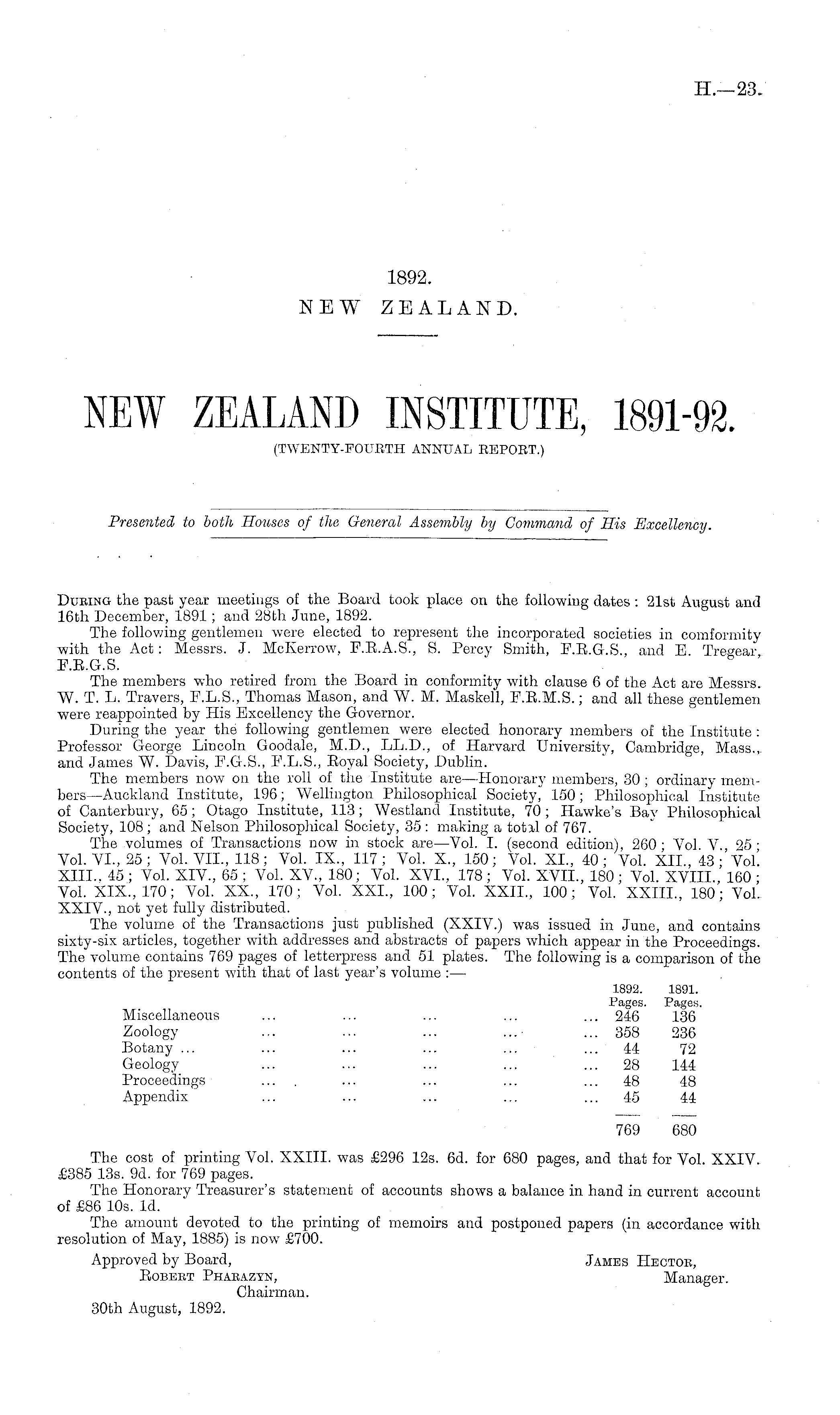NEW ZEALAND INSTITUTE, 1891-92. (TWENTY-FOURTH ANNUAL REPORT.)