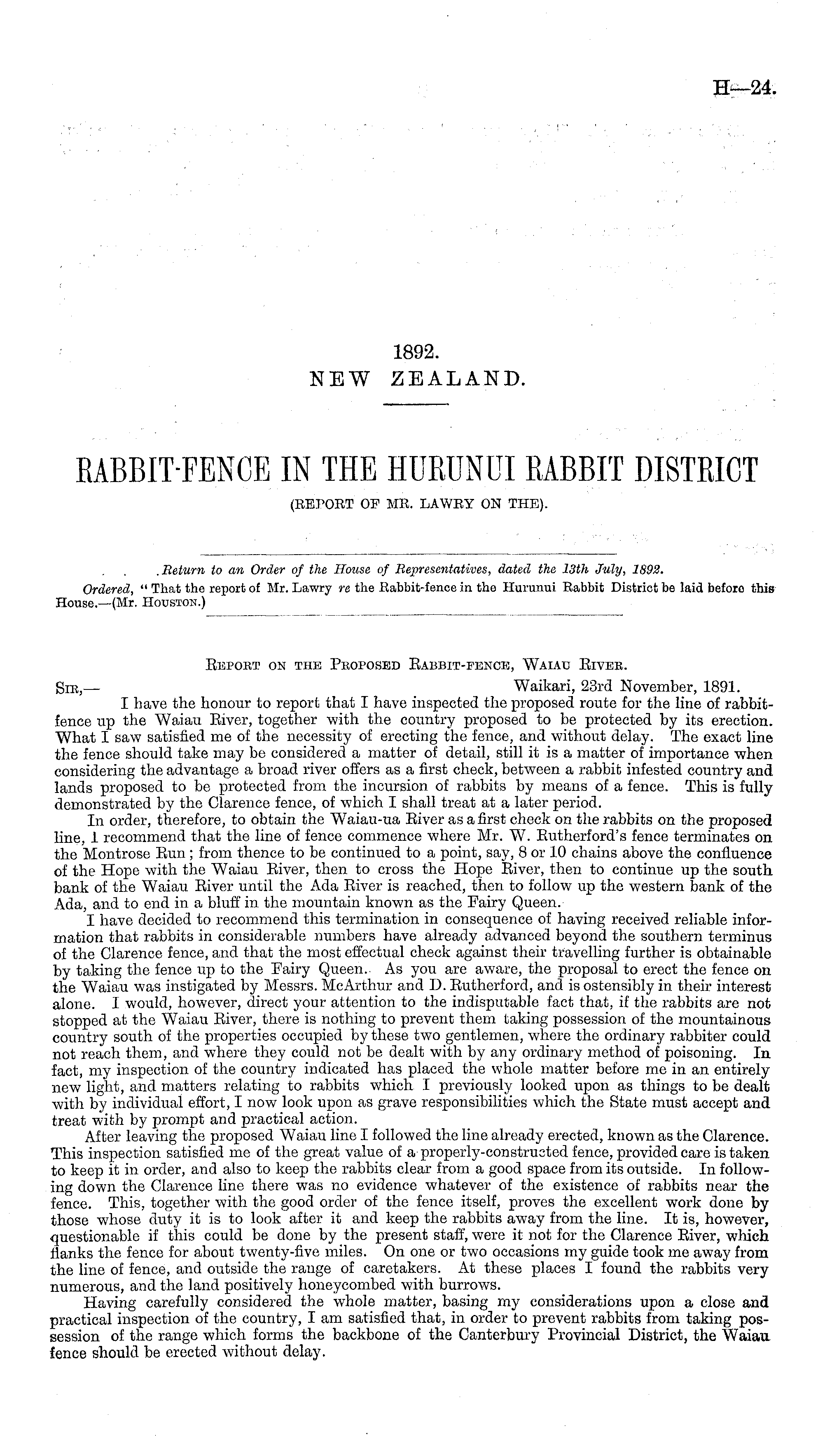 .Return to an Order of the House of Representatives, dated the 13th July, 1892. Ordered, " That the report of Mr. Lawry re. the Rabbit-fence in the Hurunui Eabbit District be laid before this House.—(Mr. Houston.)