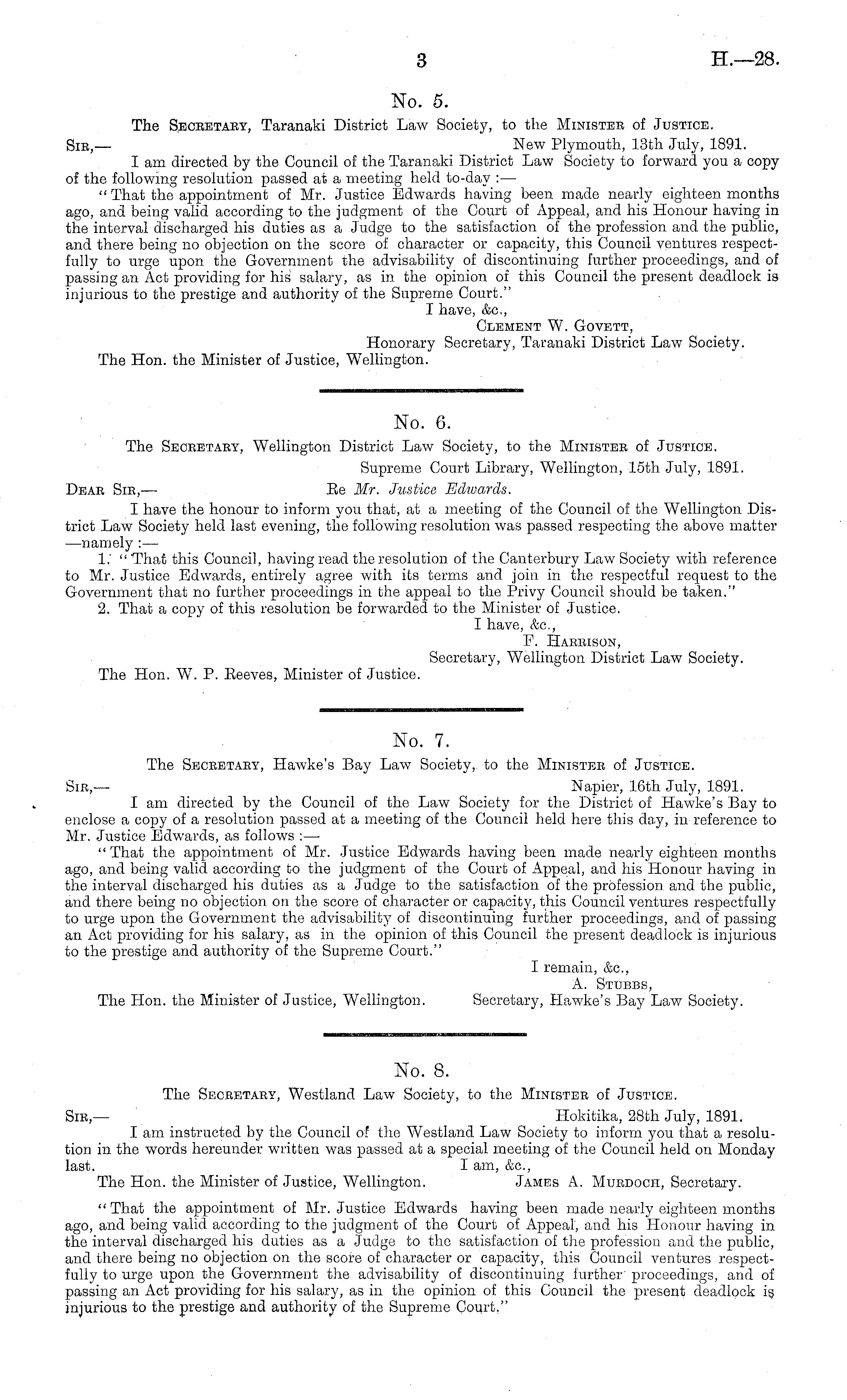No. 5. The Secretary, Taranaki District Law Society, to the Minister of Justice. Sir,— New Plymouth, 13th July, 1891. I am directed by the Council of the Taranaki District Law Society to forward you a copy of the following resolution passed at a meeting held to-day : — " That the appointment of Mr. Justice Edwards having been made nearly eighteen months ago, and being valid according to the judgment of the Court of Appeal, and his Honour having in the interval discharged his duties as a Judge to the satisfaction of the profession and the public, and there being no objection on the score of character or capacity, this Council ventures respectfully to urge upon the Government the advisability of discontinuing further proceedings, and of passing an Act providing for his salary, as in the opinion of this Council the present deadlock is injurious to the prestige and authority of the Supreme Court." I have, &c, Clement W. Govett, Honorary Secretary, Taranaki District Law Society. The Hon. the Minister of Justice, Wellington.