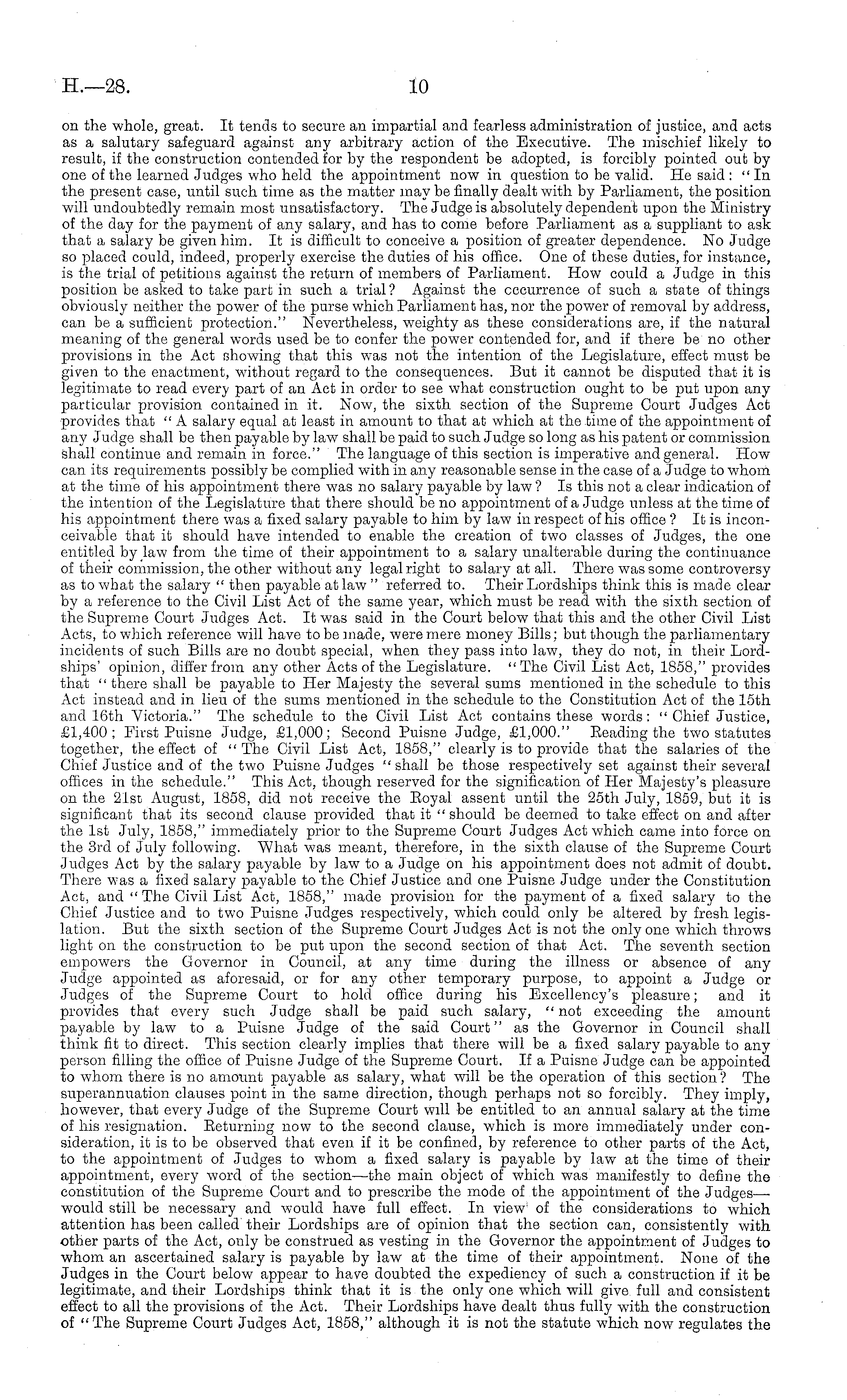 on the whole, great. It tends to secure an impartial and fearless administration of justice, and acts as a salutary safeguard against any arbitrary action of the Executive. The mischief likely to result, if the construction contended for by the respondent be adopted, is forcibly pointed out by one of the learned Judges who held the appointment now in question to be valid. He said : "In the present case, until such time as the matter may be finally dealt with by Parliament, the position will undoubtedly remain most unsatisfactory. The Judge is absolutely dependent upon the Ministry of the day for the payment of any salary, and has to come before Parliament as a suppliant to ask that a salary be given him. It is difficult to conceive a position of greater dependence. No Judge so placed could, indeed, properly exercise the duties of his office. One of these duties, for instance, is the trial of petitions against the return of members of Parliament. How could a Judge in this position be asked to take part in such a trial? Against the occurrence of such a state of things obviously neither the power of the purse which Parliament has, nor the power of removal by address, can be a sufficient protection." Nevertheless, weighty as these considerations are, if the natural meaning of the general words used be to confer the power contended for, and if there bo no other provisions in the x\ct showing that this was not the intention of the Legislature, effect must be given to the enactment, without regard to the consequences. But it cannot be disputed that it is legitimate to read every part of an Act in order to see what construction ought to be put upon any particular provision contained in it. Now, the sixth section of the Supreme Court Judges Act provides that " A salary equal at least in amount to that at which at the time of the appointment of any Judge shall be then payable by law shall be paid to such Judge so long as his patent or commission shall continue and remain in force." The language of this section is imperative and general. How can its requirements possibly be complied with in any reasonable sense in the case of a Judge to whom at the time of his appointment there was no salary payable by law ? Is this not a clear indication of the intention of the Legislature that there should be no appointment of a Judge unless at the time of his appointment there was a fixed salary payable to him by law in respect of his office ? It is inconceivable that it should have intended to enable the creation of two classes of Judges, the one entitled by law from the time of their appointment to a salary unalterable during the continuance of their commission, the other without any legal right to salary at all. There was some controversy as to what the salary " then payable at law " referred to. Their Lordships think this is made clear by a reference to the Civil List Act of the same year, which must be read, with the sixth section of the Supreme Court Judges Act. It was said in the Court below that this and the other Civil List Acts, to which reference will have to be made, were mere money Bills; but though the parliamentary incidents of such Bills are no doubt special, when they pass into law, they do not, in their Lordships' opinion, differ from any other Acts of the Legislature. "The Civil List Act, 1858," provides that " there shall be payable to Her Majesty the several sums mentioned in the schedule to this Act instead and in lieu of the sums mentioned in the schedule to the Constitution Act of the 15th and 16th Victoria." The schedule to the Civil List Act contains these words : " Chief Justice, £1,400; First Puisne Judge, £1,000; Second Puisne Judge, £1,000." Beading the two statutes together, the effect of " The Civil List Act, 1858," clearly is to provide that the salaries of the Chief Justice and of the two Puisne Judges "shall be those respectively set against their several offices in the schedule." This Act, though reserved for the signification of Her Majesty's pleasure on the 21st August, 1858, did not receive the Eoyal assent until the 25th July, 1859, but it is significant that its second clause provided that it " should be deemed to take effect on and after the Ist July, 1858," immediately prior to the Supreme Court Judges Act which came into force on the 3rd of July following. What was meant, therefore, in the sixth clause of the Supreme Court Judges Act by the salary payable by law to a Judge on his appointment does not admit of doubt. There was a fixed salary payable to the Chief Justice and one Puisne Judge under the Constitution Act, and " The Civil List Act, 1858," made provision for the payment of a fixed salary to the Chief Justice and to two Puisne Judges respectively, which could only be altered by fresh legislation. But the sixth section of the Supreme Court Judges Act is not the only one which throws light on the construction to be put upon the second section of that Act. The seventh section empowers the Governor in Council, at any time during the illness or absence of any Judge appointed as aforesaid, or for any other temporary purpose, to appoint a Judge or Judges of the Supreme Court to hold office during his Excellency's pleasure; and it provides that every such Judge shall be paid such salary, " not exceeding the amount payable by law to a Puisne Judge of the said Court" as the Governor in Council shall think fit to direct. This section clearly implies that there will be a fixed salary payable to any person filling the office of Puisne Judge of the Supreme Court. If a Puisne Judge can be appointed to whom there is no amount payable as salary, what will be the operation of this section ? The superannuation clauses point in the same direction, though perhaps not so forcibly. They imply, however, that every Judge of the Supreme Court will be entitled to an annual salary at the time of his resignation. Eeturning now to the second clause, which is more immediately under consi