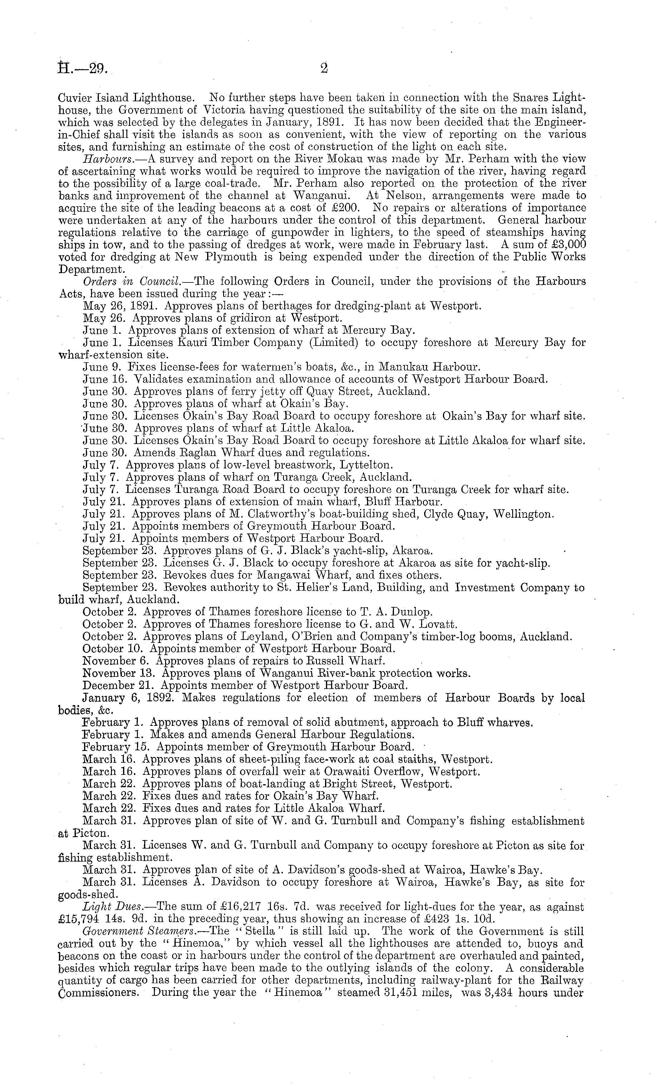 Cuvier Island Lighthouse. No further steps have been taken in connection with the Snares Lighthouse, the Government of Victoria having questioned the suitability of the site on the main island, which was selected by the delegates in January, 1891. It has now been decided that the Engineer - in-Chief shall visit the islands as soon as convenient, with the view of reporting on the various sites, and furnishing an estimate of the cost of construction of the light on each site. Harbours. —A survey and report on the River Mokau was made by Mr. Perham with the view of ascertaining what works would be required to improve the navigation of the river, having regard to the possibility of a large coal-trade. Mr. Perham also reported on the protection of the river banks and improvement of the channel at Wanganui. At Nelson, arrangements were made to acquire the site of the leading beacons at a cost of £200. No repairs or alterations of importance were undertaken at any of the harbours under the control of this department. General harbour regulations relative to the carriage of gunpowder in lighters, to the speed of steamships having ships in tow, and to the passing of dredges at work, were made in February last. A sum of £3,000 voted for dredging at New Plymouth is being expended under the direction of the Public Works Department. Orders in Council. —The following Orders in Council, under the provisions of the Harbours Acts, have been issued during the year : — May 26, 1891. Approves plans of berthages for dredging-plant at Westport. May 26. Approves plans of gridiron at Westport. June 1. Approves plans of extension of wharf at Mercury Bay. June 1. Licenses Kauri Timber Company (Limited) to occupy foreshore at Mercury Bay for wharf-extension site. June 9. Fixes license-fees for watermen's boats, &c, in Manukau Harbour. June 16. Validates examination and allowance of accounts of Westport Harbour Board. June 30. Approves plans of ferry jetty off Quay Street, Auckland. June 30. Approves plans of wharf at Okain's Bay. June 30. Licenses Okain's Bay Road Board to occupy foreshore at Okain's Bay for wharf site. Julie 30. Approves plans of wharf at Little Akaloa. June 30. Licenses Okain's Bay Road Board to occupy foreshore at Little Akaloa for wharf site. June 30. Amends Raglan Wharf dues and regulations. July 7. Approves plans of low-level breastwork, Lyttelton. July 7. Approves plans of wharf on Turanga Creek, Auckland. July 7. Licenses Turanga Road Board to occupy foreshore on Turanga Creek for wharf site. July 21. Approves plans of extension of main wharf, Bluff Harbour. July 21. Approves plans of M. Clatworthy's boat-building shed, Clyde Quay, Wellington. July 21. Appoints members of Greymouth Harbour Board. July 21. Appoints members of Westport Harbour Board. September 23. Approves plans of G. J. Black's yacht-slip, Akaroa. September 23. Licenses G. J. Black to occupy foreshore at Akaroa as site for yacht-slip. September 23. Revokes dues for Mangawai Wharf, and fixes others. September 23. Revokes authority to St. Helier's Land, Building, and Investment Company to build wharf, Auckland. October 2. Approves of Thames foreshore license to T. A. Dunlop. October 2. Approves of Thames foreshore license to G. and W. Lovatt. October 2. Approves plans of Leyland, O'Brien and Company's timber-log booms, Auckland. October 10. Appoints member of Westport Harbour Board. November 6. Approves plans of repairs to Russell Wharf. November 13. Approves plans of Wanganui River-bank protection works. December 21. Appoints member of Westport Harbour Board. January 6, 1892. Makes regulations for election of members of Harbour Boards by local bodies, &c. February 1. Approves plans of removal of solid abutment, approach to Bluff wharves. February 1. Makes and amends General Harbour Regulations. February 15. Appoints member of Greymouth Harbour Board. ■ March 16. Approves plans of sheet-piling face-work at coal staiths, Westport. March 16. Approves plans of overfall weir at Orawaiti Overflow, Westport. March 22. Approves plans of boat-landing at Bright Street, Westport. March 22. Fixes dues and rates for Okain's Bay Wharf. March 22. Fixes dues and rates for Little Akaloa Wharf. March 31. Approves plan of site of W. and G. Turnbull and Company's fishing establishment at Picton. March 31. Licenses W. and G. Turnbull and Company to occupy foreshore at Picton as site for fishing establishment. March 31. Approves plan of site of A. Davidson's goods-shed at Wairoa, Hawke'sßay. March 31. Licenses A. Davidson to occupy foreshore at Wairoa, Hawke's Bay, as site for goods-shed. Light Dues. —The sum of £16,217 16s. 7d. was received for light-dues for the year, as against £15,794 14s. 9d. in the preceding year, thus showing an increase of £423 Is. 10d. Government Steamers. —The " Stella " is still laid up. The work of the Government is still carried out by the " Hinemoa," by which vessel all the lighthouses are attended to, buoys and beacons on the coast or in harbours under the control of the department are overhauled and painted, besides which regular trips have been made to the outlying islands of the colony. A considerable quantity of cargo has been carried for other departments, including railway-plant for the Railway Commissioners. During the year the "Hinemoa" steamed 31,451 miles, was 3,434 hours under